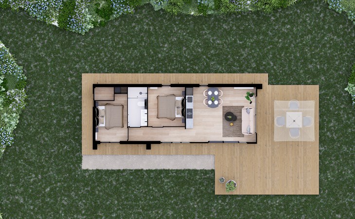 All our villas have two bedrooms, both with 2 single box springs and a flat screen TV in each room. Both bedrooms have ample storage options. On arrival we will have made the beds for you. The luxurious, spacious bathroom has a double sink, rain shower and toilet. From the living room you have access to the beautifully landscaped hardwood terrace and the adjacent lawn. Here you will find a comfortable dining table for 4 people and a parasol. And if you have your own boat, you can easily walk to the harbor and sail directly onto the Lower Rhine. Our villas are non-smoking, equipped with WiFi and indoor storage. You can park one car at the accommodation without any problems.