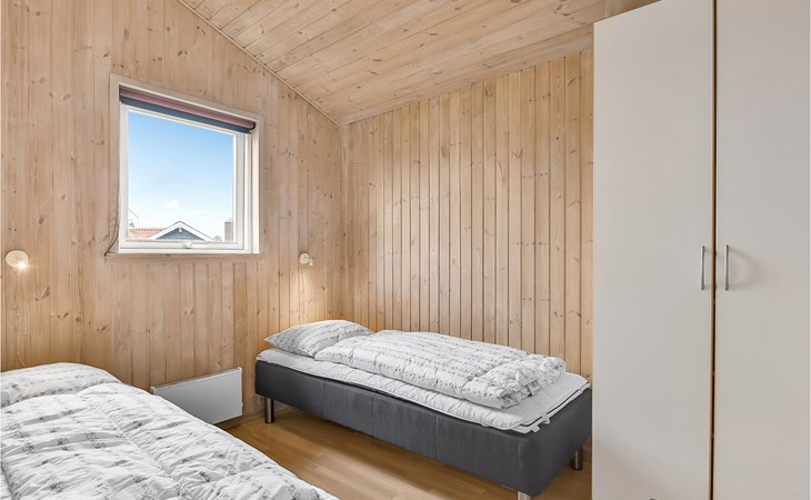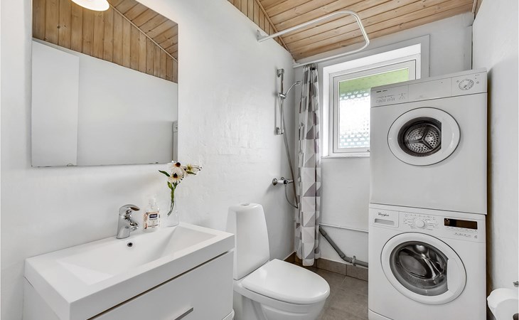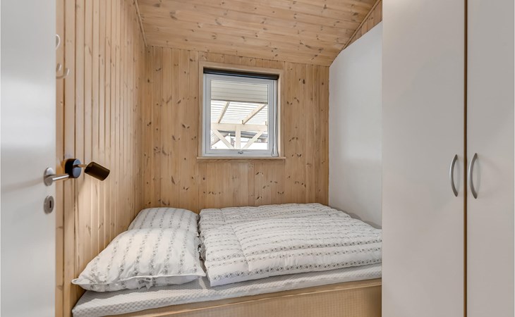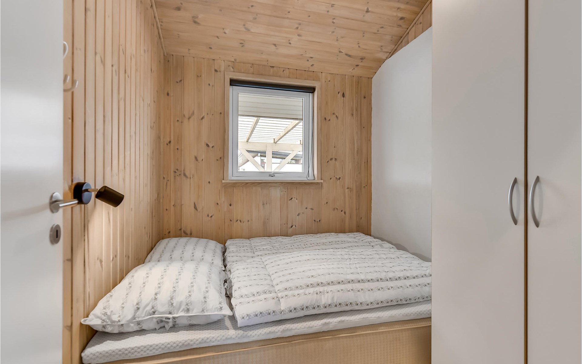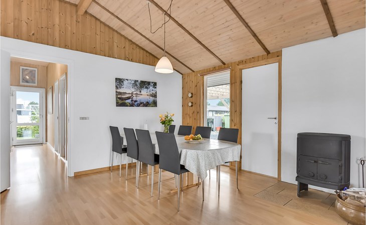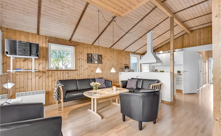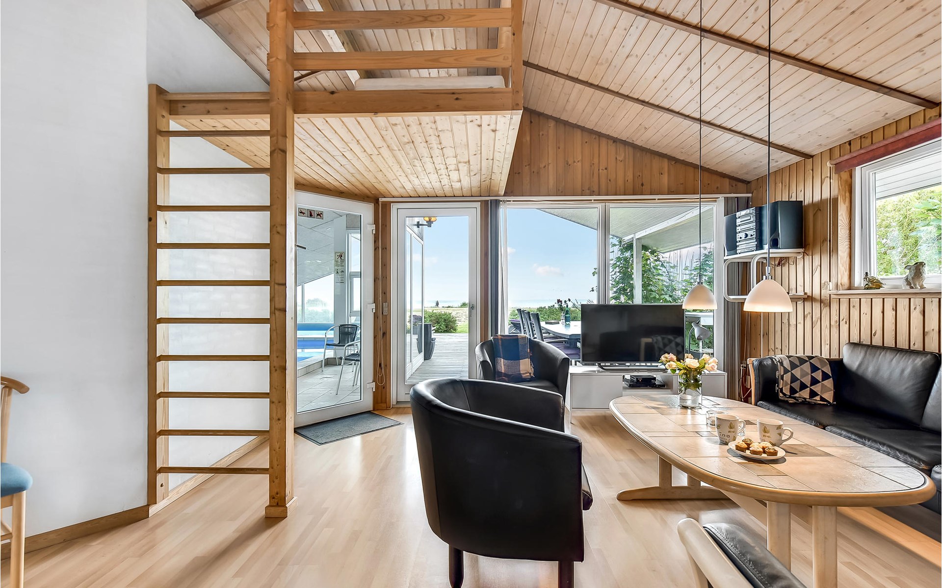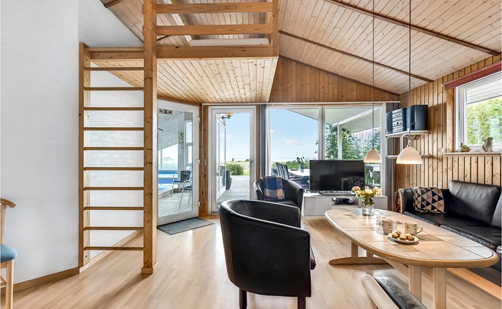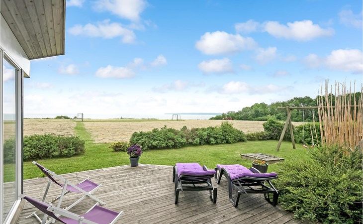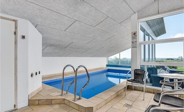 In the first row of Pøt Strand is this beautiful vacation home with a great panoramic view of the sea, both in the pool room and in the living room.