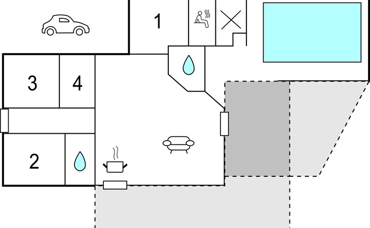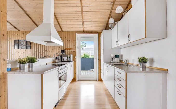 The kitchen and living area is light and bright with a sloping ceiling and is equipped with a cozy wood stove. The house has two nice bathrooms and a sauna. The pool invites for a wonderful swim, followed by relaxation in the sauna.