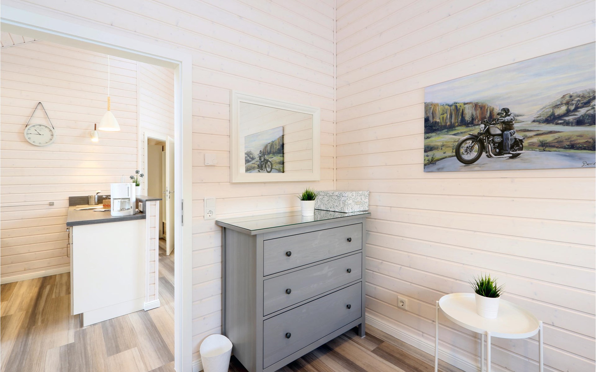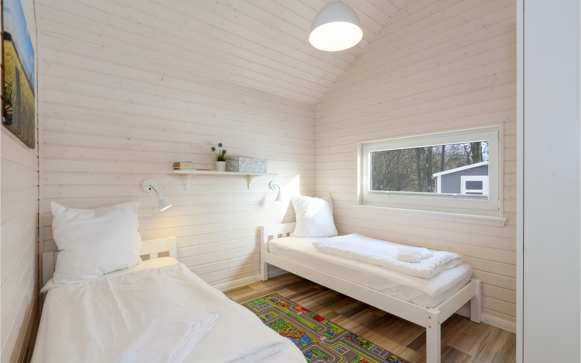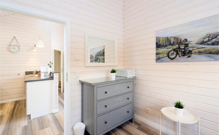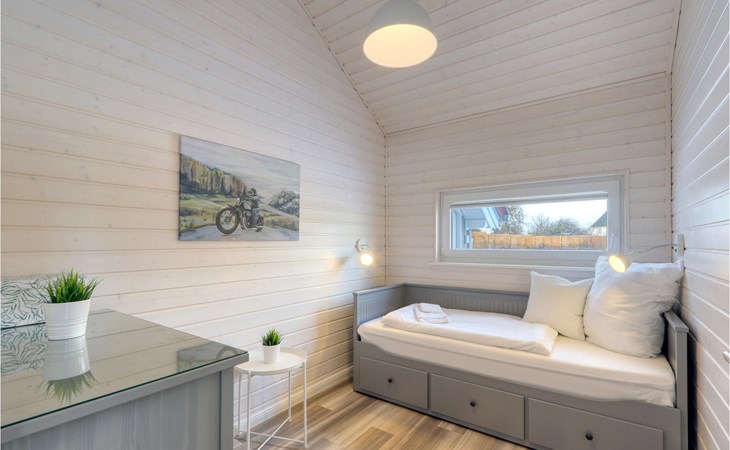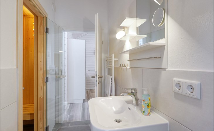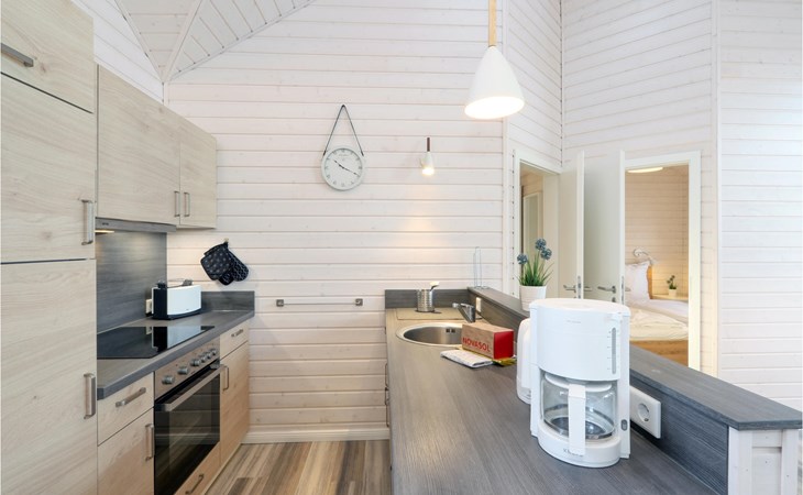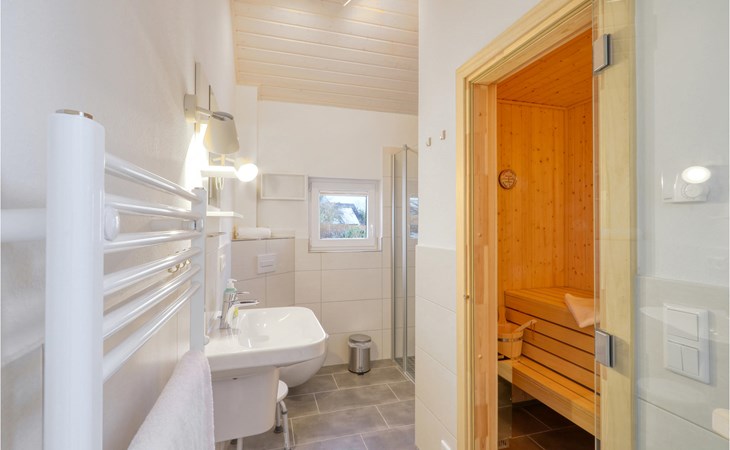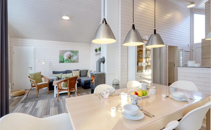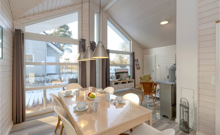 The modern wooden house impresses with its appealing Scandinavian style and offers enough space for 6 people. The in-house sauna invites you to relax. Cosy up together in the evening by the wood-burning stove, play a game, plan the next day's activities and listen to the crackling flames.