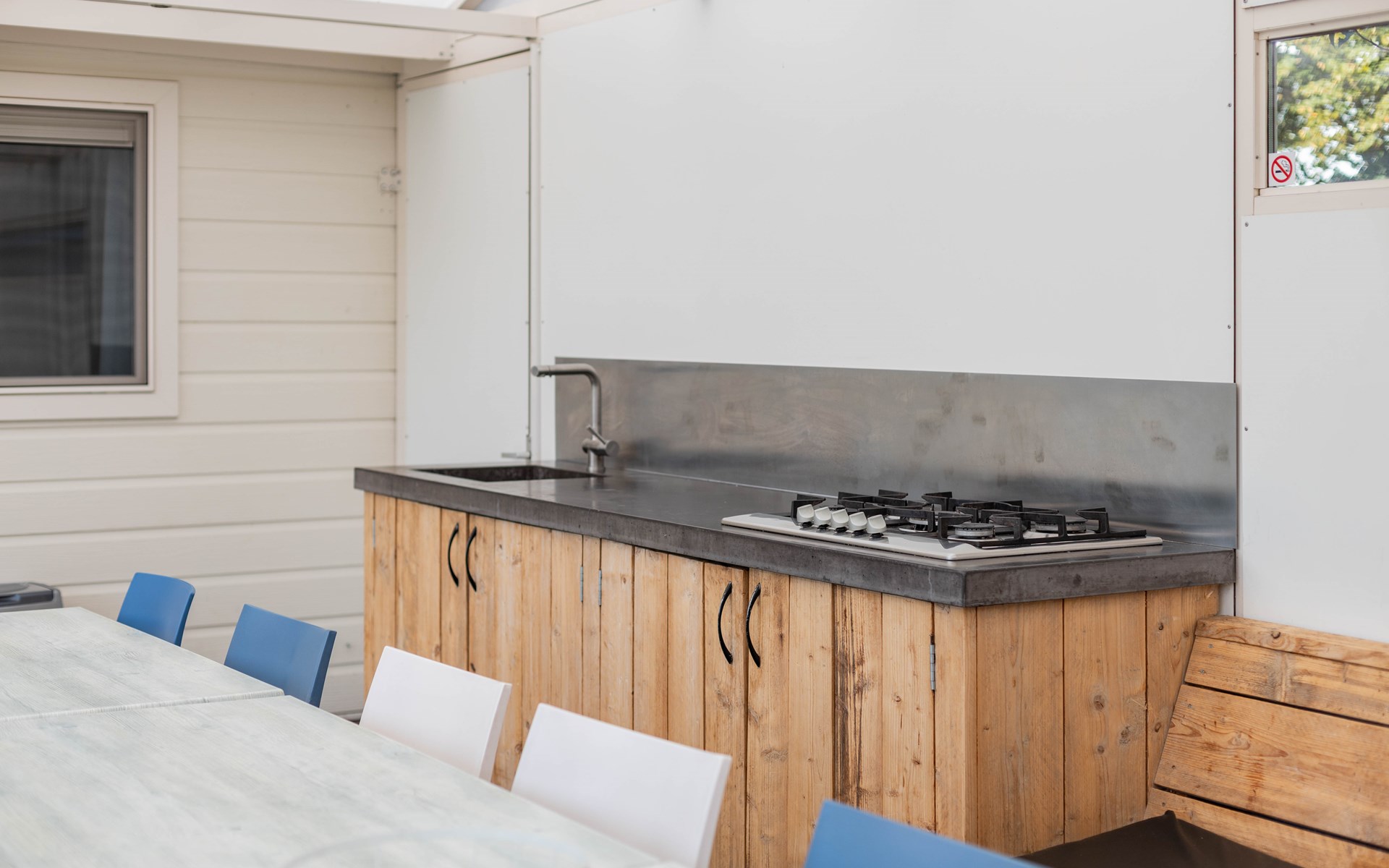 En een geweldige ruimte tussen 2 van de huisjes ,waar je samen kunt zitten en waar ook nog gekookt kan worden.