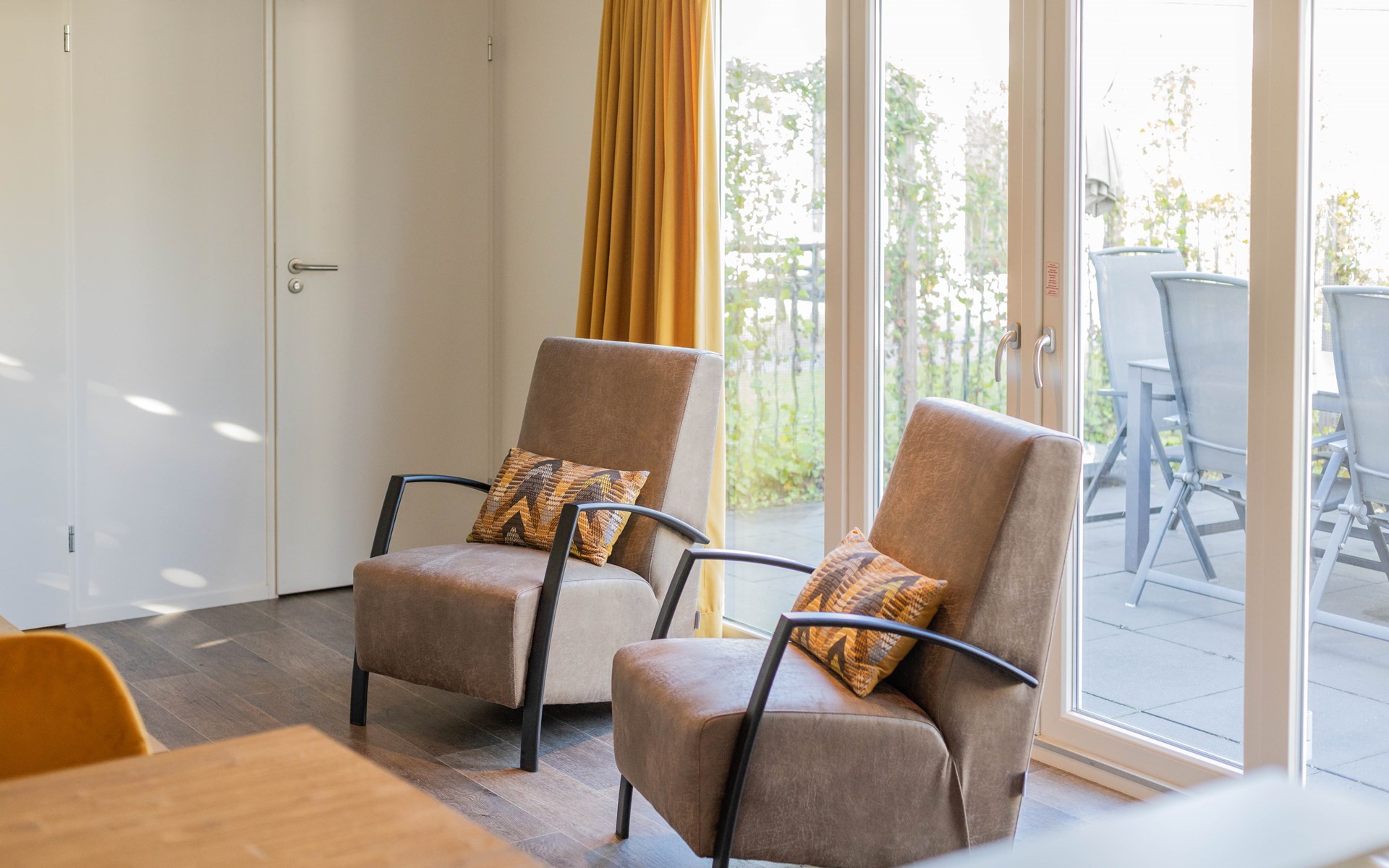 Bij minderen mooi weer is het goed toeven met de gehele groep in de woonkamer van het groepshuis.