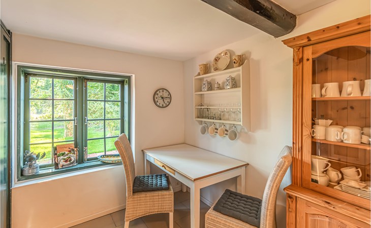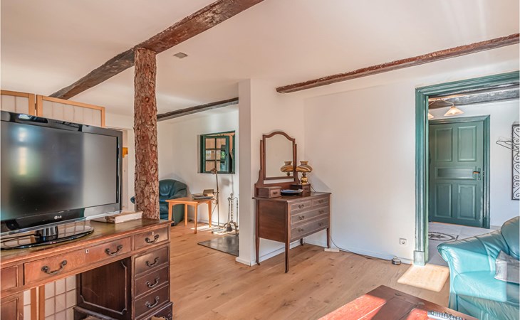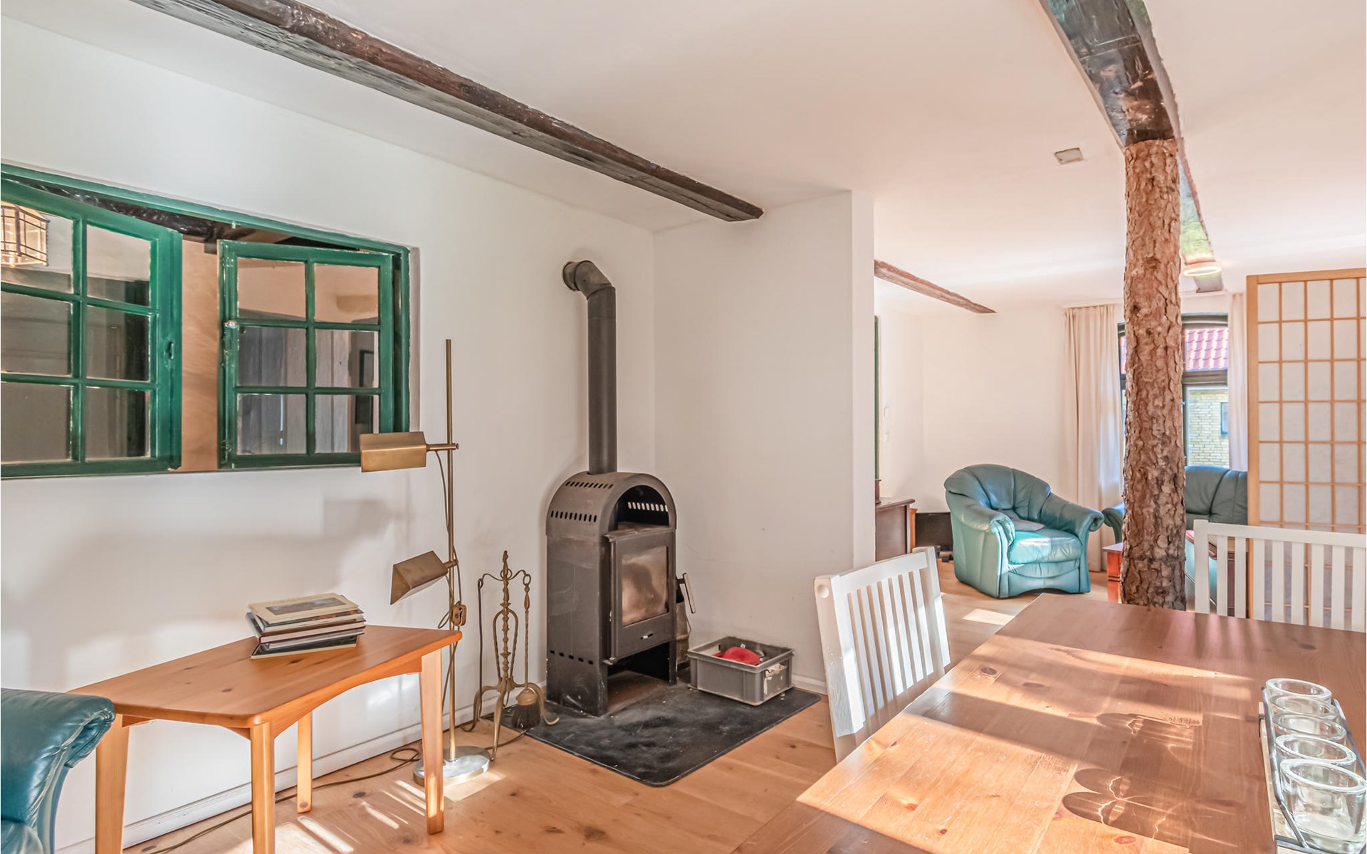The living area of the historic thatched-roof farmhouse has been lovingly renovated and modernised.