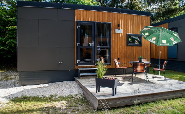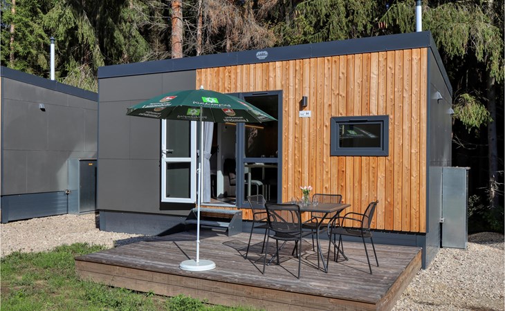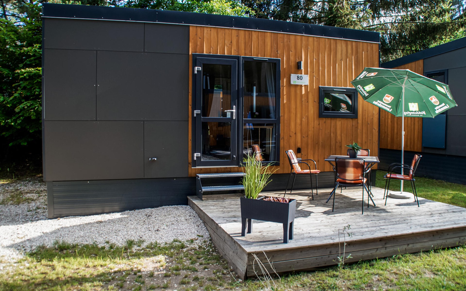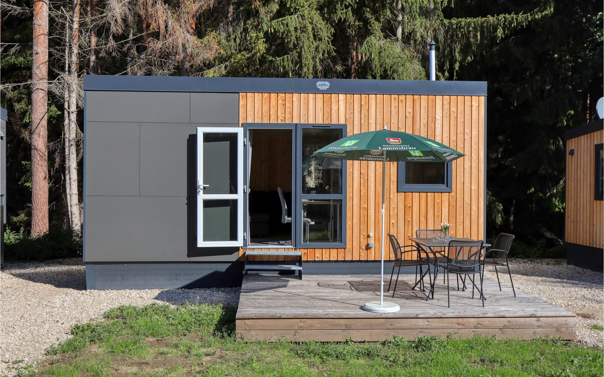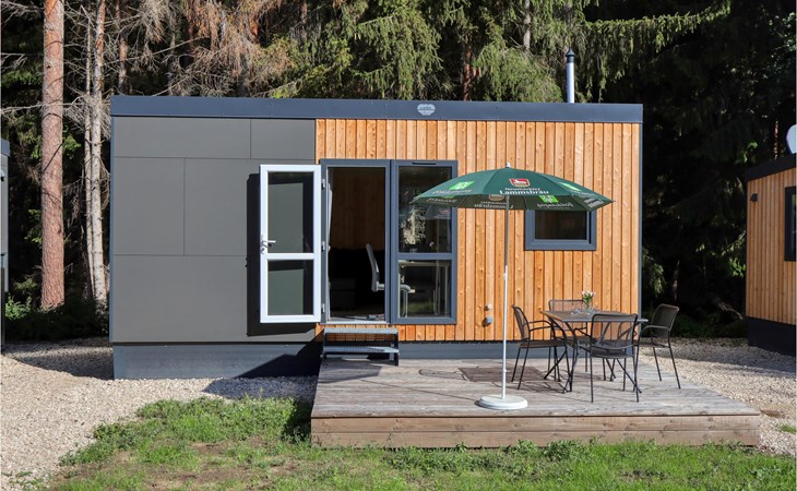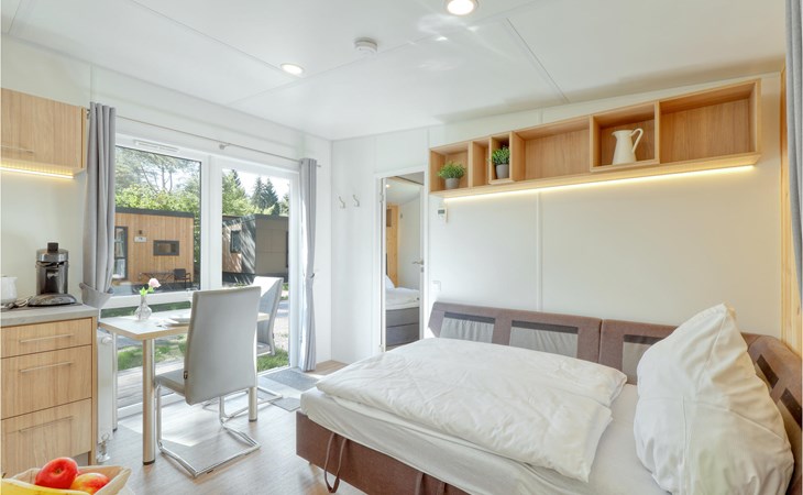 The cosy living area with sofa bed, dining area and well-equipped kitchenette invites you to spend time with the family. The separate bedroom is a wonderful place to dream. The sofa bed in the living area is 170 cm long and therefore only suitable for children. The Tiny House also has its own bathroom with shower.