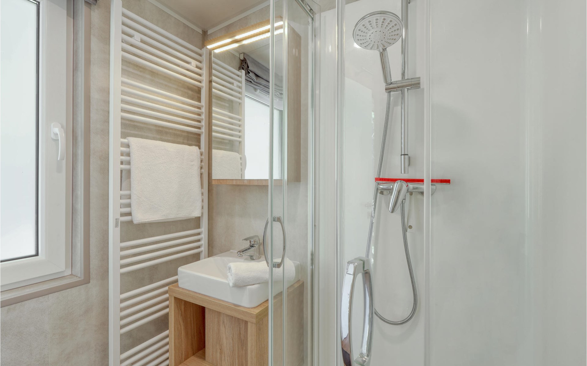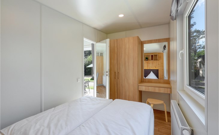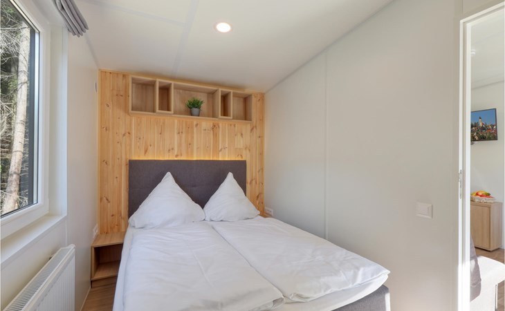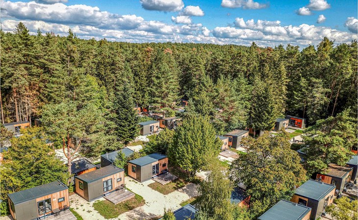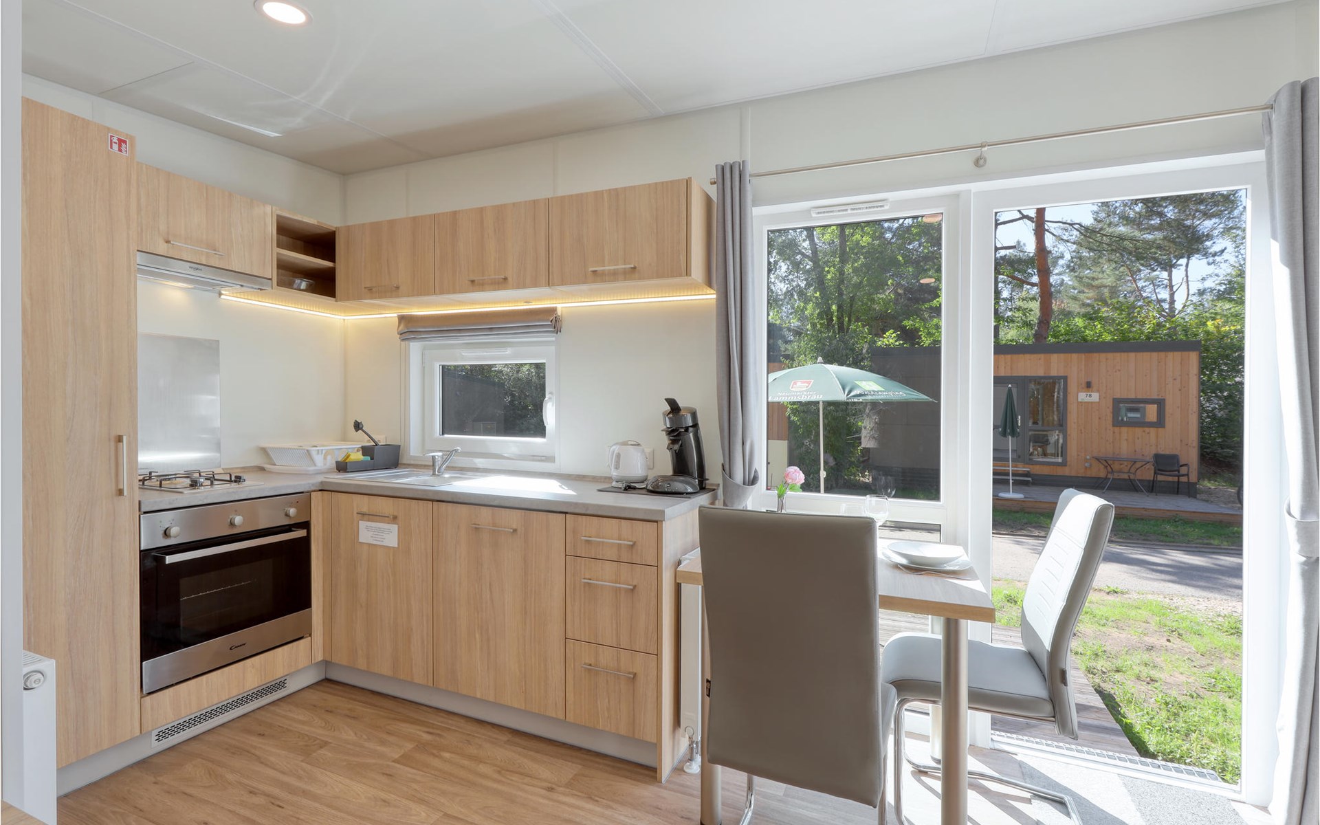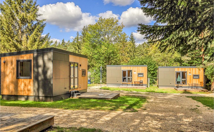 The cosy living area with sofa bed, dining area and well-equipped kitchenette invites you to spend time with the family. The separate bedroom is a wonderful place to dream. The sofa bed in the living area is 170 cm long and therefore only suitable for children. The Tiny House also has its own bathroom with shower.