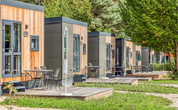 The cozy living area with sofa bed, dining area and well-equipped kitchenette invites you to spend time together with your family. In the separate bedroom it is wonderful to dream. The sofa bed in the living area is 170 cm long and therefore only suitable for children. In addition, the Tiny House has its own bathroom with shower.