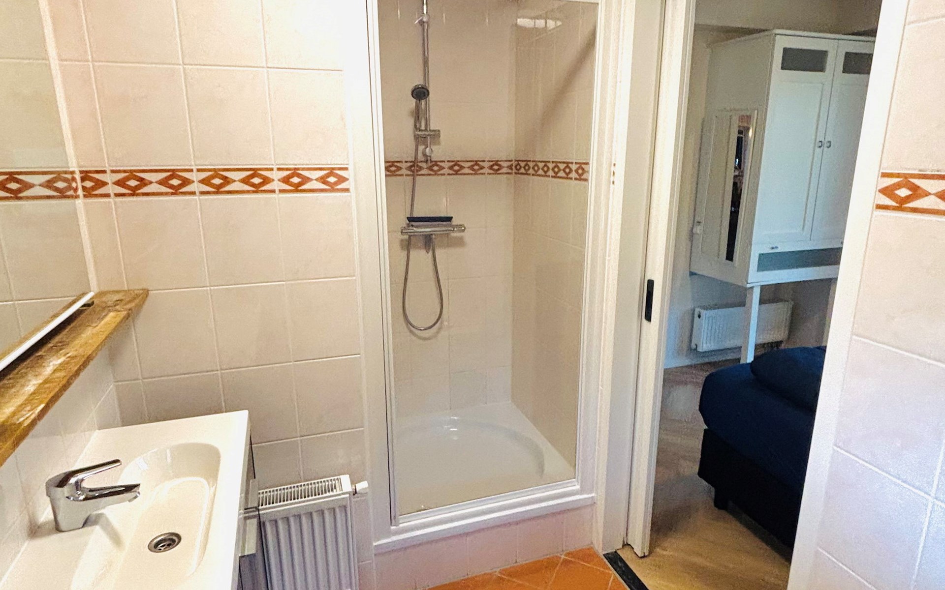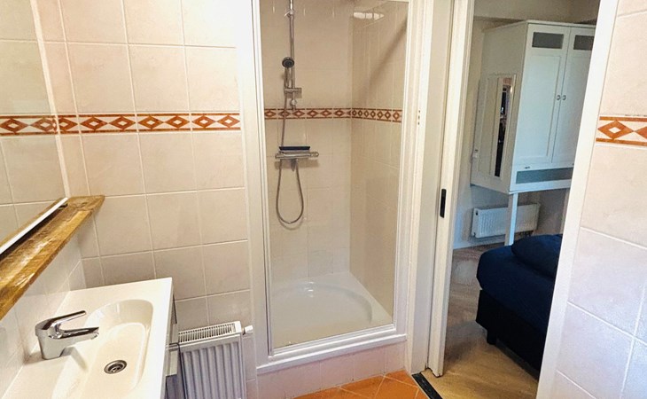 On the ground floor there is one bedroom with two single beds and an en-suite bathroom with a shower and a washbasin. There is also a separate toilet.