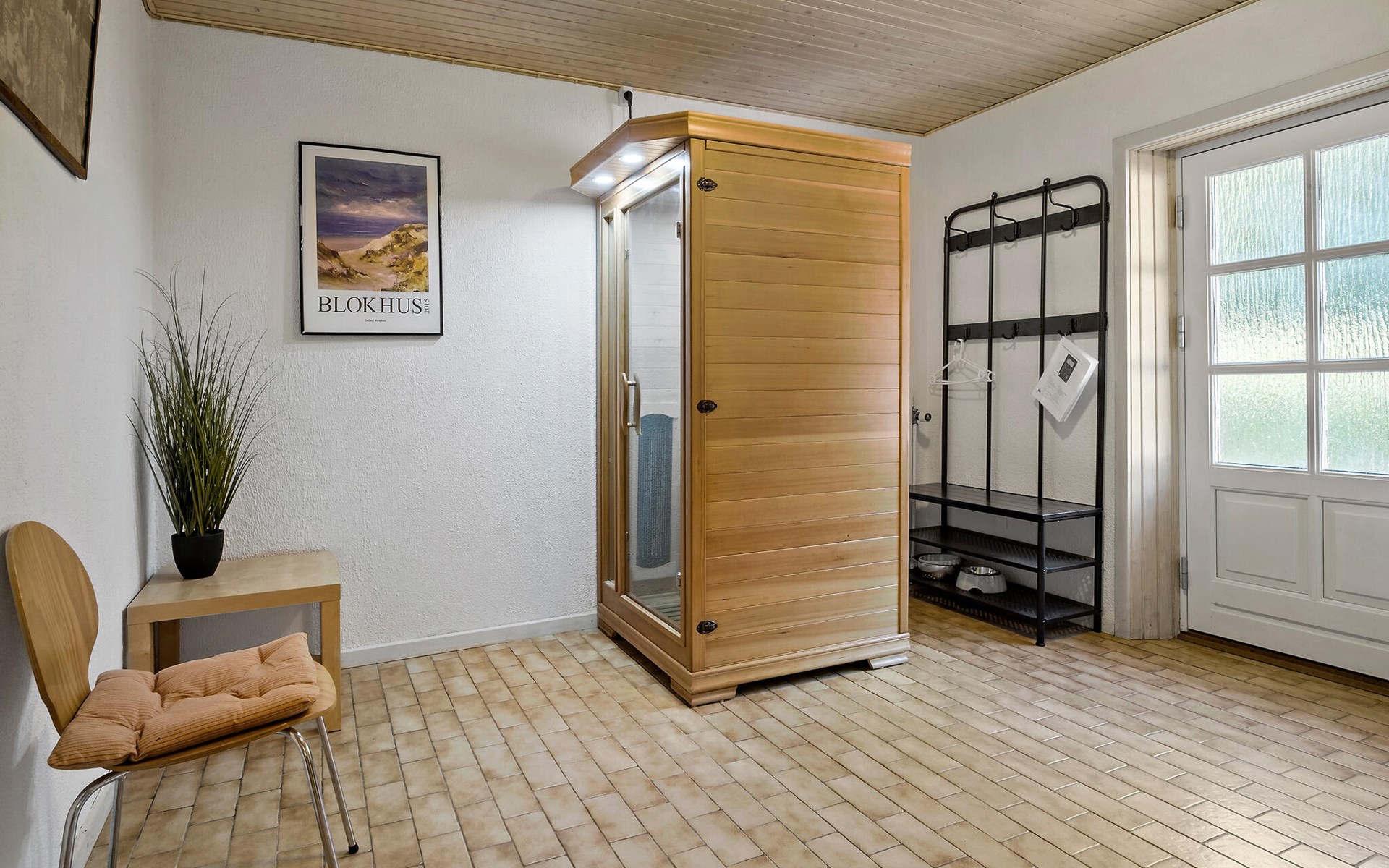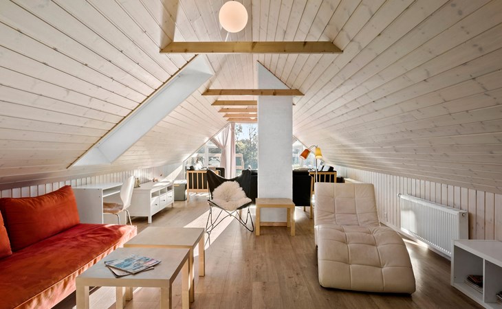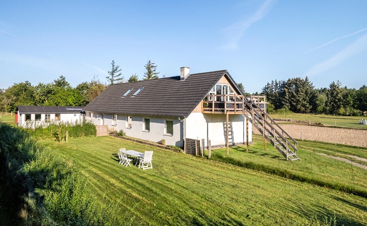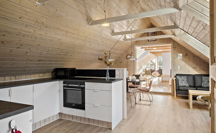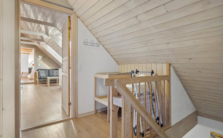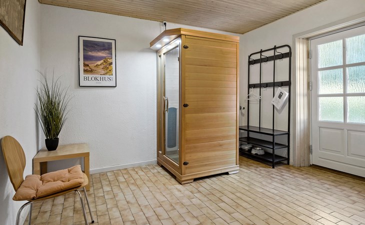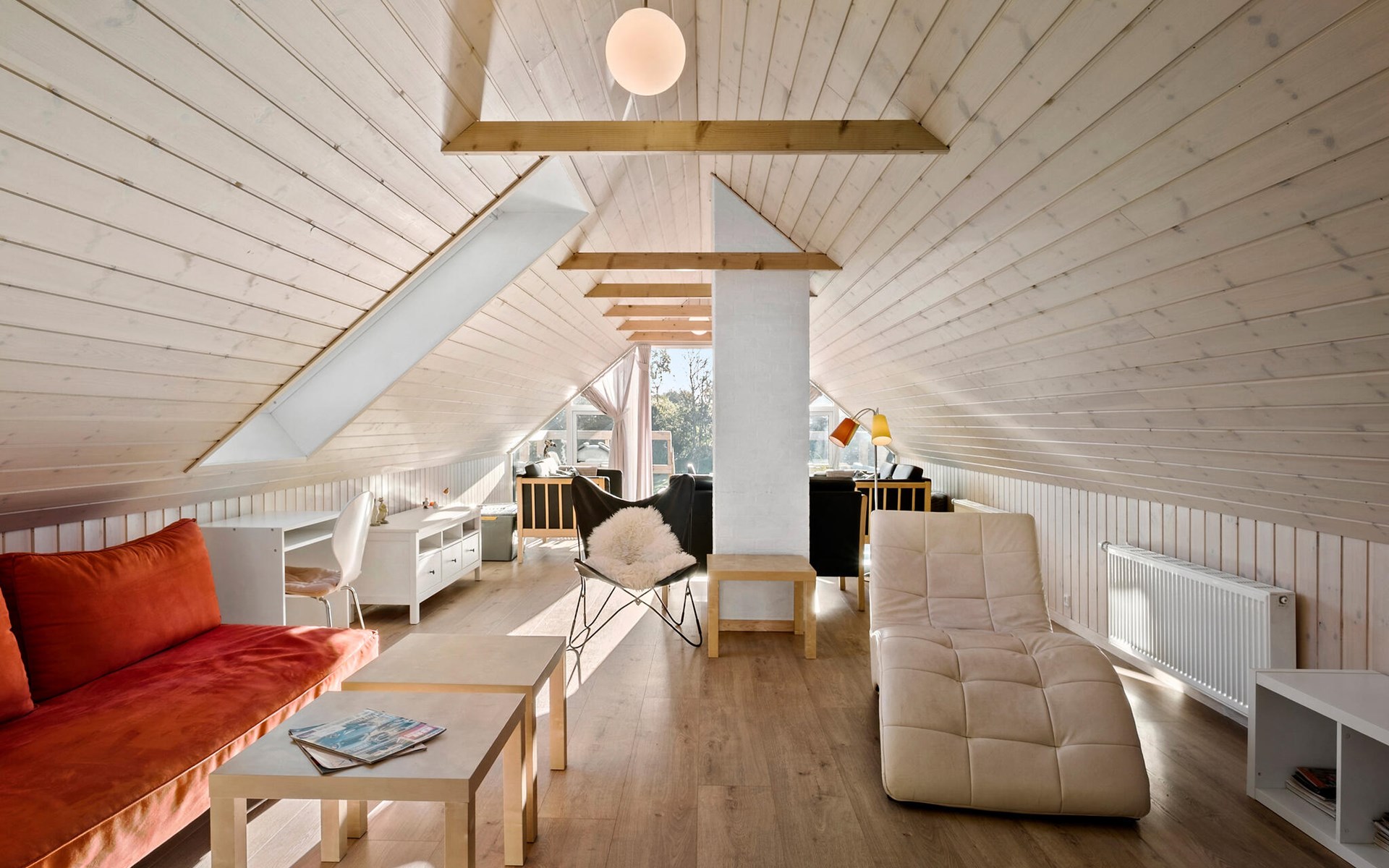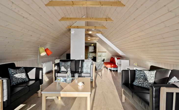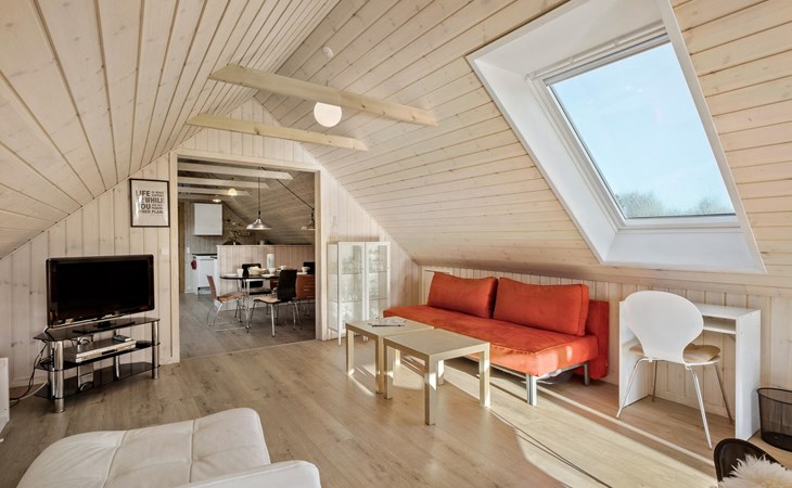 Spend a relaxing holiday in the bright apartment, which welcomes you above a farmhouse in a quiet, rural setting just a few kilometres from Blokhus beach. Enjoy the beautiful view outside as soon as you wake up and let your gaze wander over the surroundings through the gable window after an active day on the inviting sofas. Use the cosily furnished accommodation as a base for wonderful days at the beach and exploring the surrounding area. The infrared sauna and massage table offer great opportunities for soothing relaxation.