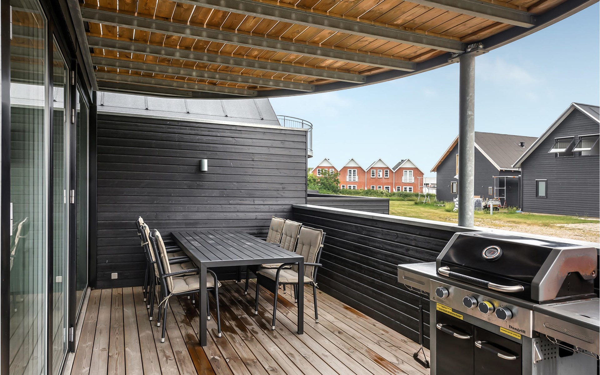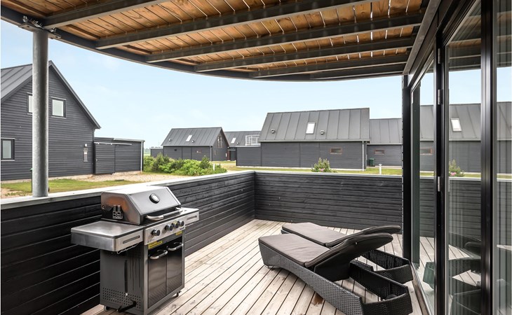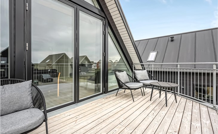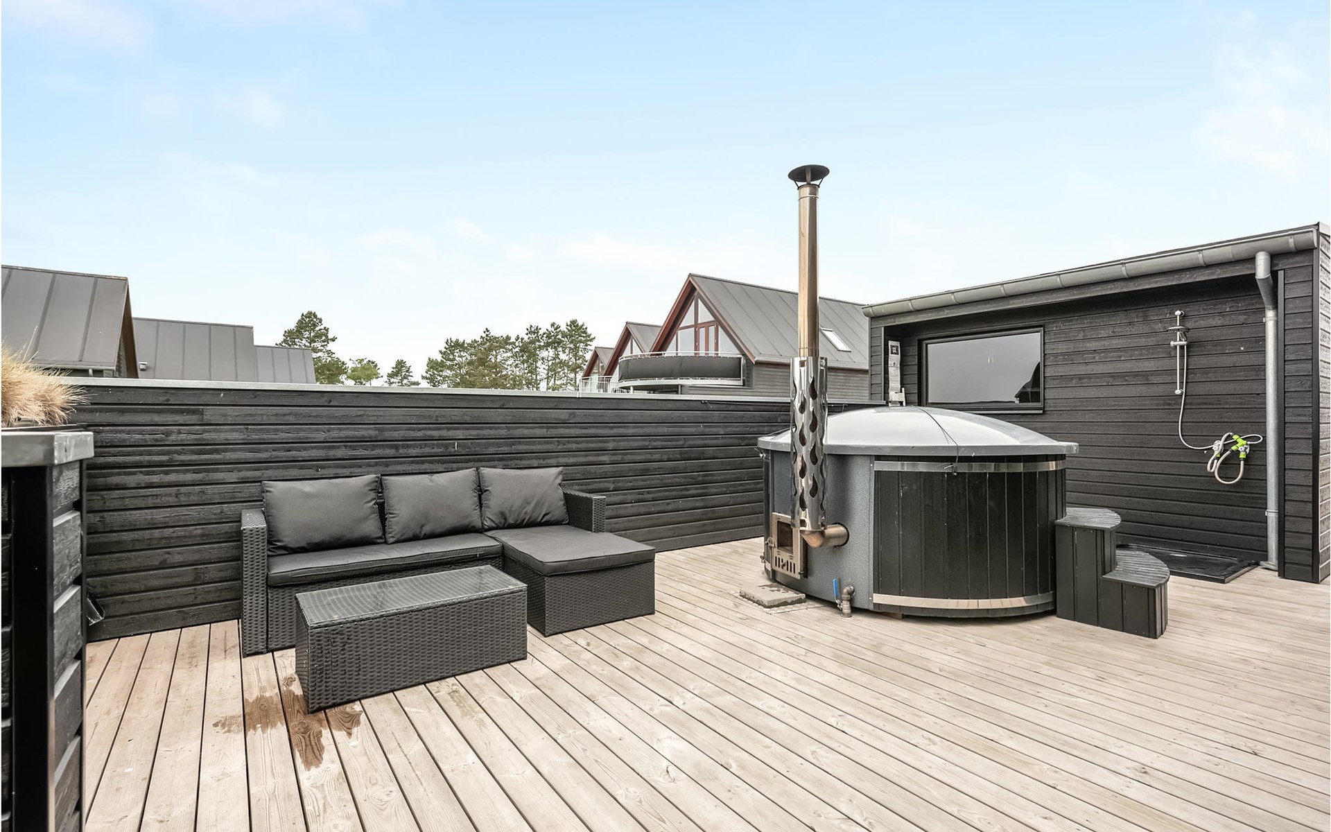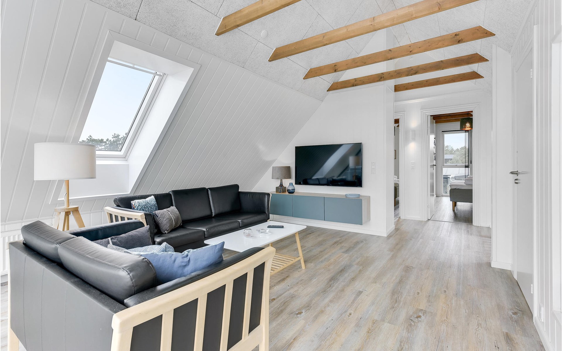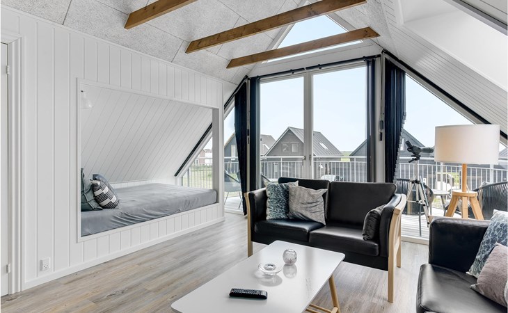 Upstairs is a living room with comfortable sitting area, TV and a balcony. Outside, from the terrace and balcony, you can see the Rømø golf course and there is a bathing buoy for a different kind of outdoor bathing. The bathing buoy, connoisseurs also call it Wildmarksbad, you can use all year round. Afterwards you can make a detour to the sauna, because it is placed right next to the bathing buoy.
