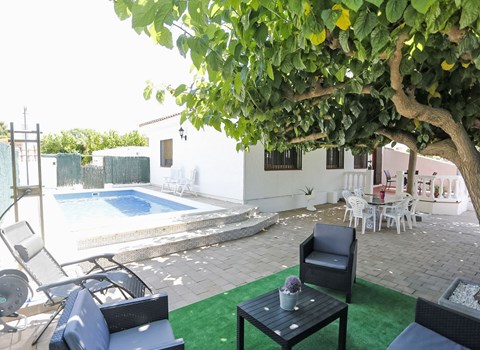 Comfortable cottage with green terrace area and shared swimming pool.