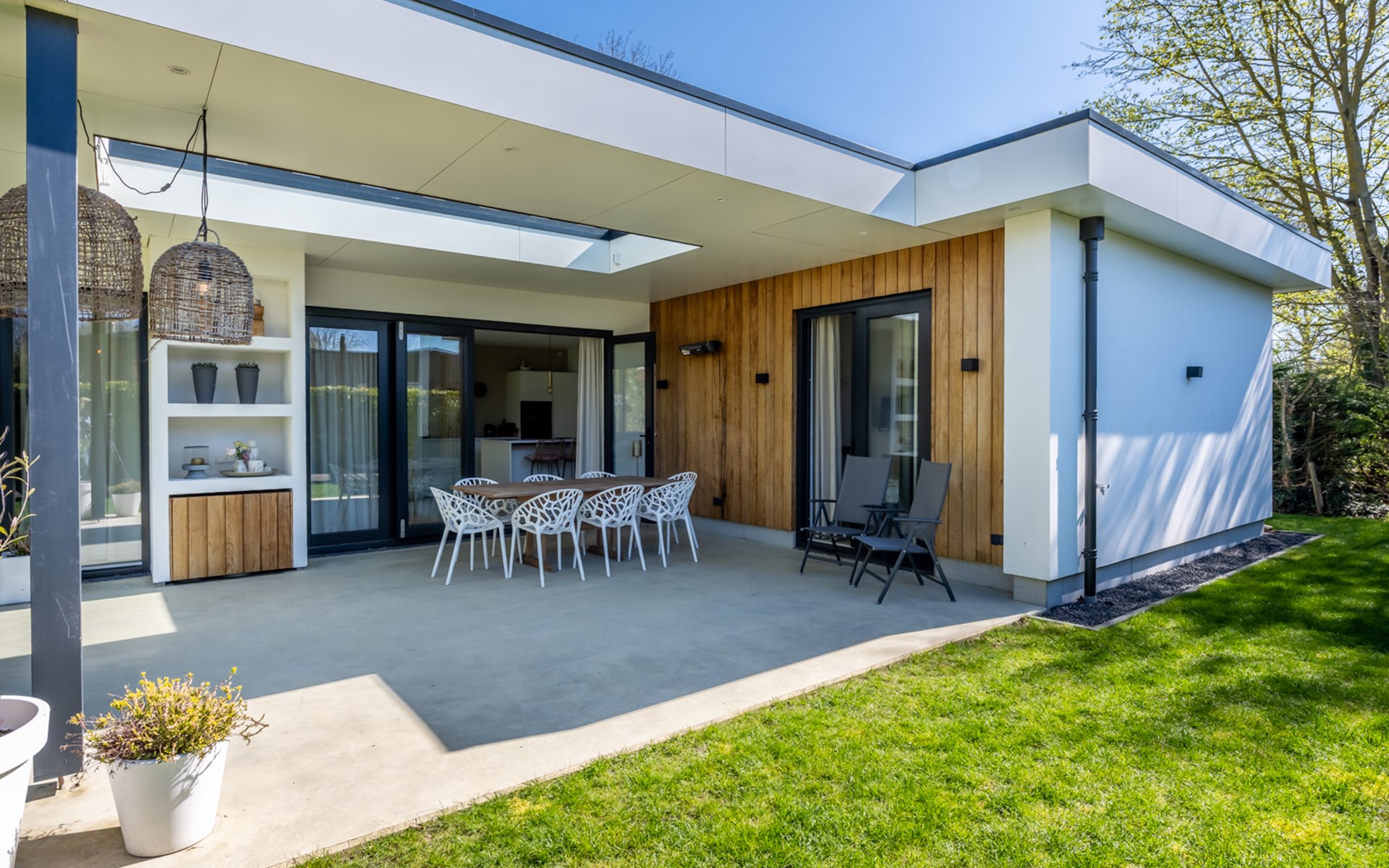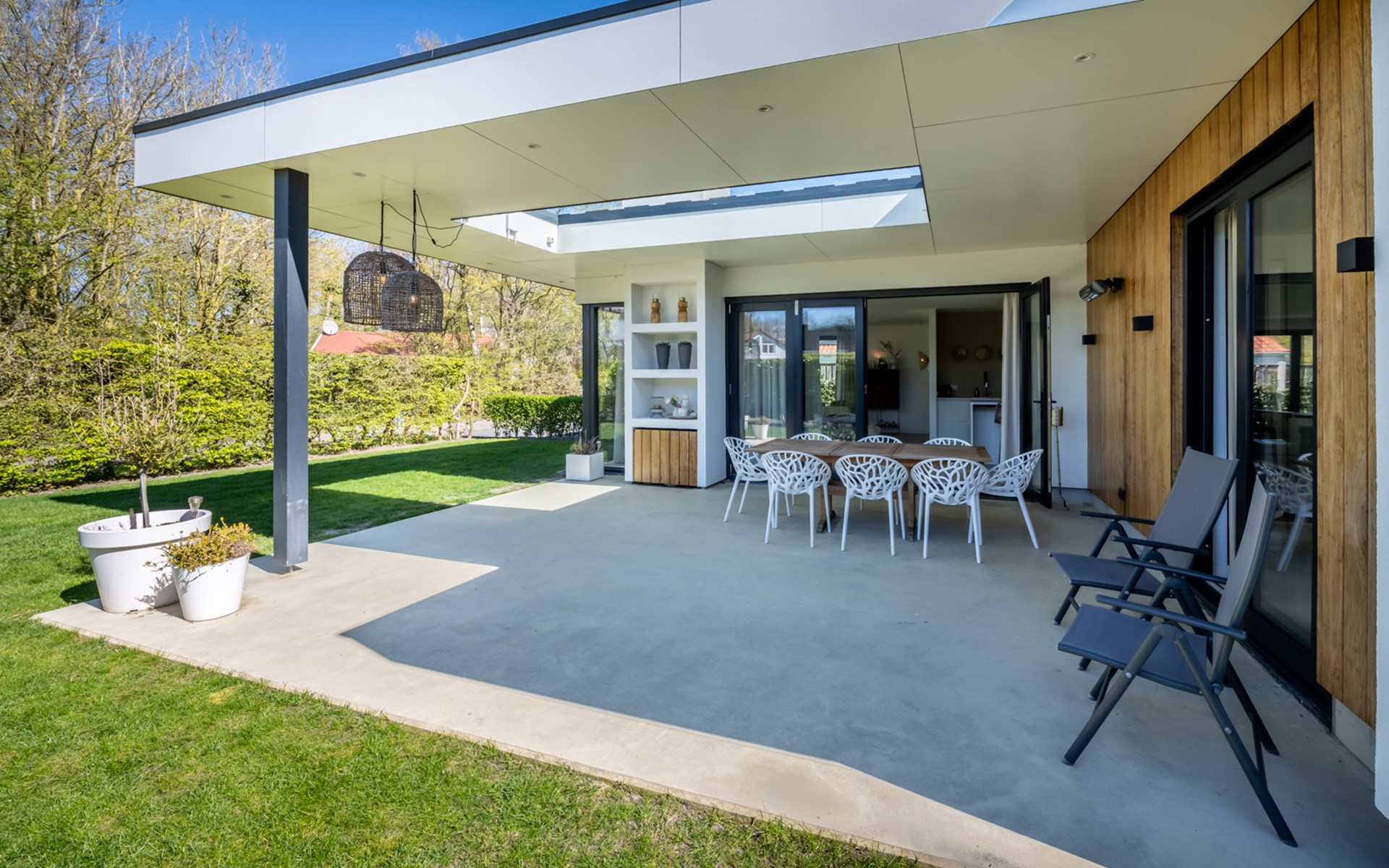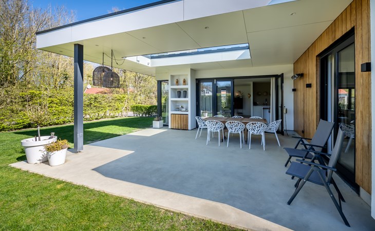 The harmonica patio doors can be fully opened and give access to shaded outdoor areas and sunny terraces. The covered terrace is equipped with a large patio table and two sun beds. As the concrete cast floor flows seamlessly from the living room and kitchen into the terrace, you create one large space here. What a pleasure to enjoy nature and tranquillity here. Can you hear the murmur of the sea?