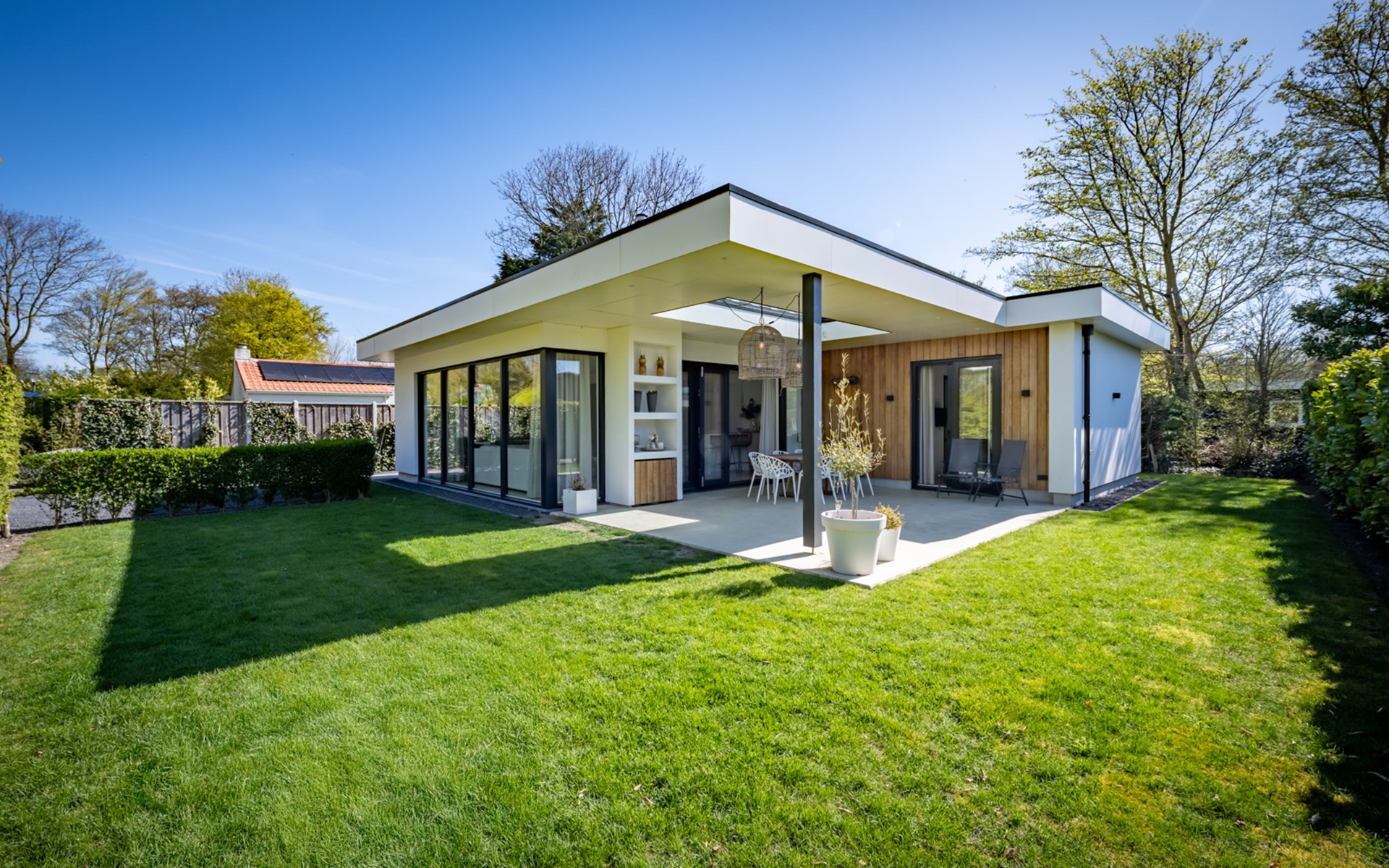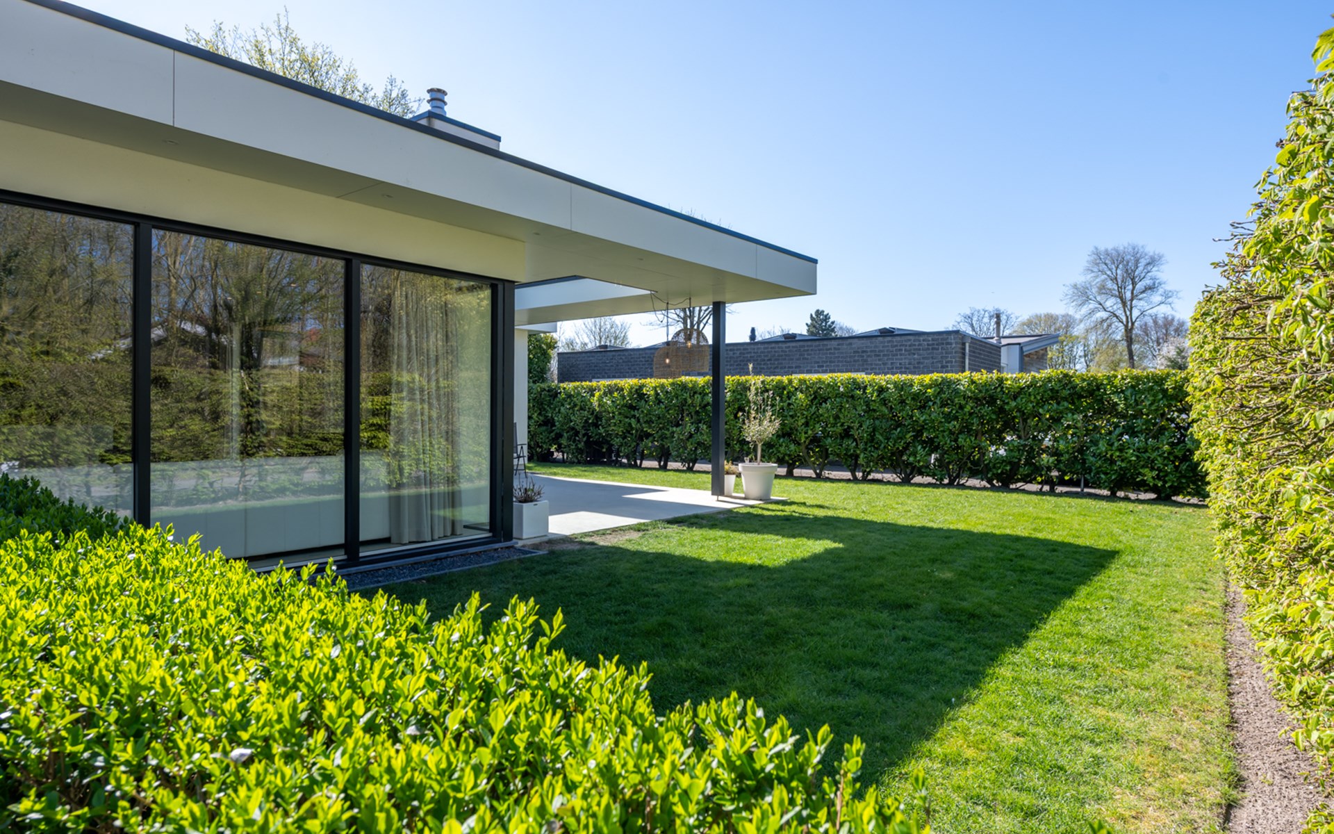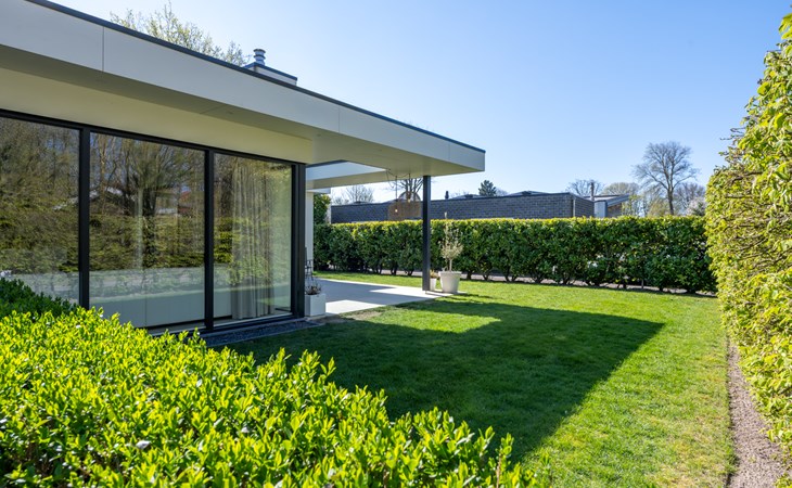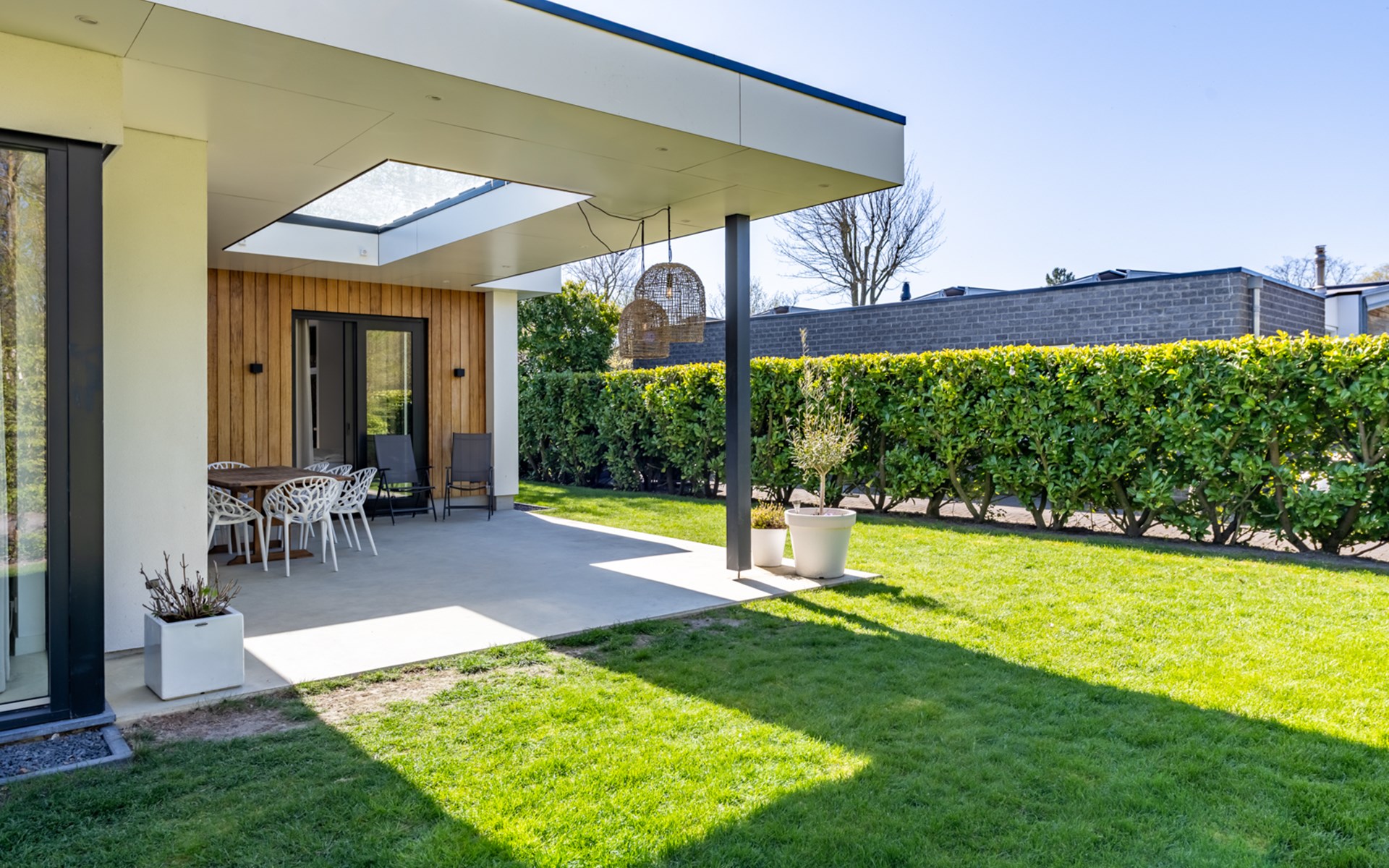 The harmonica patio doors can be fully opened and give access to shaded outdoor areas and sunny terraces. The covered terrace is equipped with a large patio table and two sun beds. As the concrete cast floor flows seamlessly from the living room and kitchen into the terrace, you create one large space here. What a pleasure to enjoy nature and tranquillity here. Can you hear the murmur of the sea?
