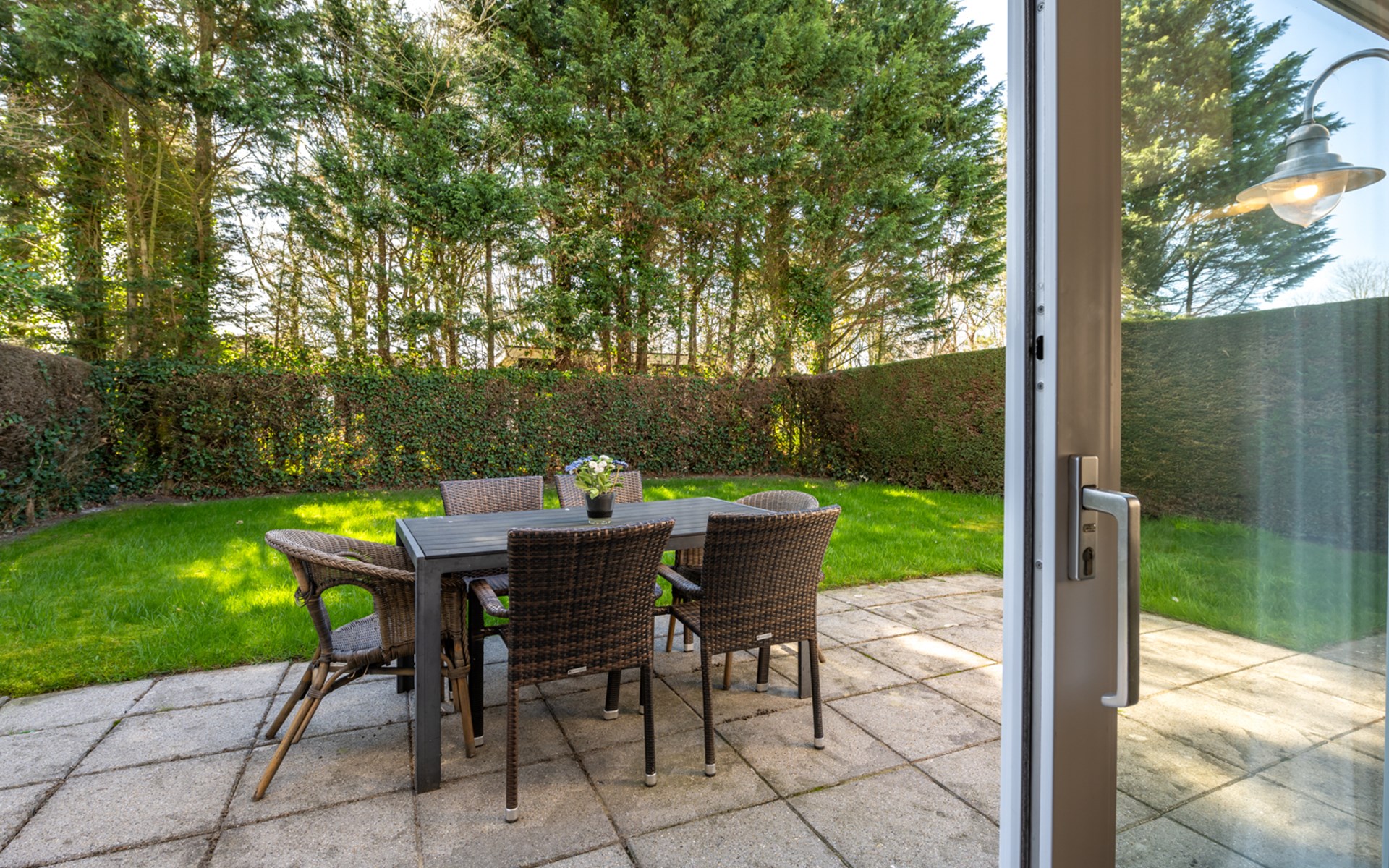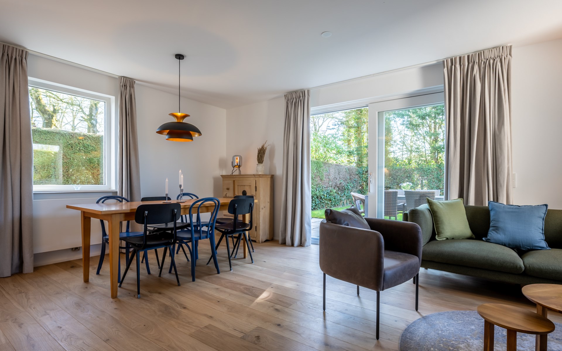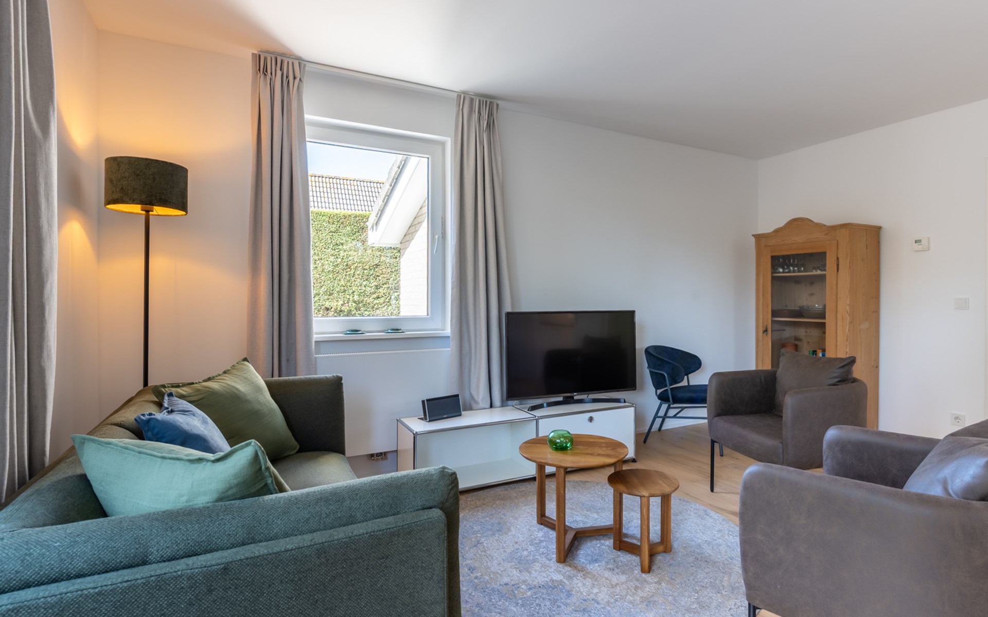 The living room with open-plan kitchen is wonderfully light and south-facing. The sliding doors open onto the lush, sheltered garden and the terrace with comfortable garden furniture and two sun loungers. In the living room, you’ll find a comfortable seating area with a flat-screen TV.