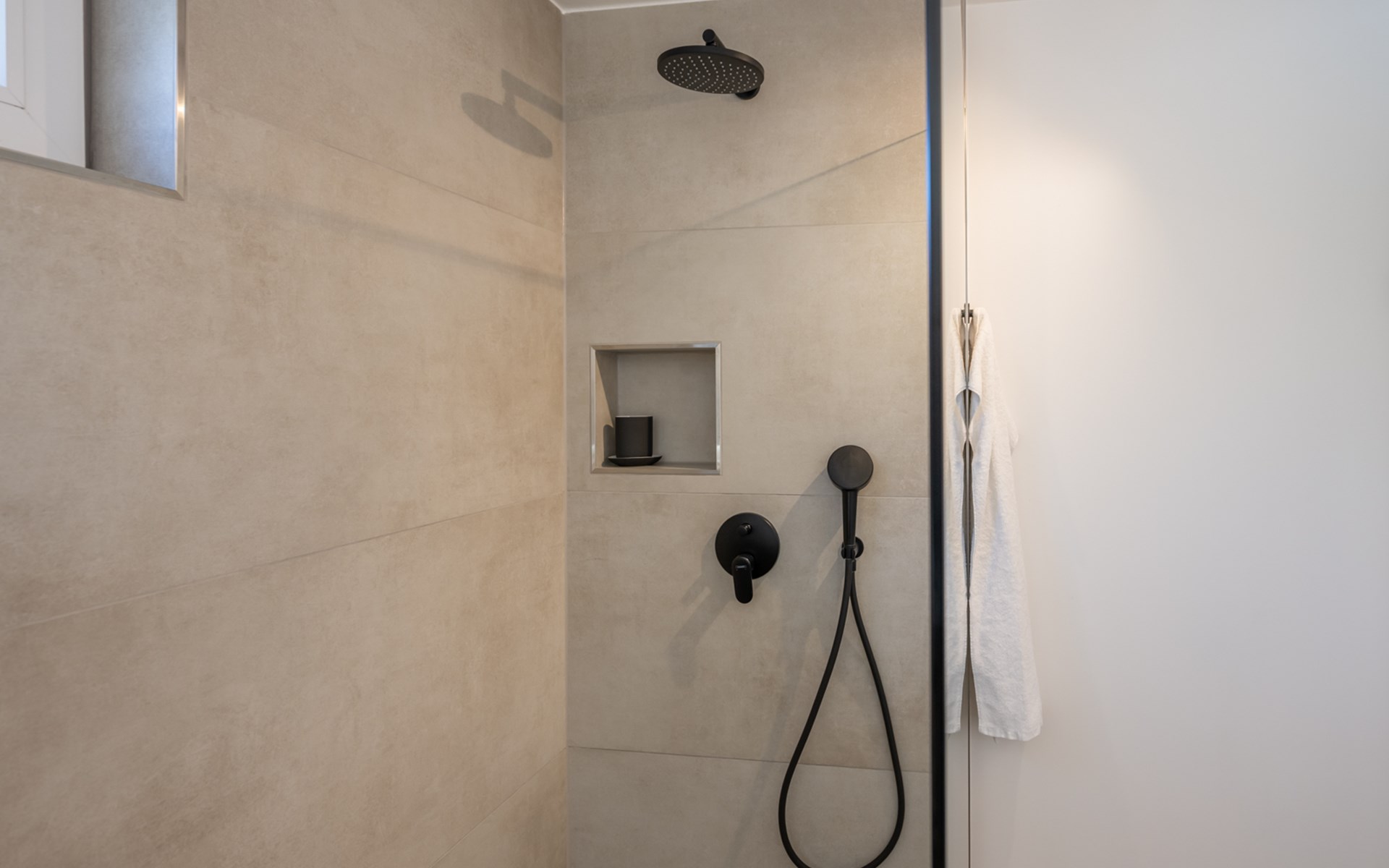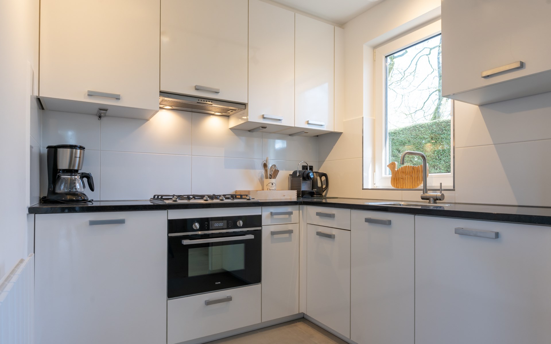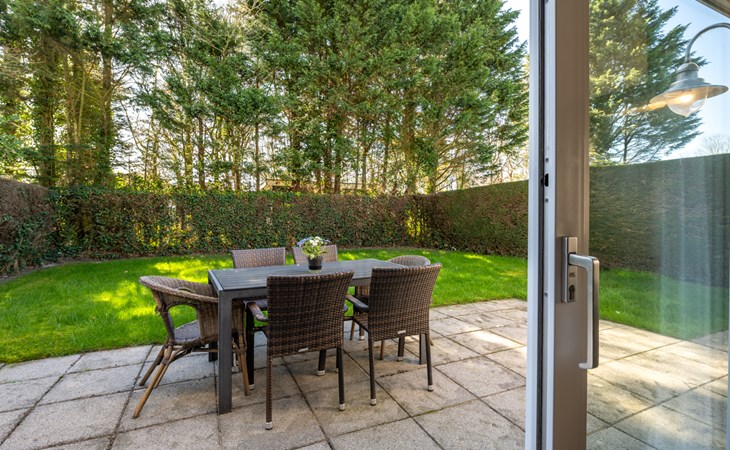 The living room with open-plan kitchen is wonderfully light and south-facing. The sliding doors open onto the lush, sheltered garden and the terrace with comfortable garden furniture and two sun loungers. In the living room, you’ll find a comfortable seating area with a flat-screen TV.