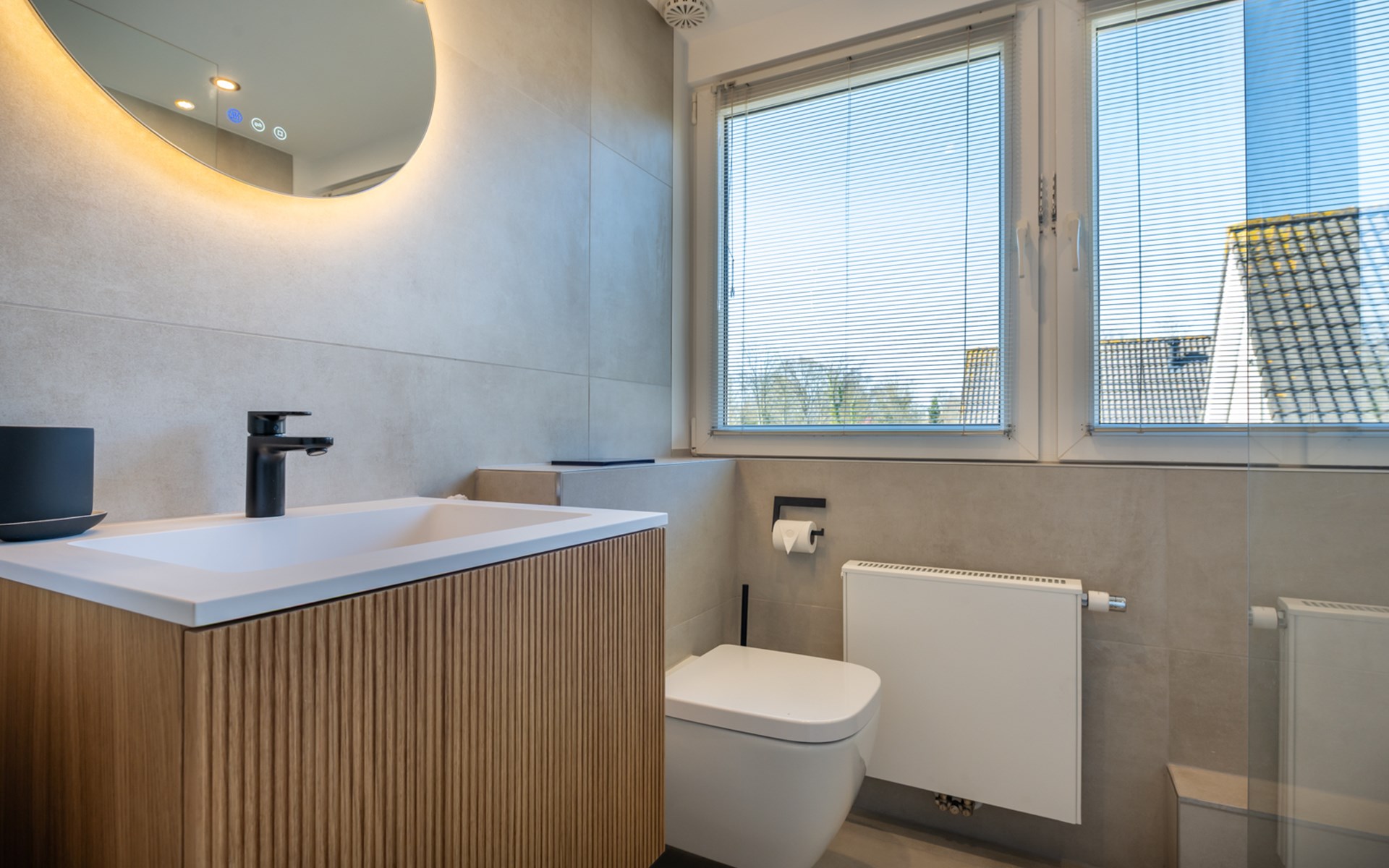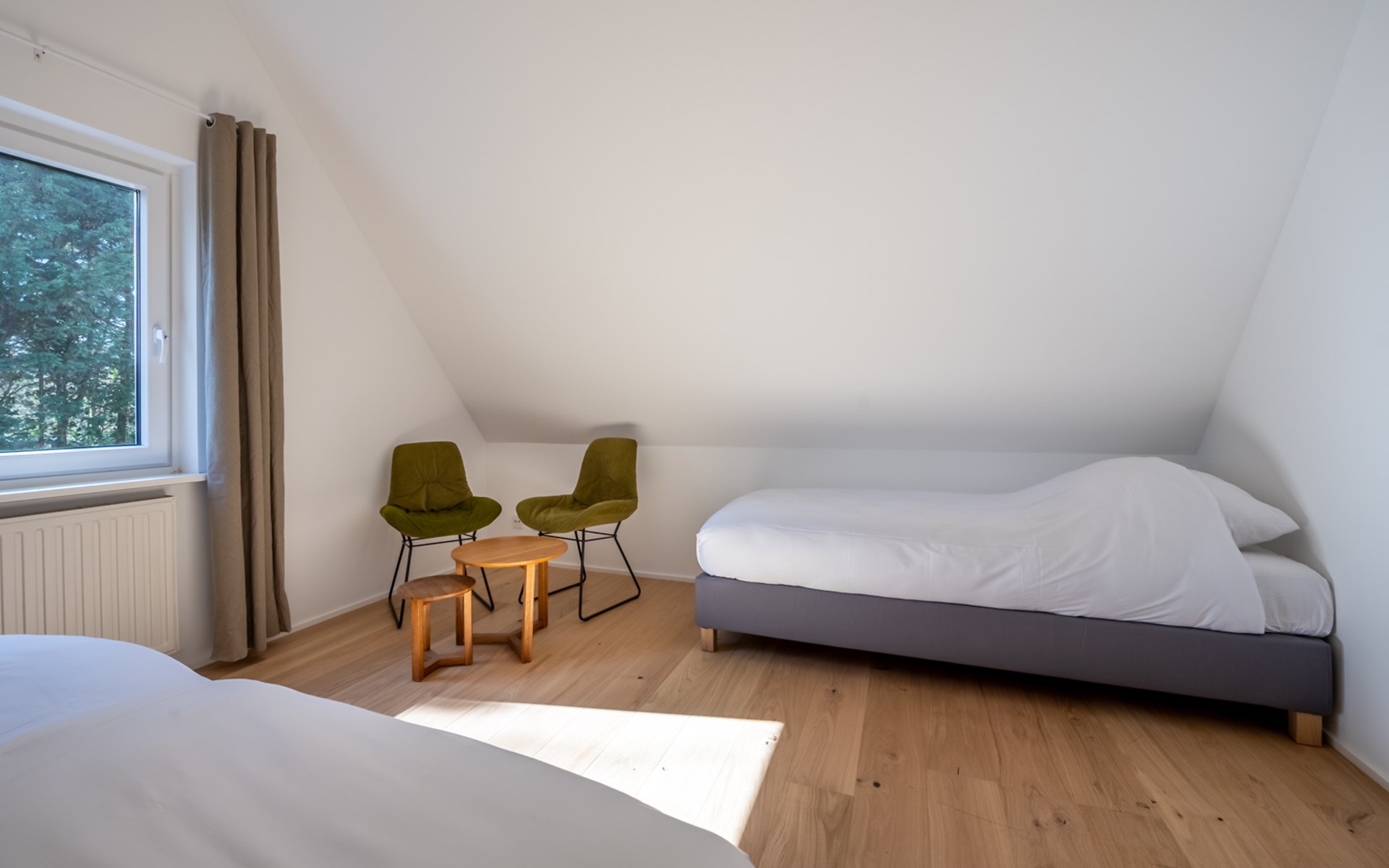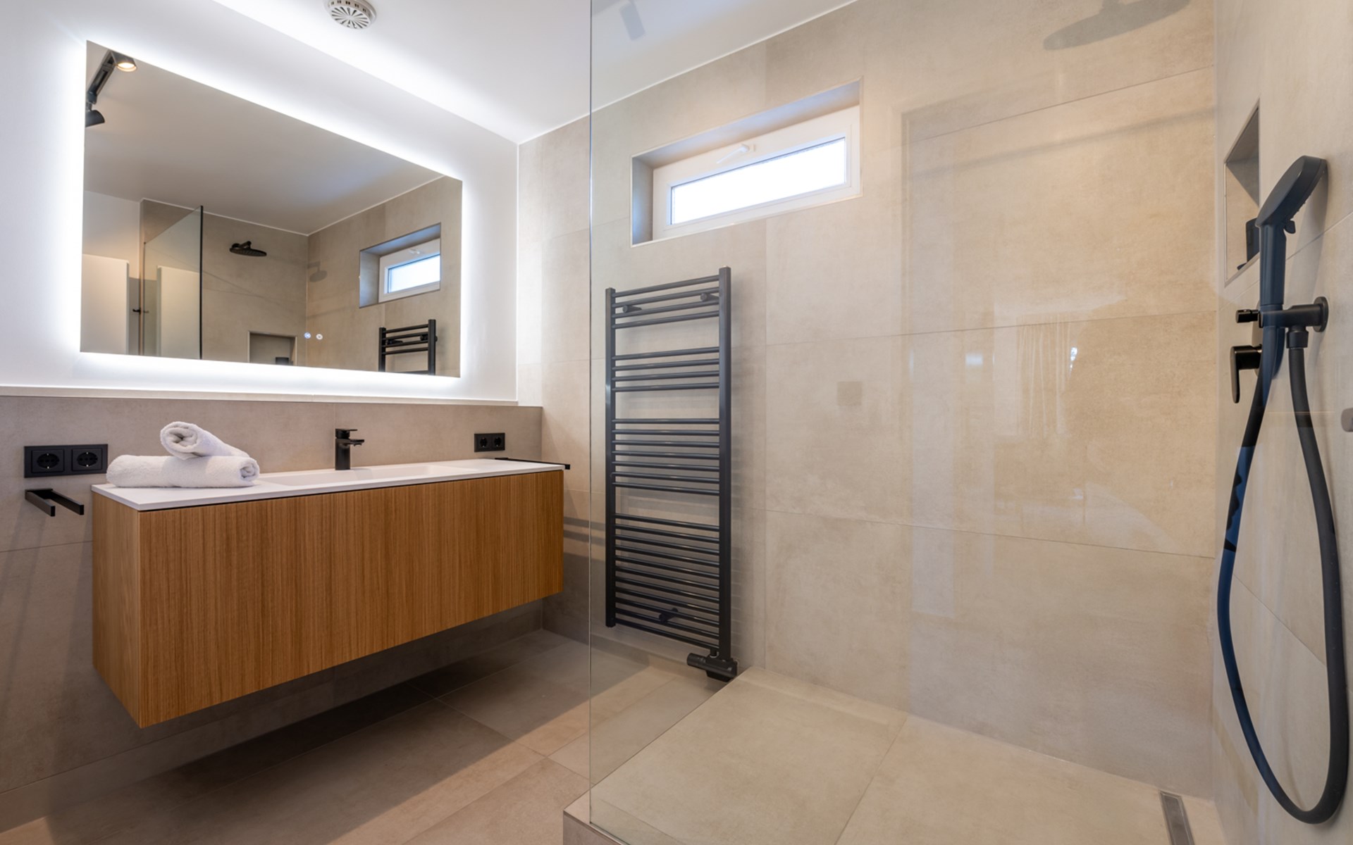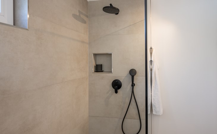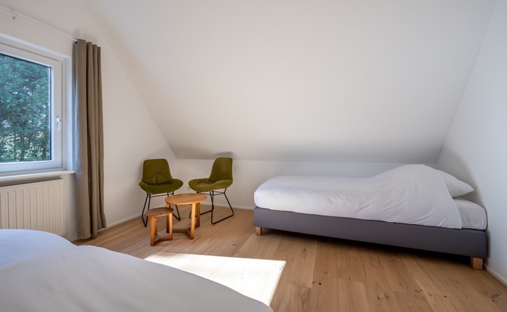 On the ground floor, there is a bedroom with a double bed and a modern bathroom featuring a double washbasin, toilet and walk-in shower. There is a guest toilet in the hall. Upstairs, there are two spacious bedrooms and a bathroom with a washbasin, toilet and walk-in shower. One bedroom has twin beds and the other has twin beds and a single bed.