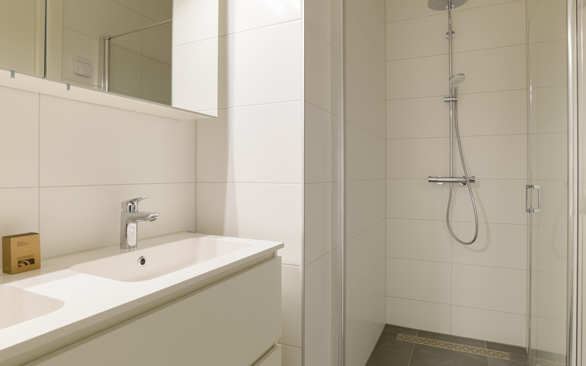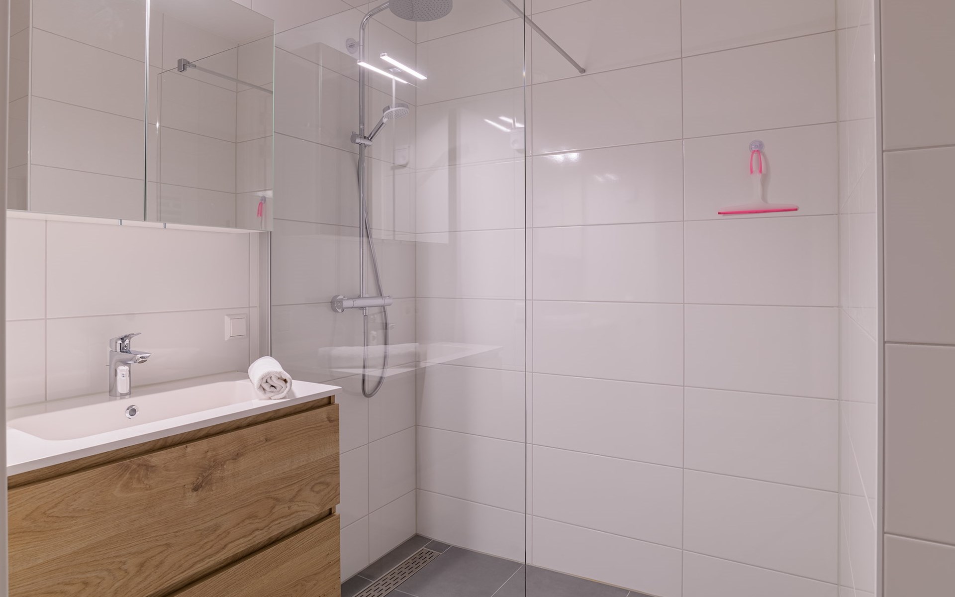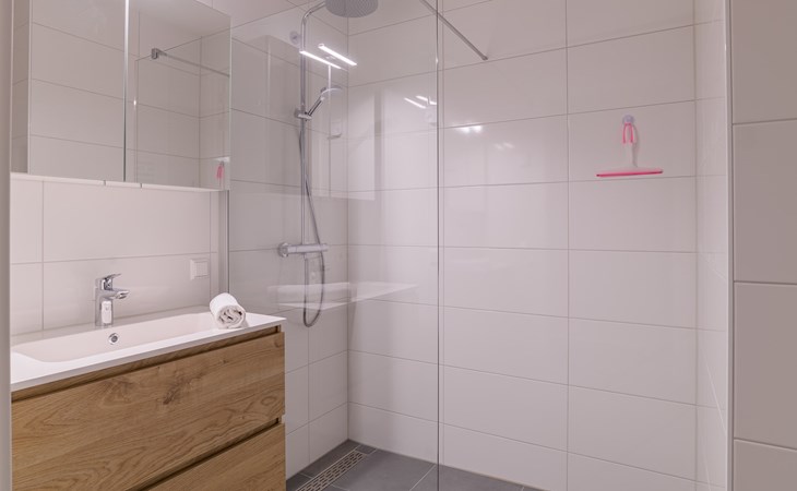 The apartment has two bedrooms, both furnished with 2 single beds. One bedroom has an en-suite bathroom with a walk-in shower, double washbasin and toilet. The other bathroom has a walk-in shower and washbasin. There is also a separate toilet in the apartment.