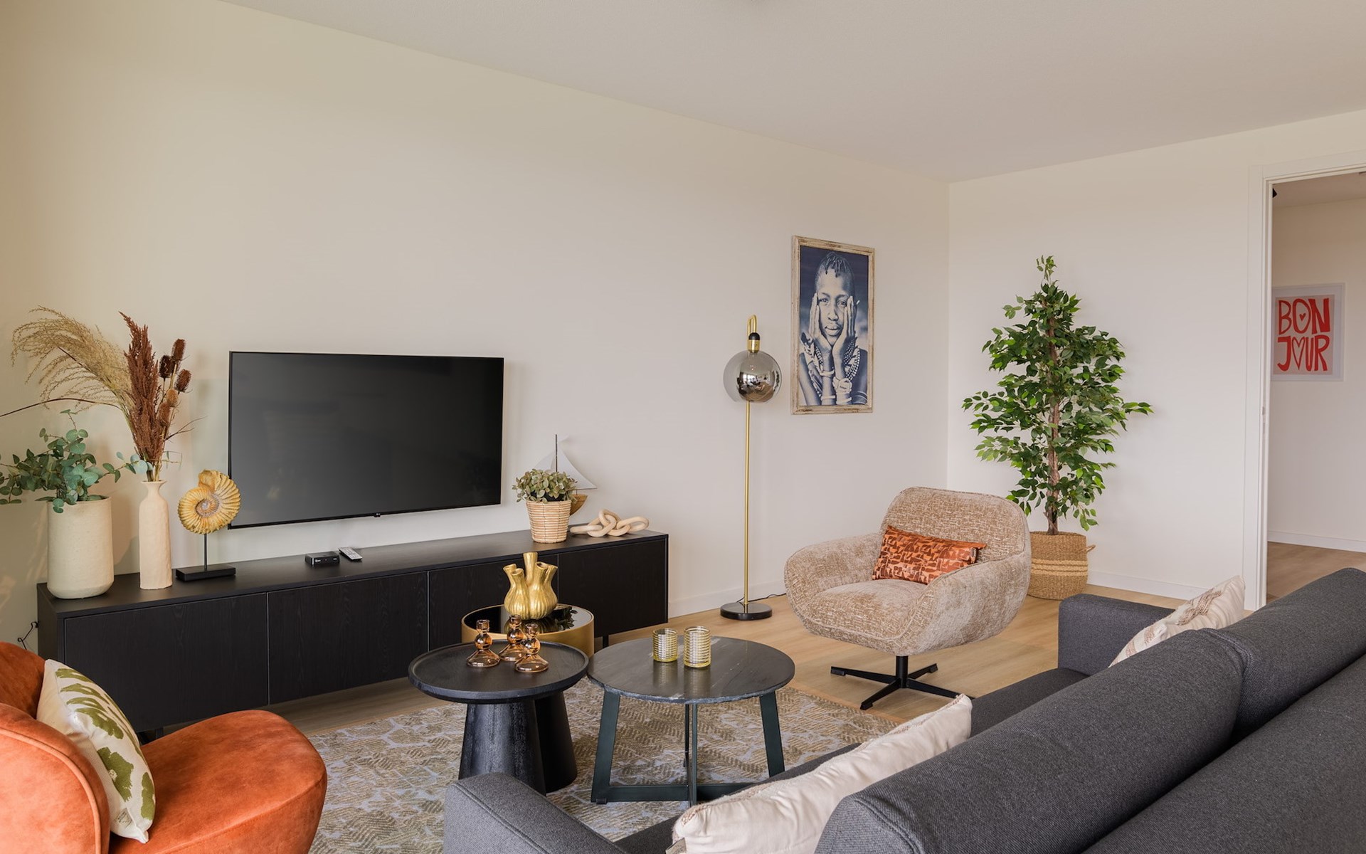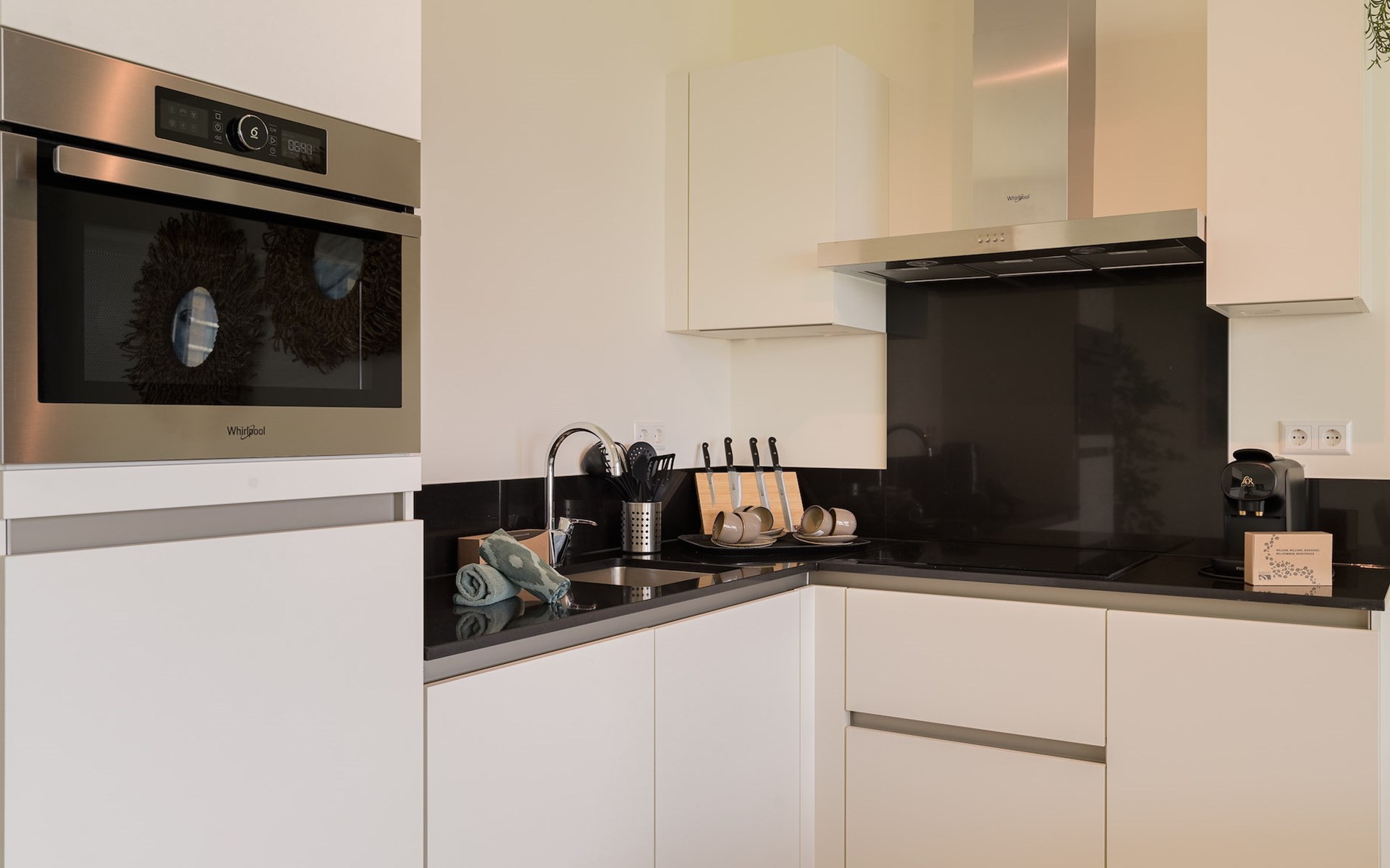 The spacious living room is attractively furnished with a comfortable seating area and a smart TV, ideal for streaming your favourite films and series. There is also a dining area and a modern, open kitchen with a fridge-freezer, combi oven, Nespresso machine and a dishwasher.