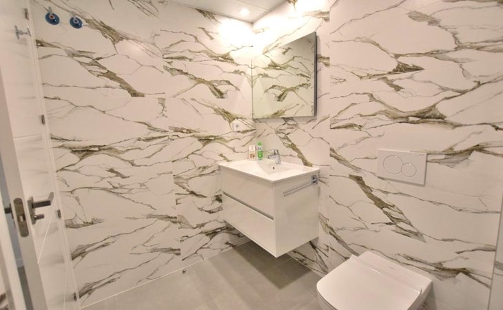 - bathroom with single washbasin, shower, toilet and hairdryer