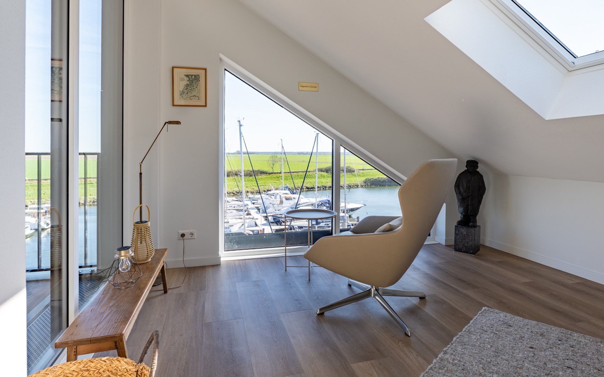 From the hall, you walk to the spacious living room where you are immediately met by the breathtaking view of Kamperland's marina. The comfortable seating area is equipped with a Smart TV with foreign package. In the armchair by the window, you can relax with a good book or just chill out by the cosy electric gas fireplace. From the living room you have access to the spacious south-facing balcony with comfortable garden furniture, where you can enjoy the beautiful view of the lively marina and the vast polder landscape until late in the evening.