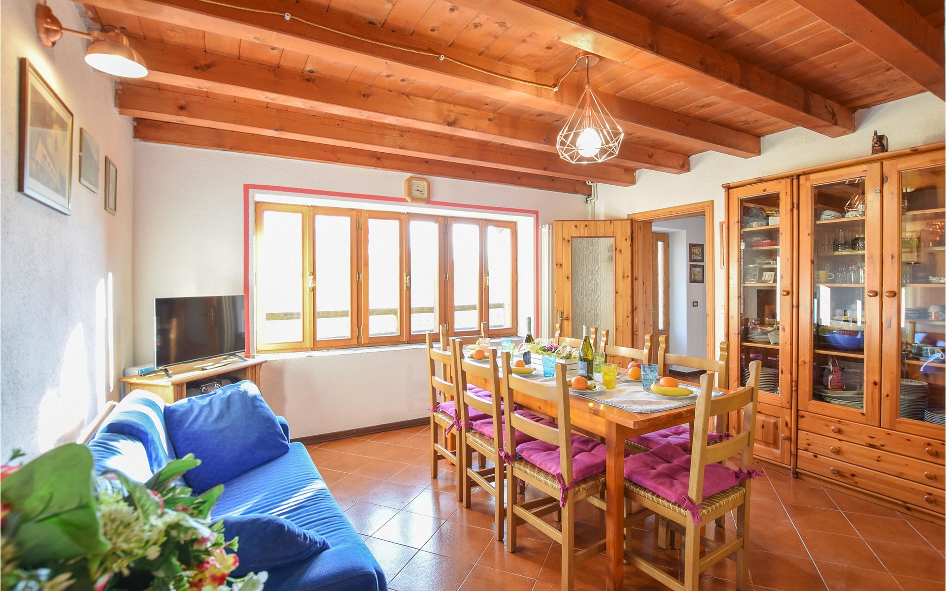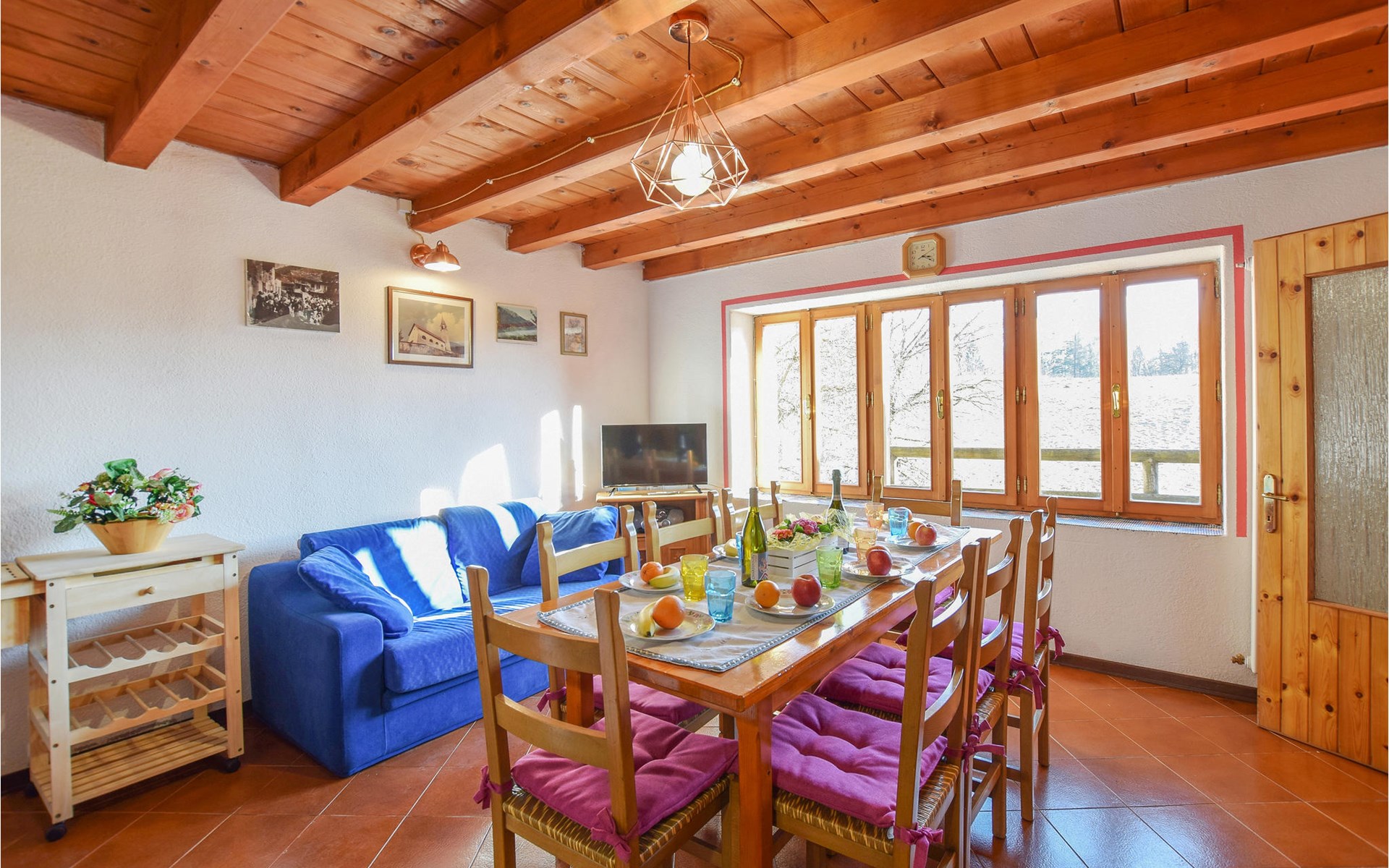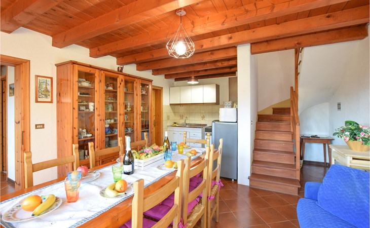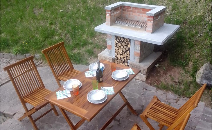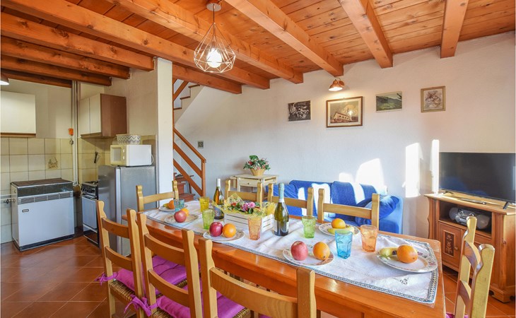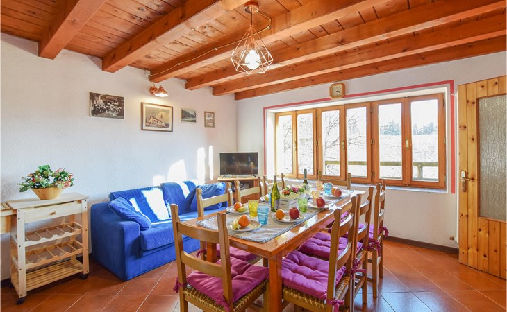The vacation home welcomes you in an idyllic hillside location. With its bright, homely rooms and the cozy interior with beautiful wooden ceilings and appealing colors, the house is the ideal setting for a relaxing getaway. At the long dining table you can dine together, enjoy the time together, in the evening you can sit together, play board games, or just chat for a long time while the flames crackle in the fireplace.