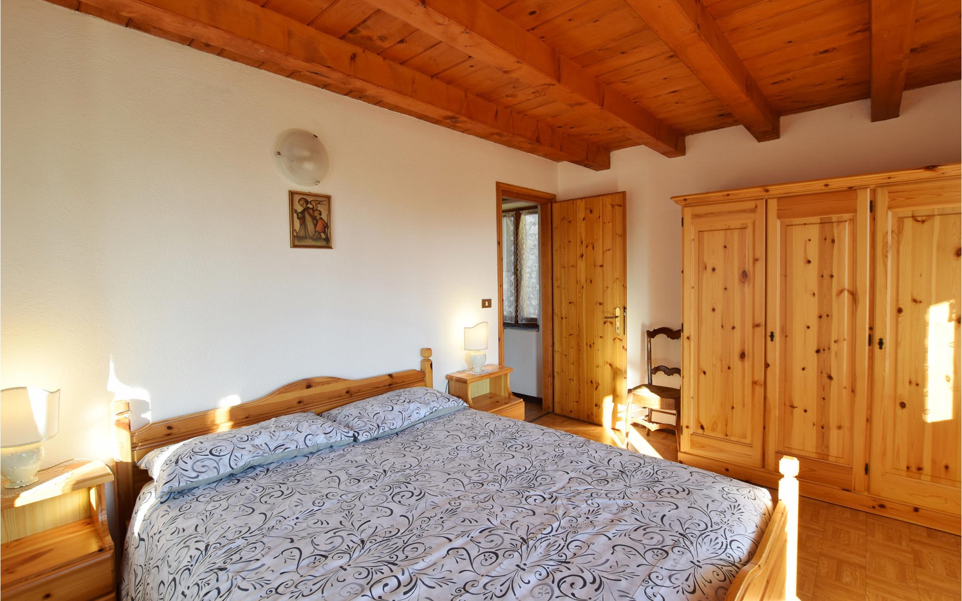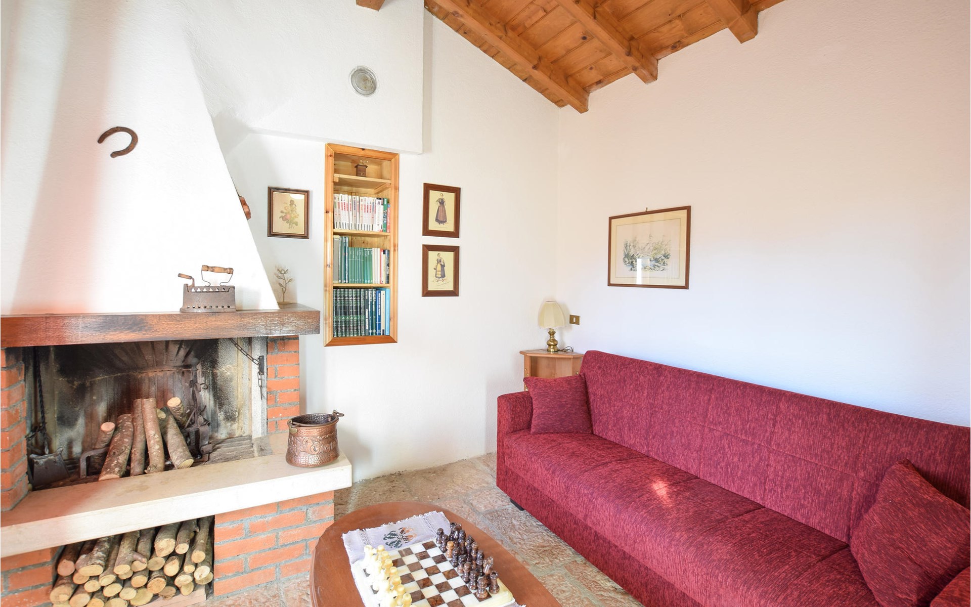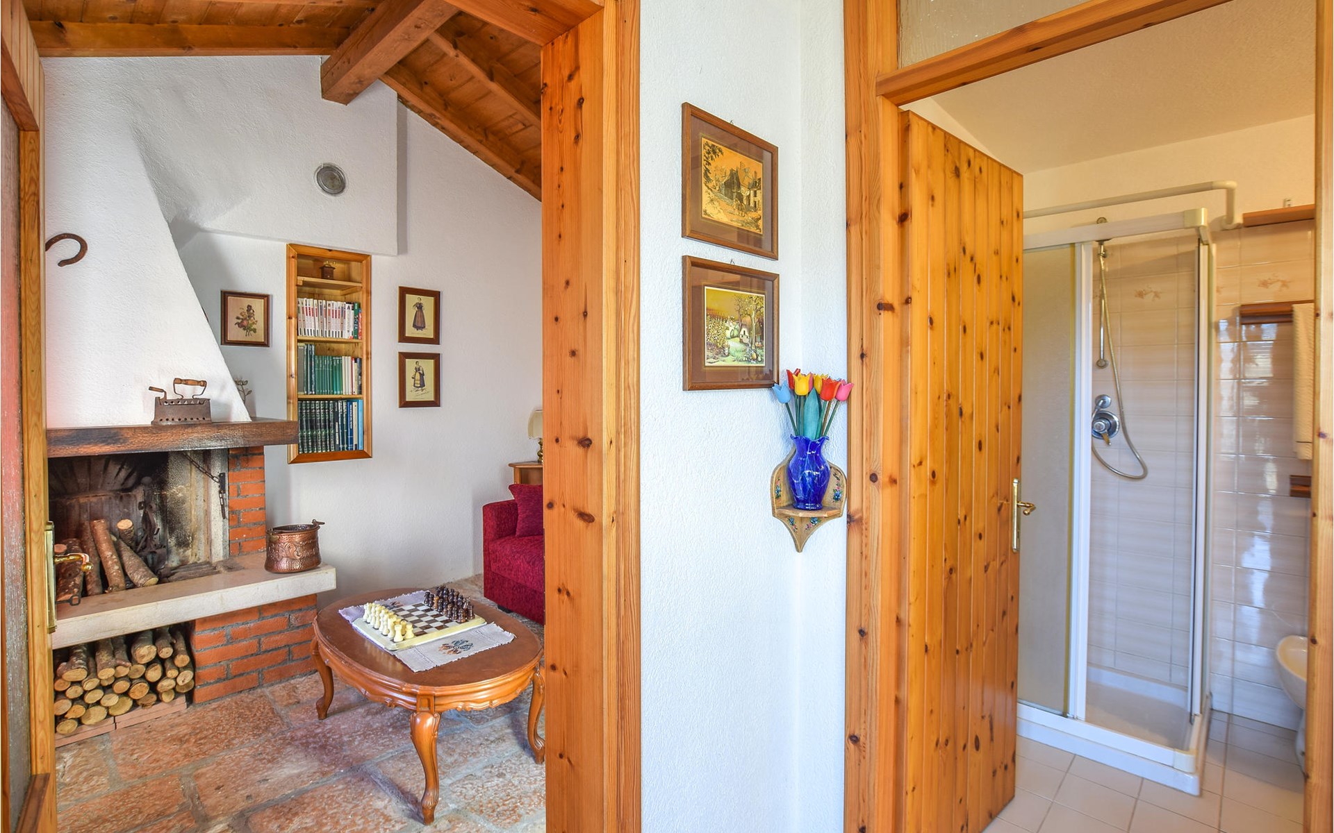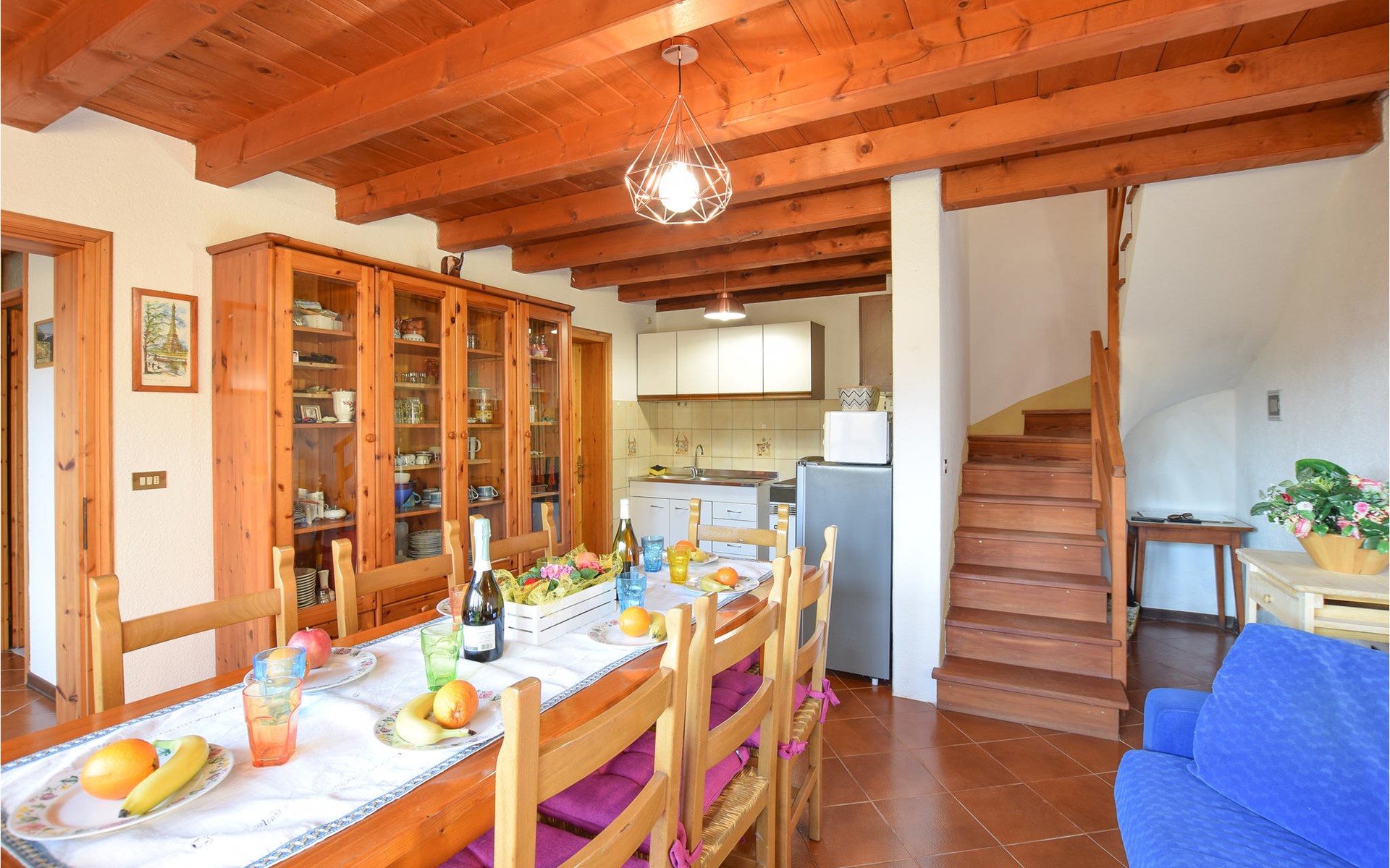 The vacation home welcomes you in an idyllic hillside location. With its bright, homely rooms and the cozy interior with beautiful wooden ceilings and appealing colors, the house is the ideal setting for a relaxing getaway. At the long dining table you can dine together, enjoy the time together, in the evening you can sit together, play board games, or just chat for a long time while the flames crackle in the fireplace.