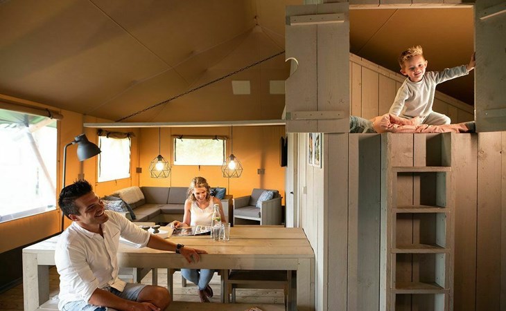 Experience the ultimate glamping adventure in the luxurious Safarihouse at Recreatiepark De Boshoek. This spacious safari tent accommodates up to 8 people, making it ideal for a large family or a group of friends seeking a comfortable and adventurous holiday. The safari tent’s interior is both rugged and cozy, with wooden accents creating a robust feel. In the spacious living room with a flatscreen TV, you can relax after a day in nature, while the fully equipped kitchen with a 4-burner gas stove, dishwasher, fridge with freezer, microwave, and Senseo coffee machine allows you to prepare your own meals. Additionally, the tent features a spacious sitting and dining area where you can enjoy meals and quality time together.