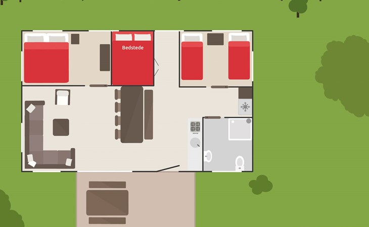 One of the standout features of this luxurious Safarihouse is the private bathroom, which includes a toilet, sink, and shower. This allows you to enjoy the comfort of a hotel while still experiencing the charm of camping. The tent has three bedrooms: one with two single beds, one with bunk beds, and a cozy bunk for two. The Safarihouse is perfect for the whole family or a group of friends. It also has a veranda where you can enjoy the outdoors and view the playground where the kids can play. The Safarihouse is available from March to October, so you can enjoy the freedom of nature with the comfort of modern amenities throughout the camping season.