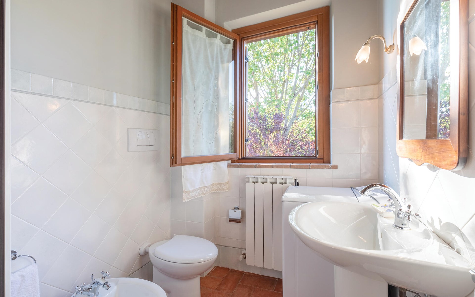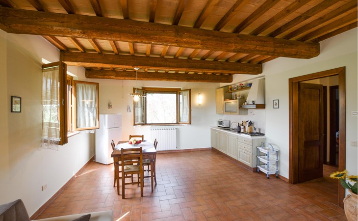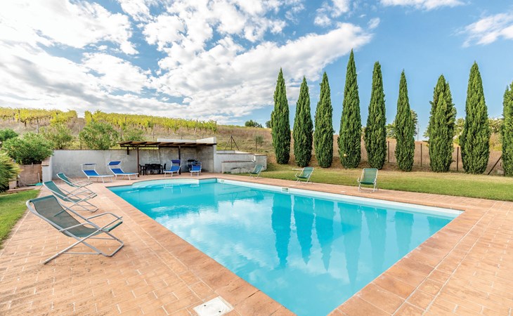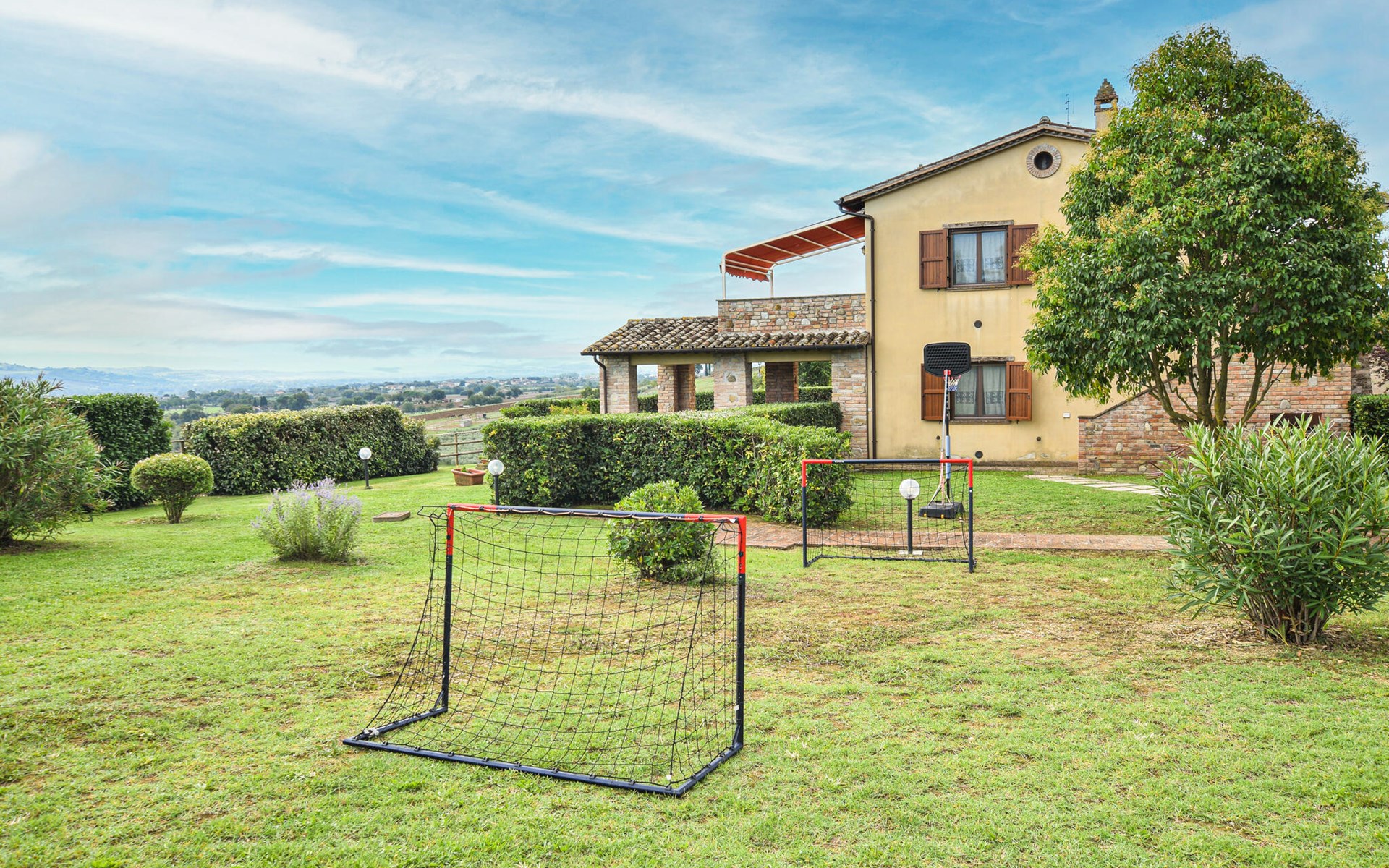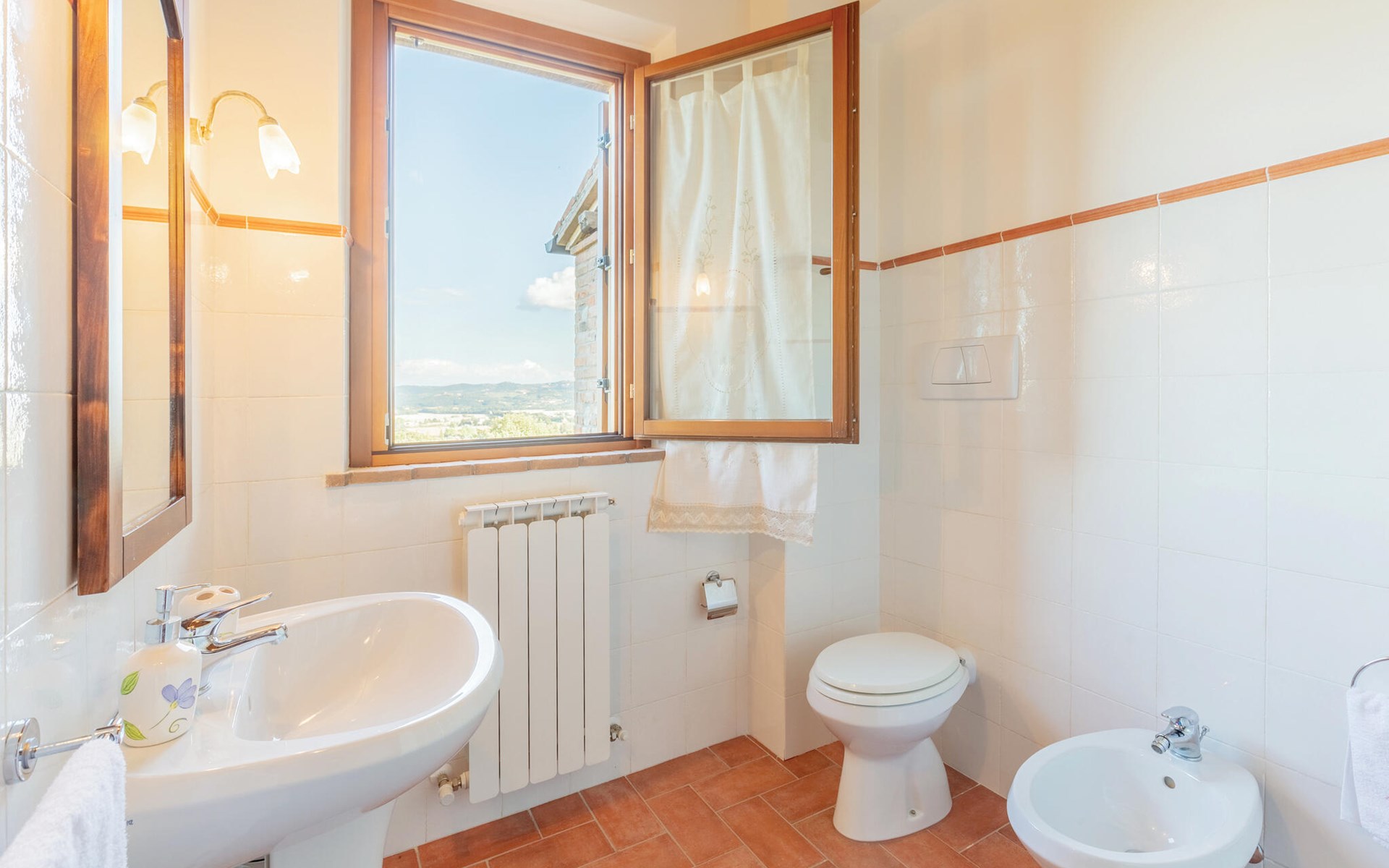 Discover the beautiful region of Umbria from this vacation apartment. It is located in a historic country house on a private property of 5 hectares, on a gentle hill above a beautiful valley with characteristic Umbrian villages. The house has been renovated and transformed into 4 spacious vacation apartments (IUP758, IUP759, IUP760 and IUP761), which can also be booked together for 16 sleeps with the house number IUP773. Enjoy the quiet location and panoramic views of the surrounding area. The pool are for communal use. Accommodation: 1st floor (80m²): Spacious living / dining room (TV), private staircase, down to a green area of about 200 m²; kitchenette, 1 double bedroom with bathroom with shower, 1 twin bedroom, 1 bathroom with shower (washing machine). Distances: 1.6 km grocery stores, 7 km Marsciano (stores of all kinds), 10 km Deruta (very famous for its pottery), 20 km Perugia, 30 km Assisi. The Umbria region with its mix of culture, tradition, unspoiled nature and gastronomic specialties is guaranteed to surprise you!