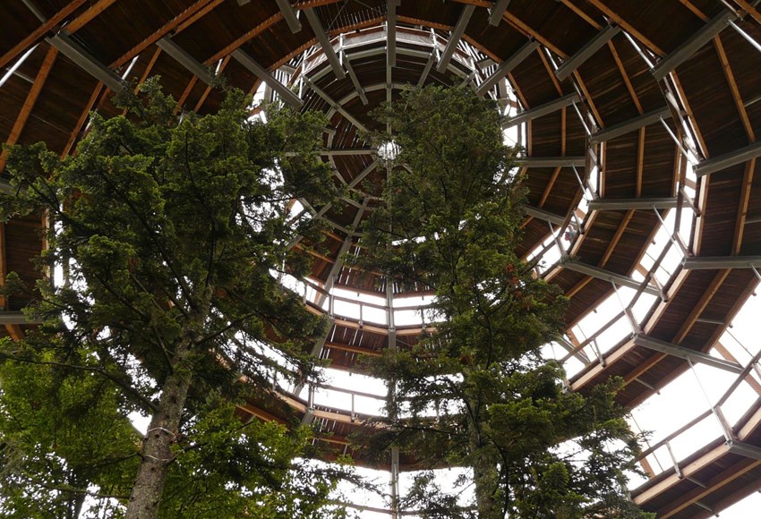 At the top awaits the 31-meter-high Eugen Keidel Tower, whose steel construction resembles a power pylon. Via metal stairs, you reach the triangular viewing platform, from where—on clear days—you can even spot the silhouettes of the Swiss Alps.