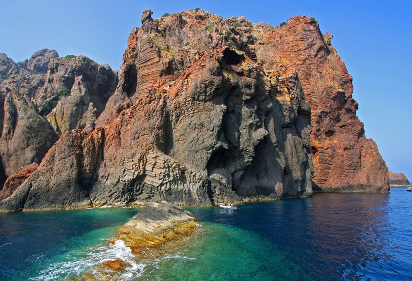 Accessible only by boat, the deep red of the rocks, the bright blue of the sea, and the fresh green of the vegetation create a constantly changing color palette. Among rocky outcrops, tafoni (rocks with remarkable hollow formations), and caves, a rich variety of wildlife thrives. Rare bird species such as the golden eagle, peregrine falcon, osprey, and European shag find their home here. Although the fragile marine area is closed to divers, you might even spot dolphins during your boat trip—an unforgettable experience.