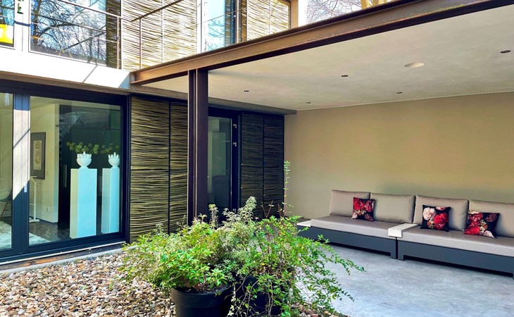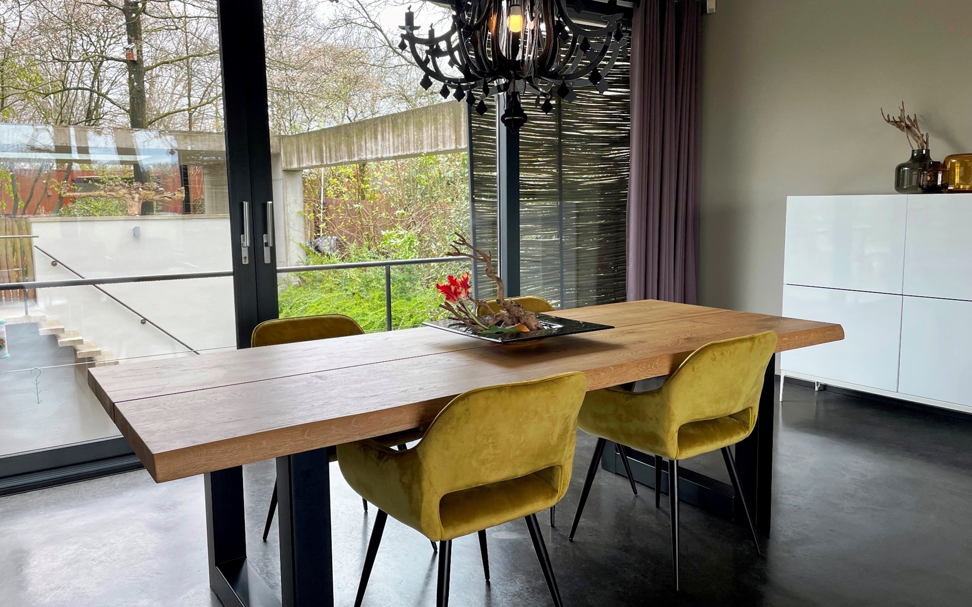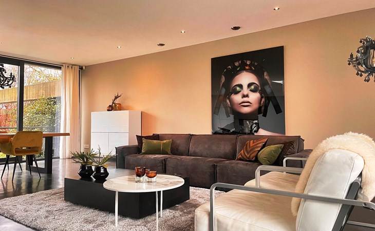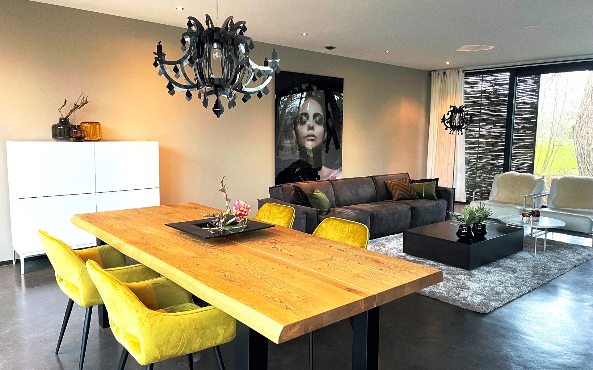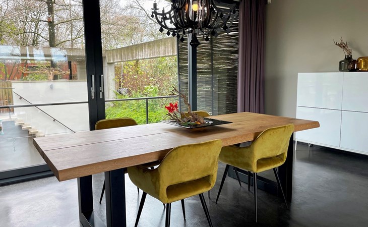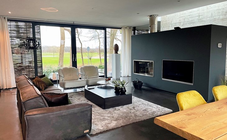 De zeer ruime woning is geheel voorzien van een gietvloer met vloerverwarming. Entree is voorzien van een garderobe en separaat toilet. De woonkamer heeft een moderne inrichting met moderne meubels zoals een heerlijke loungebank, open haard, TV en muziekinstallatie. De glazen pui aan voor- en achterzijde zorgt voor veel licht. Een natuurlijke zonwering zorgt voor privacy. Voor de open haard liggen er zakken haardhout klaar in huis inclusief aanmaakblokjes (tegen betaling, hout uit het bos is niet toegestaan). Via de woonkamer bereikt u het terras (deels begrensd met een open hekwerk met staaldraad) met 2 ligstoelen, eettafel en stoelen. De open keuken heeft een prachtig betonnen werkblad, 4 gaspitten, grote koelkast met vriezer, magnetron/oven, Nespresso-machine (zelf cups meenemen) en Quooker. Aan de eettafel is er plek voor 4 personen.