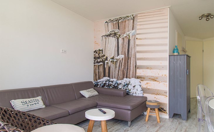 De lichte woonkamer en open keuken zorgen door het gebruik van natuurlijke materialen voor een fijne strandsfeer. Dit is een plek om samen te ontspannen, een boek te lezen of een serie te kijken op de comfortabele hoekbank. Openslaande deuren verbinden binnen en buiten en geven toegang tot het terras.
