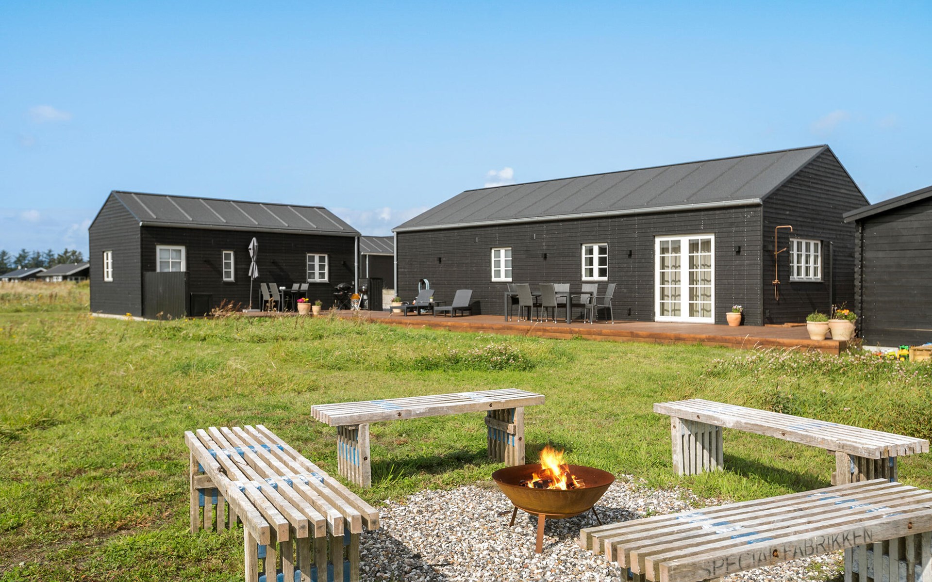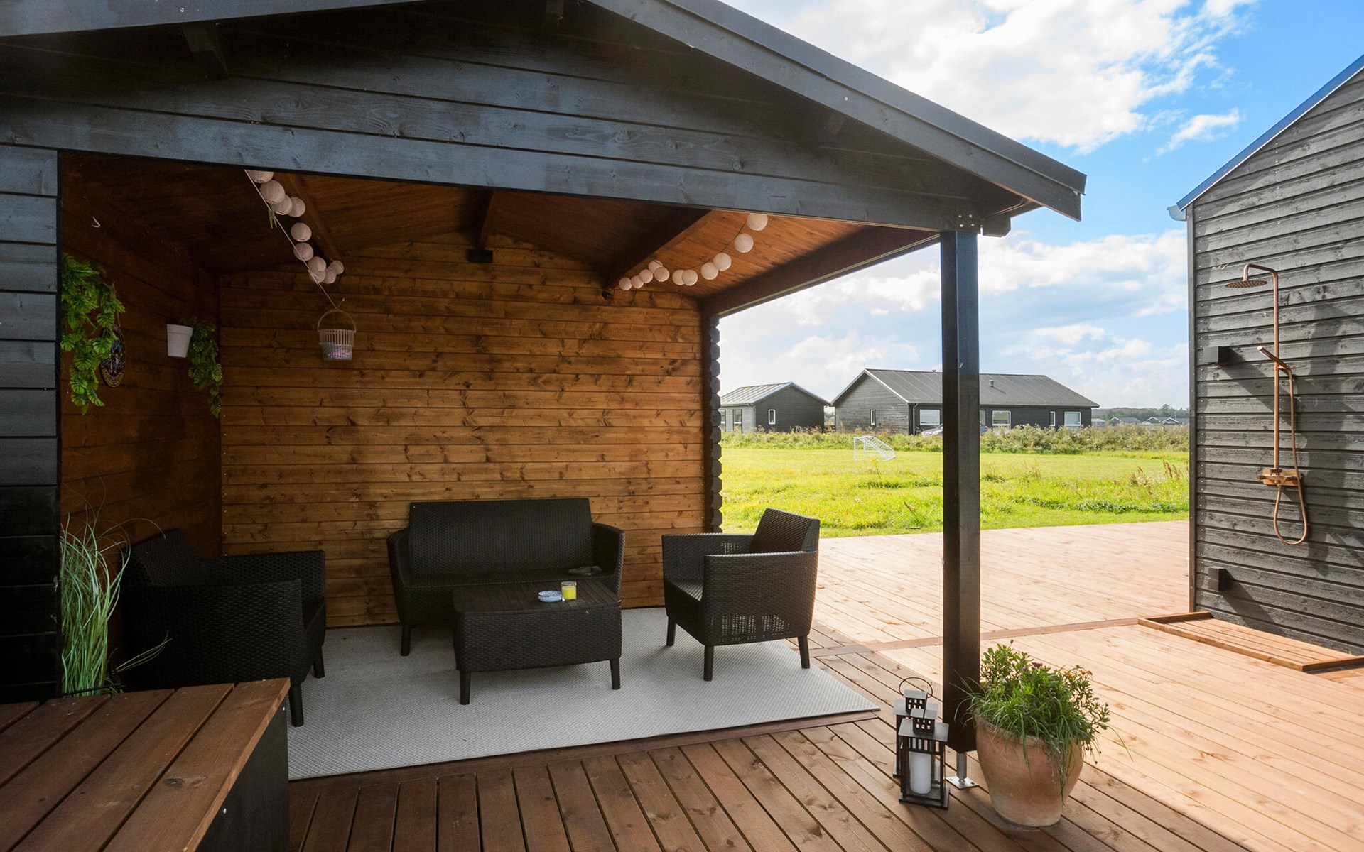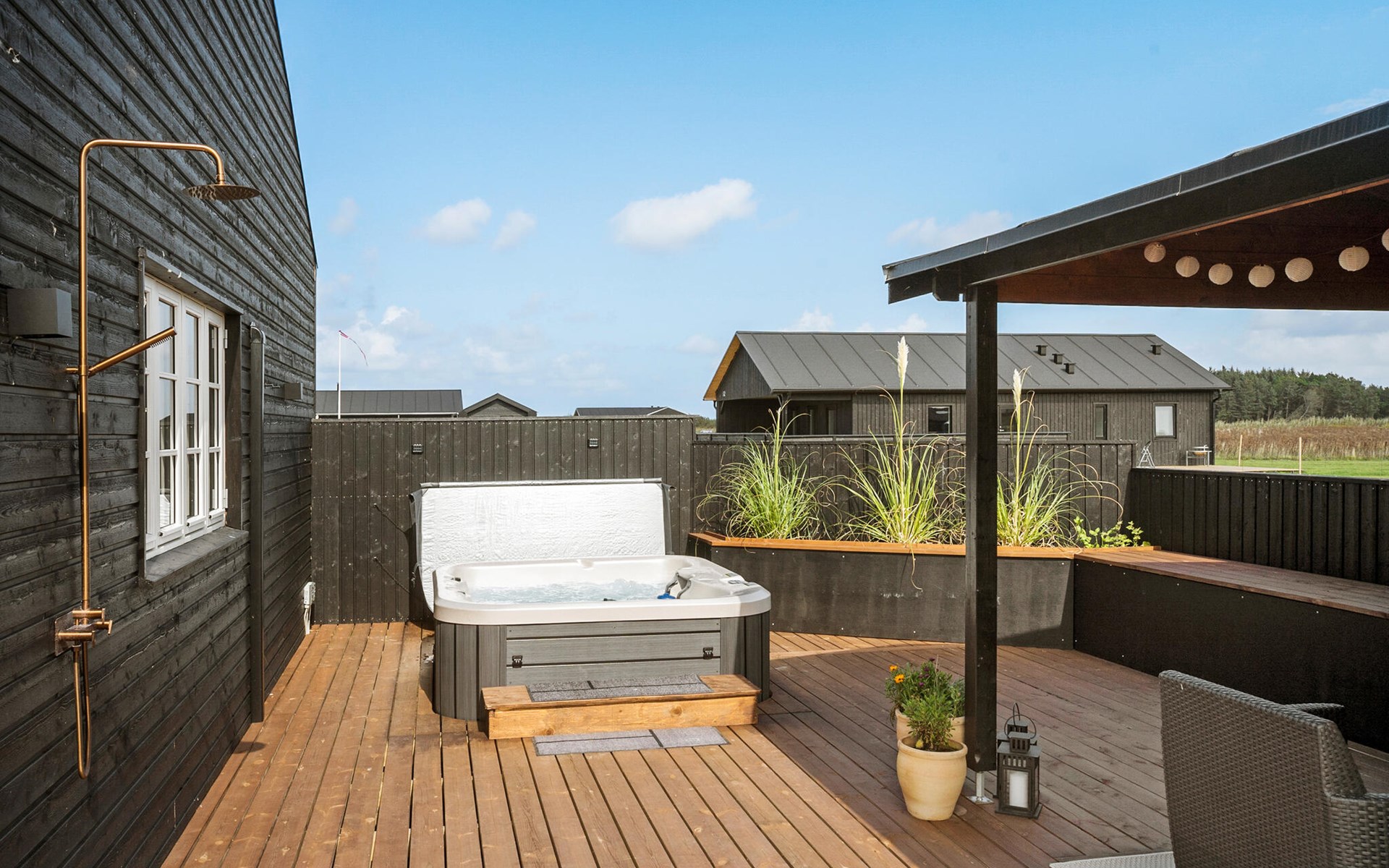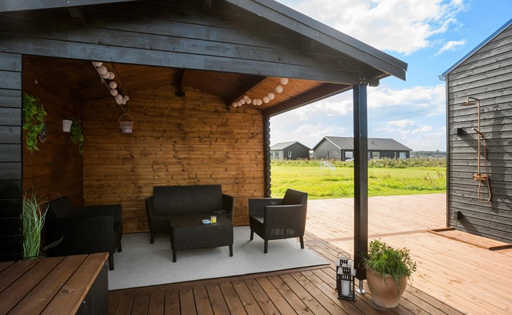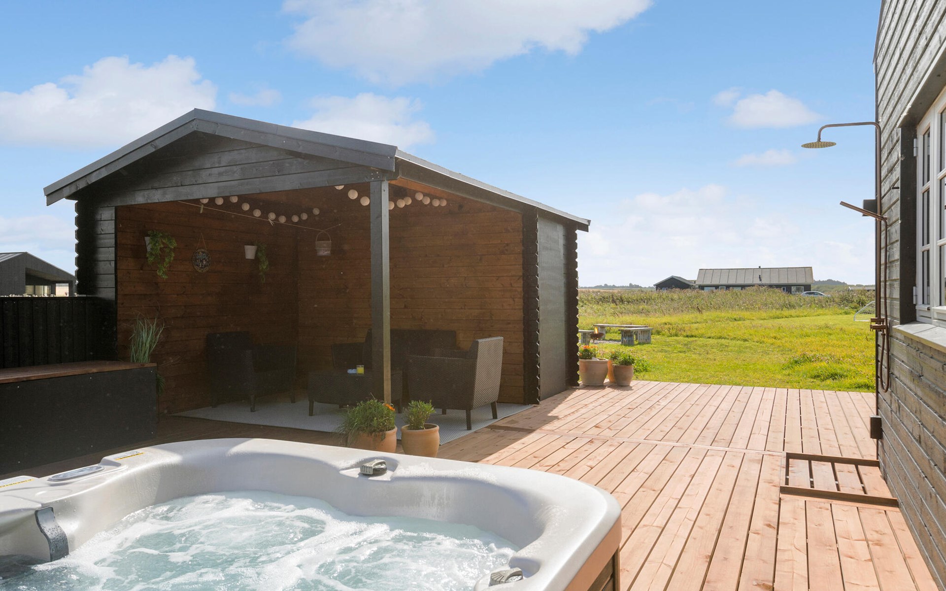 Het houten terras met bubbelbad en buitendouche biedt je een oase van ontspanning, perfect voor sterrennachten of verfrissende momenten na een dag op het strand. Een overdekt terras nodigt je uit om te genieten van de frisse lucht, zelfs bij wisselvallig weer.