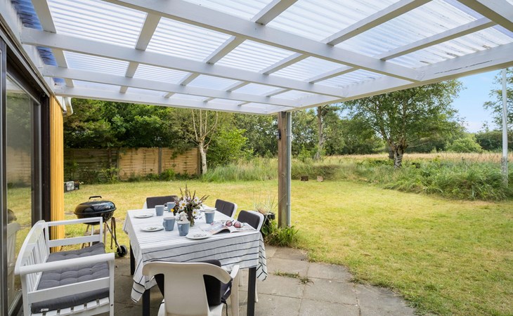 In de zomermaanden kun je vanuit de woonkamer door de grote terrasdeur naar buiten stappen, waar de kinderen een goede plek vinden om te spelen en de familie een gezellige plek om te zonnebaden in de namiddag. Geniet van het uitzicht op zee vanaf het terras.