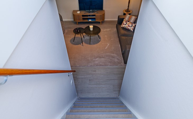 Vanuit de woonkamer heb je toegang tot een balkon van circa 8 m². Op de begane grond is een slaapkamer met een tweepersoons boxspring (180x200cm) aanwezig, samen met een badkamer met inloopdouche en wastafel.
