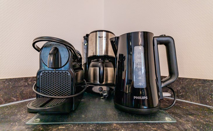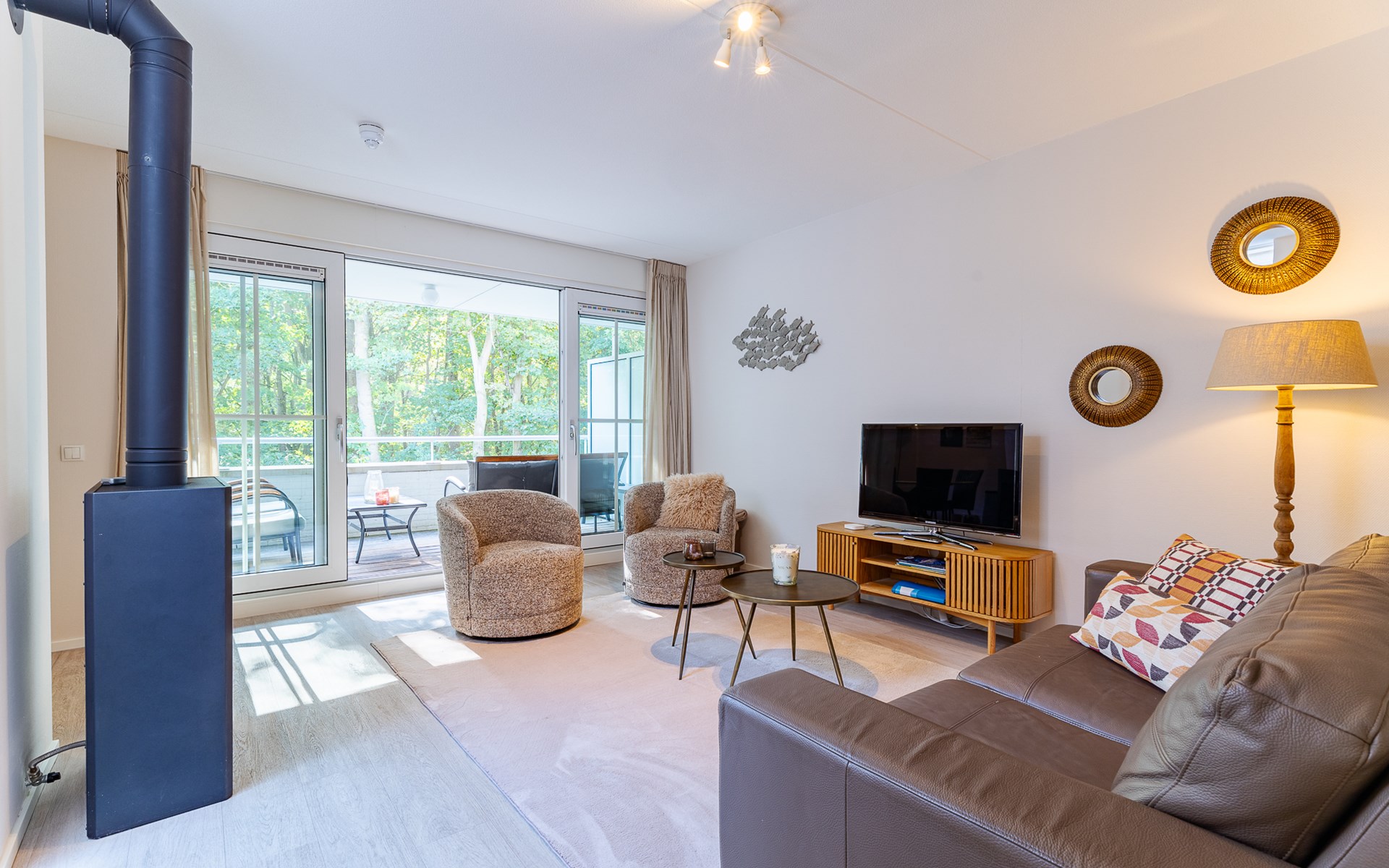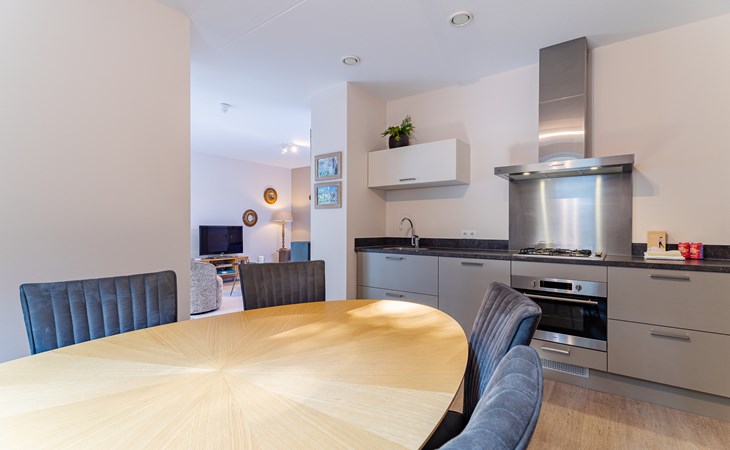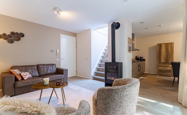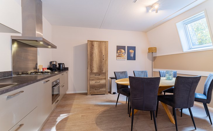 De ruime en lichte woonkamer is ingericht met comfortabele zitplaatsen en een sfeervolle gashaard, ideaal om na een dag buiten te ontspannen. De open keuken is van alle gemakken voorzien, zoals een Nespresso-apparaat, combi-magnetron, kookplaat en vaatwasser. Aangrenzend bevindt zich een eethoek waar je gezellig kunt dineren.