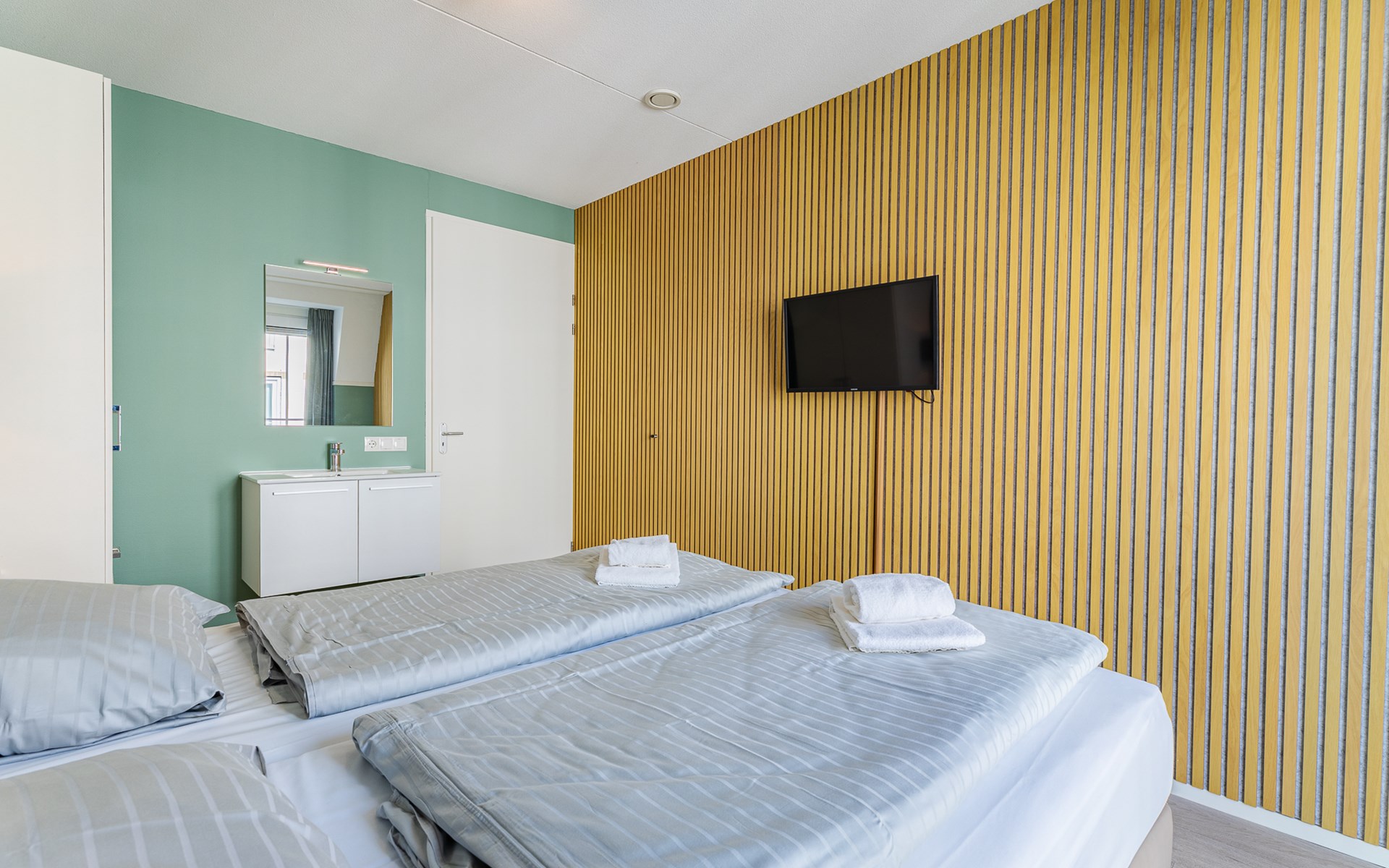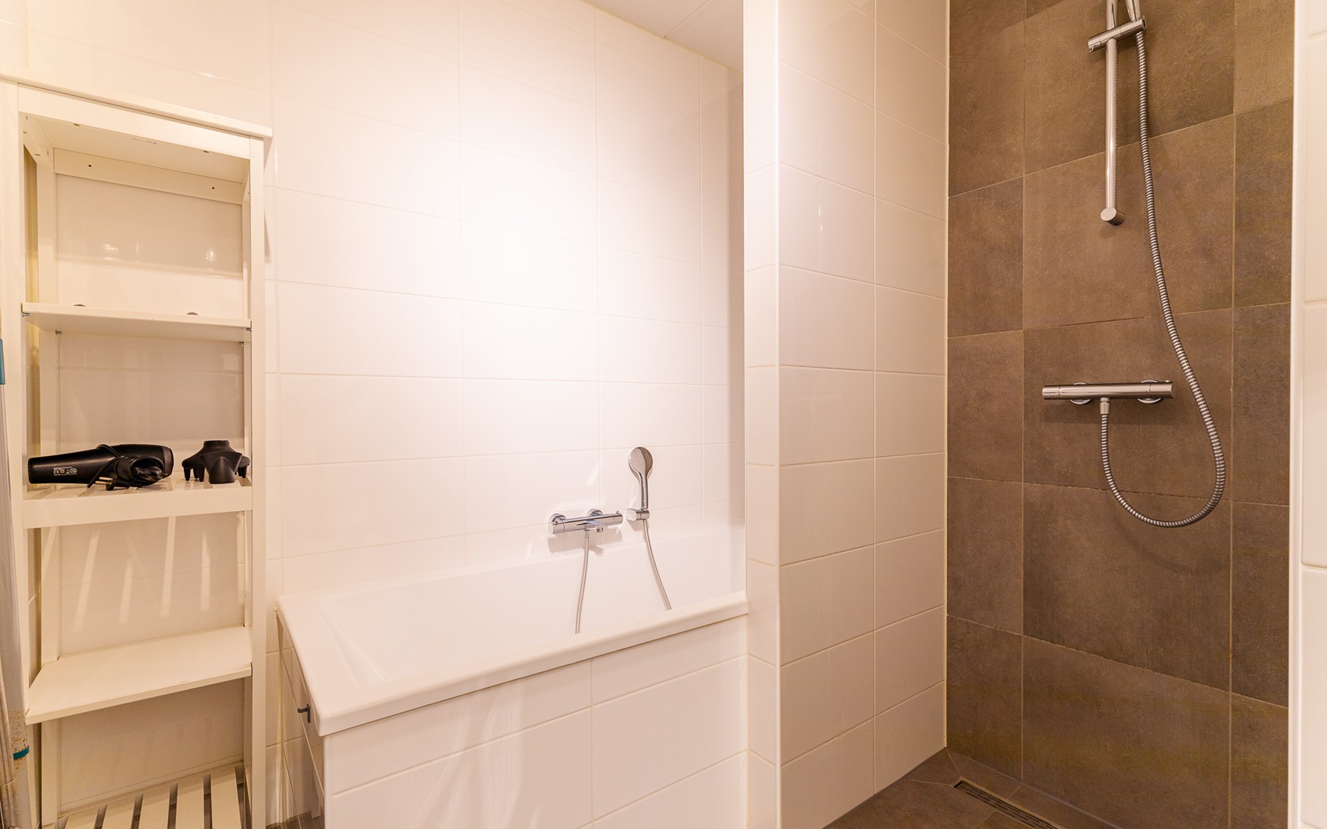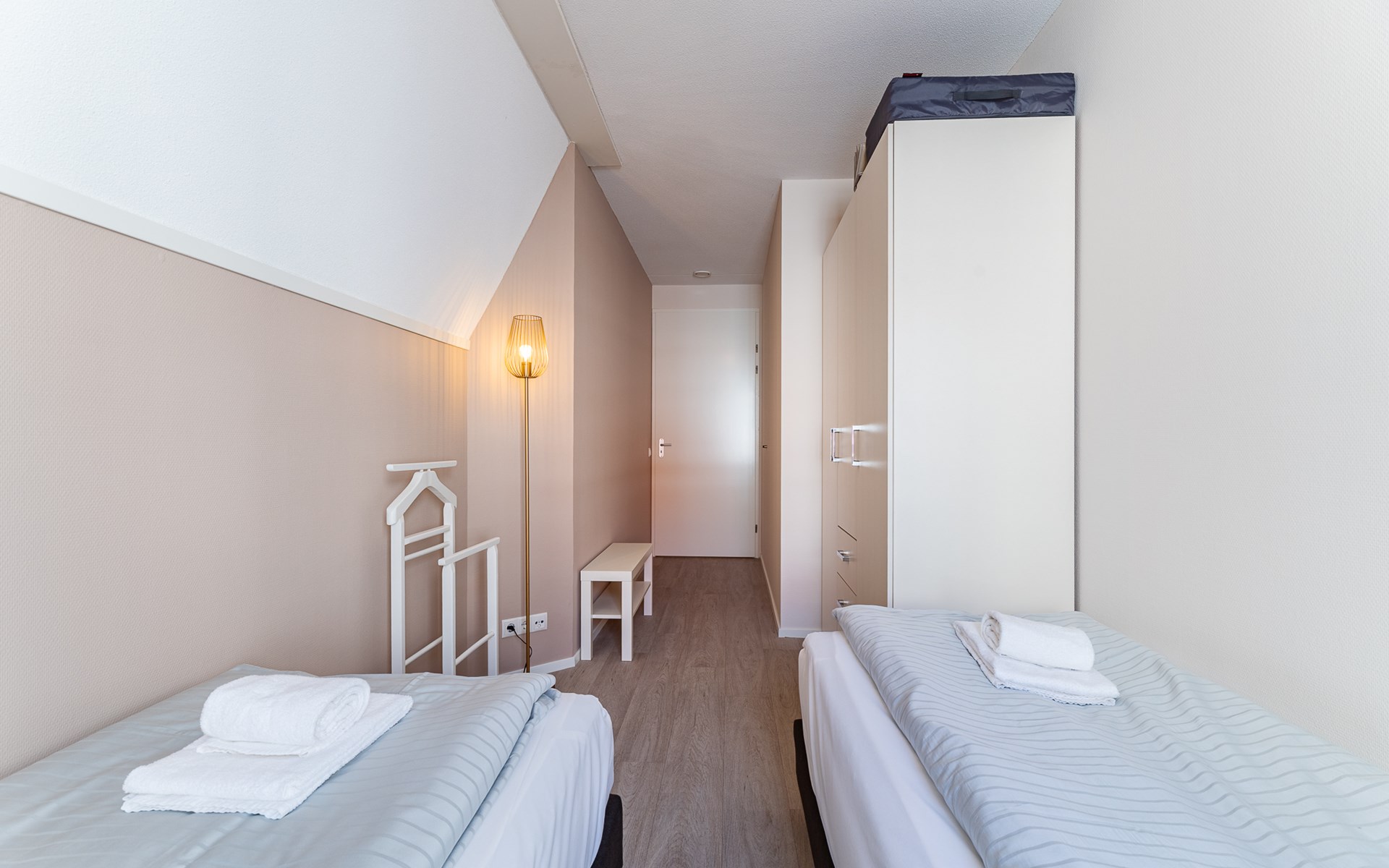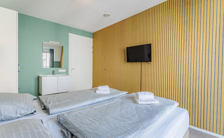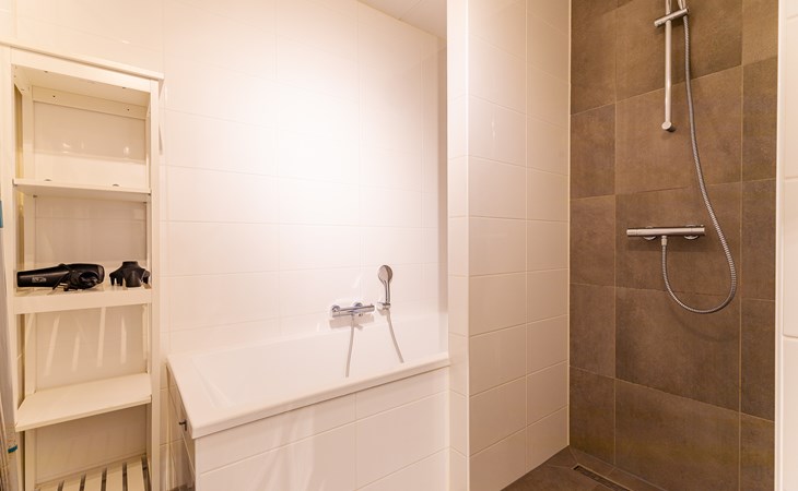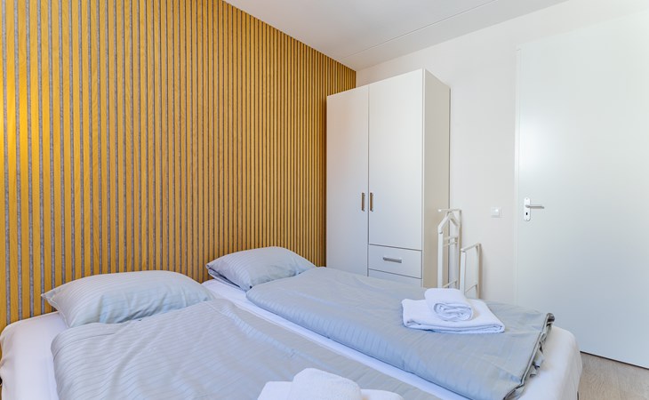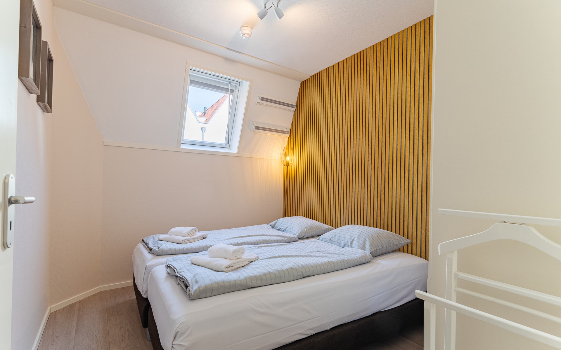 Op de eerste verdieping bevinden zich twee slaapkamers met elk twee eenpersoonsboxsprings (90x200cm) en een luxe tweede badkamer met ligbad, inloopdouche, dubbele wastafel en een toilet. Het ruime dakterras van circa 42 m² biedt volop ruimte om te zonnen en te genieten van de buitenlucht.