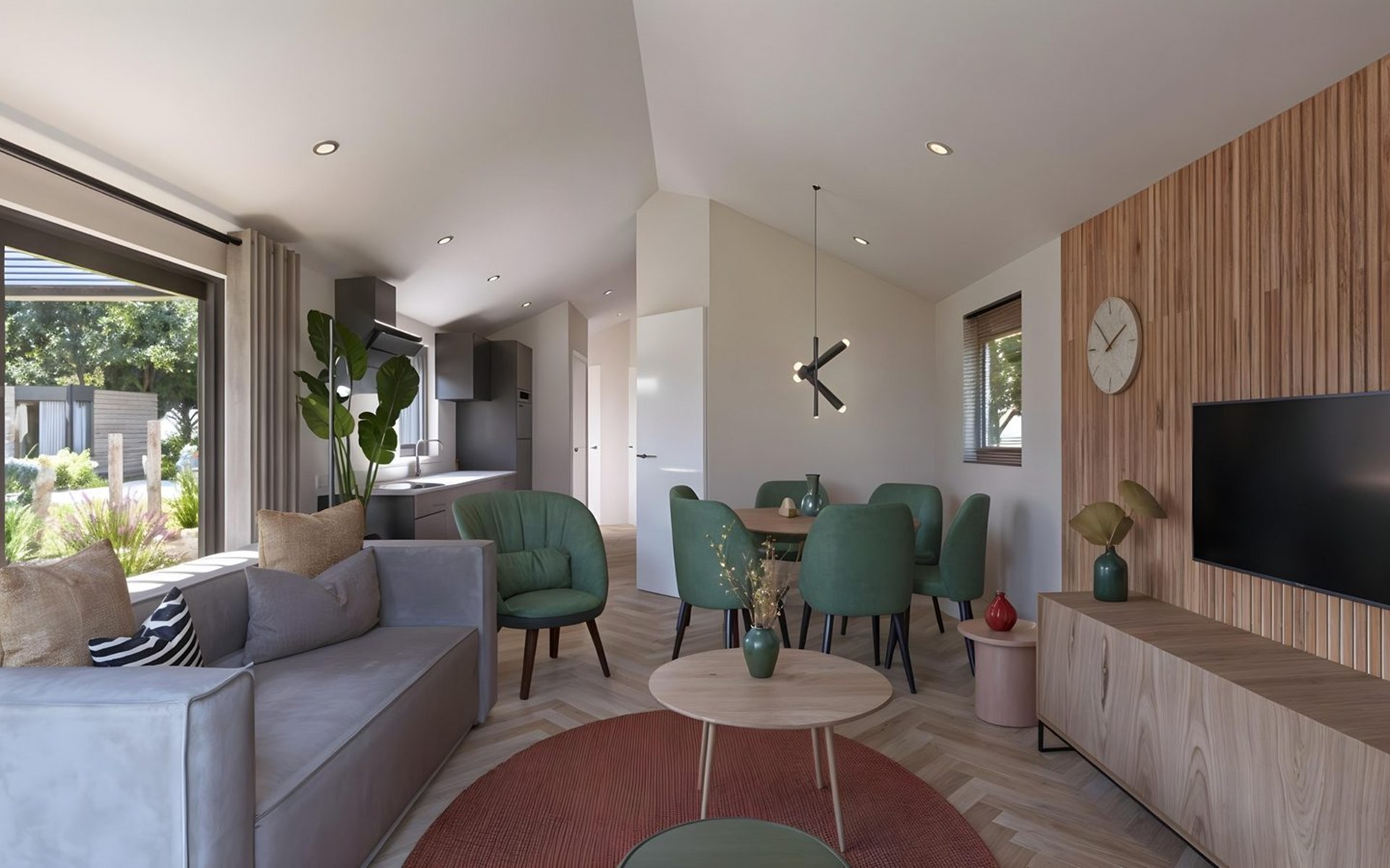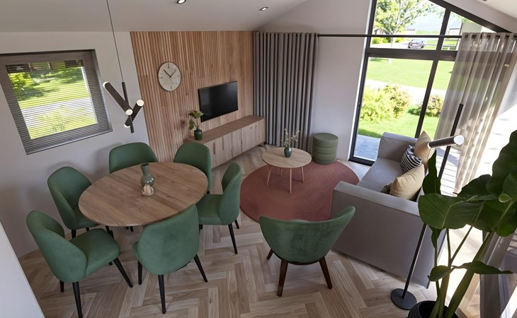 Bij het betreden van de Lodge wordt u begroet door een warme en uitnodigende sfeer. De woonkamer is voorzien van comfortabele zitplaatsen, ideaal om te ontspannen na een actieve dag. Geniet van een goed boek, bekijk uw favoriete film of deel boeiende gesprekken met uw dierbaren in deze gezellige ruimte.