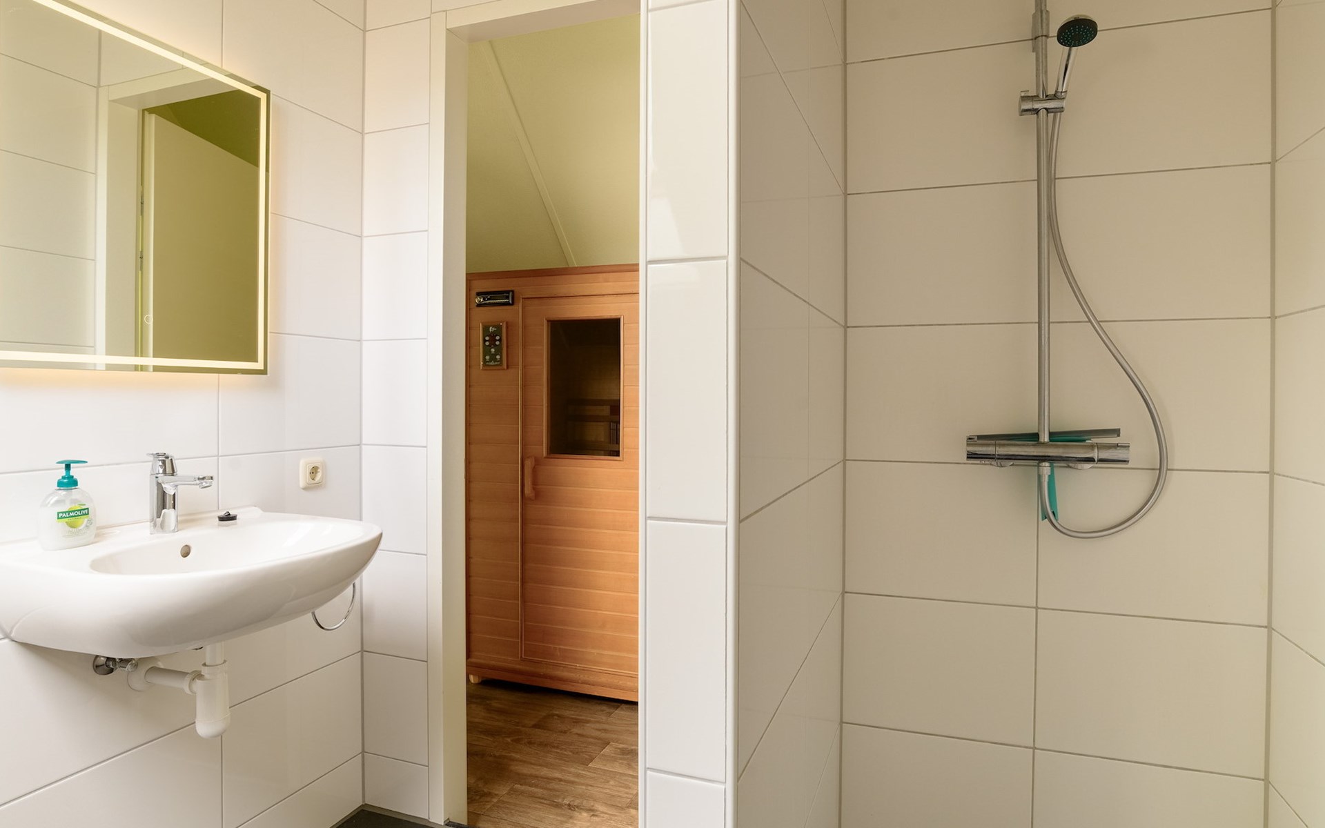 De badkamer is uitgerust met een inloopdouche en een wastafel. Er is tevens een apart toilet aanwezig. Daarnaast vind je op deze verdieping een infraroodsauna voor twee personen.