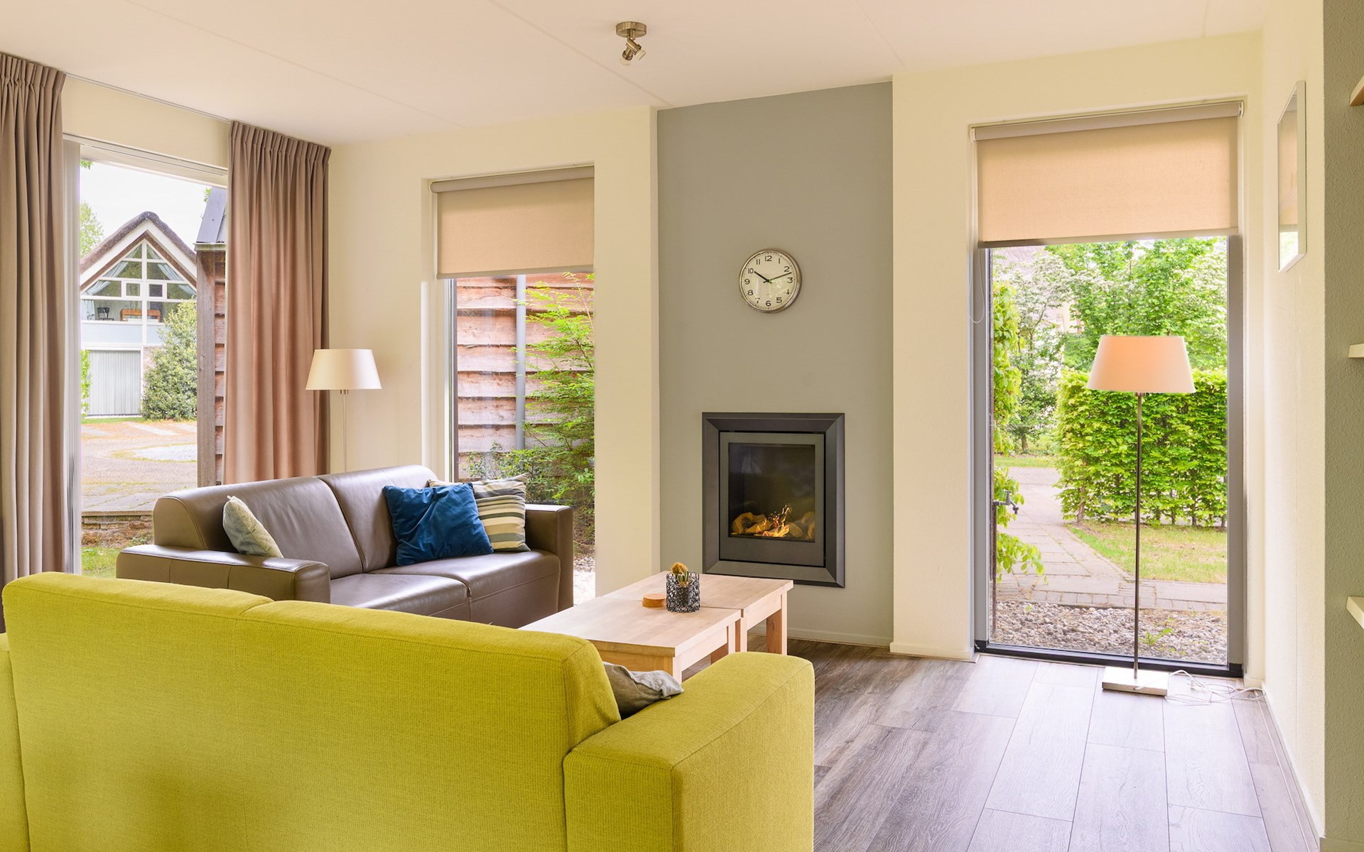 De woonkamer heeft een brede schuifpui naar het terras en beschikt over een ruime zithoek, sfeerhaard, televisie en een radio met cd-speler. Aangrenzend vind je de open keuken met de eethoek en openslaande deuren naar het tweede terras. De keuken is voorzien van onder andere een koel-vriescombinatie, vaatwasser, combimagnetron, Senseo apparaat en filterkoffiezetapparaat.