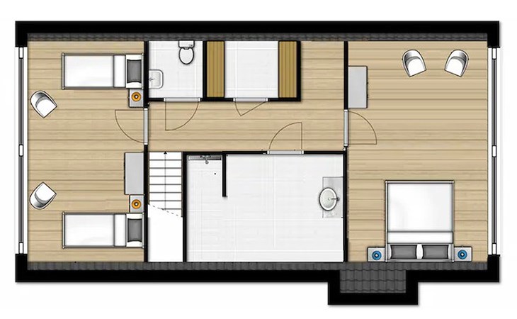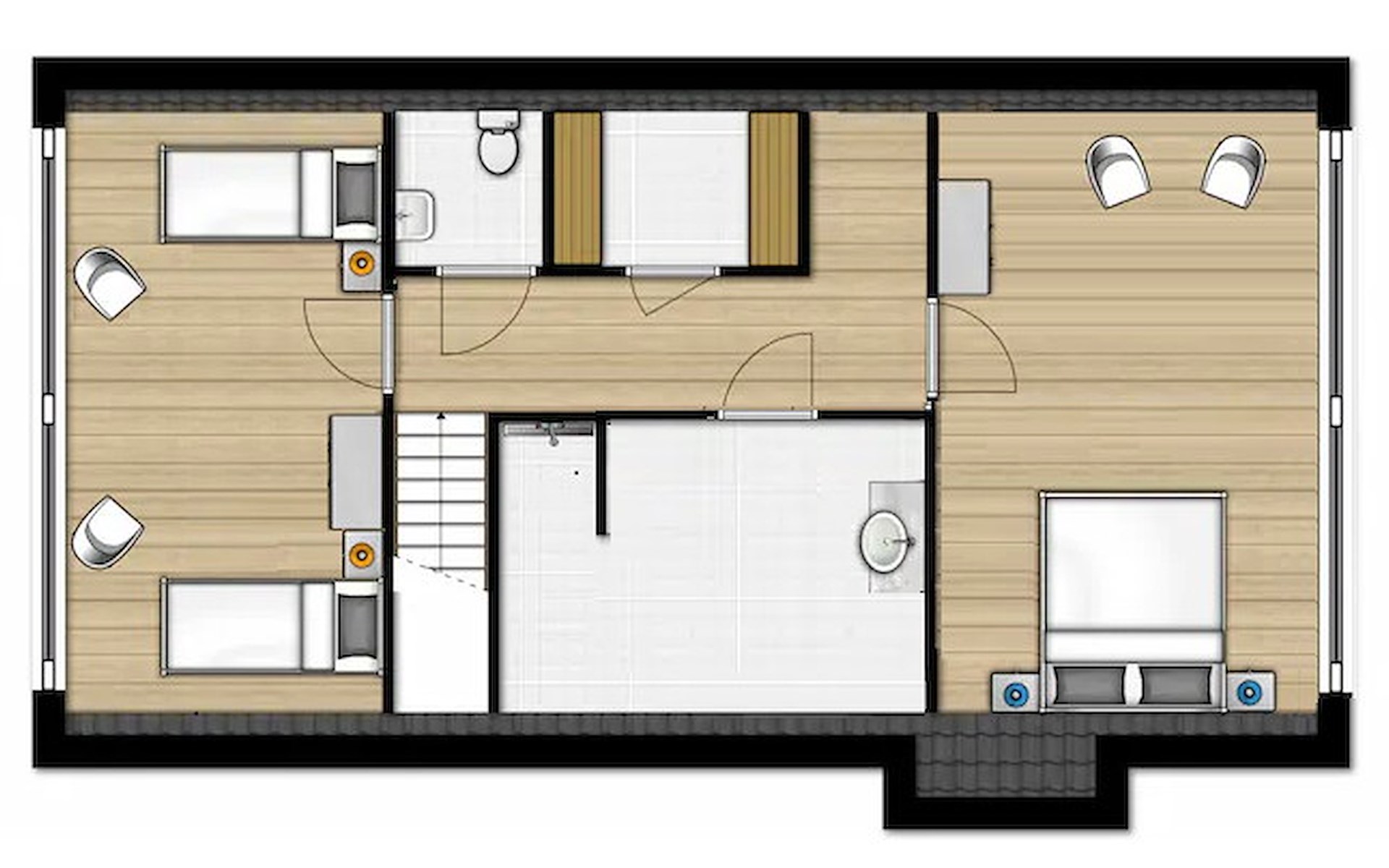 Verder beschikt de villa over een wasmachine en bevindt zich op begane grond een apart toilet. Op de eerste verdieping bevinden zich 2 slaapkamers met elk 2 éénpersoons boxsprings.