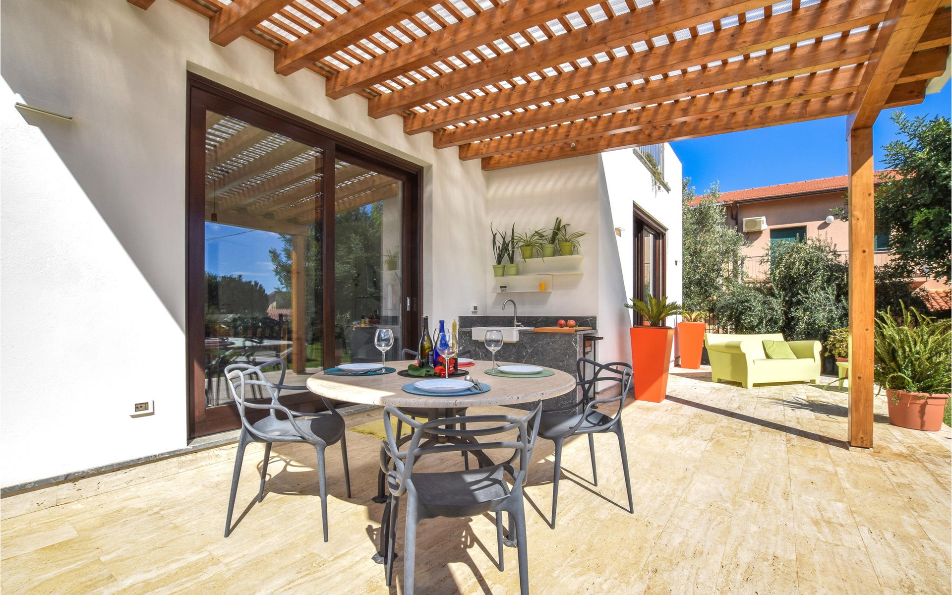 U kunt ook heerlijke uren doorbrengen in de tuin, waar een privézwembad op u wacht en waar u alleen maar in hoeft te springen. Waarom niet samen koken in de zomerkeuken en uw favoriete gerechten bereiden en er buiten van genieten.