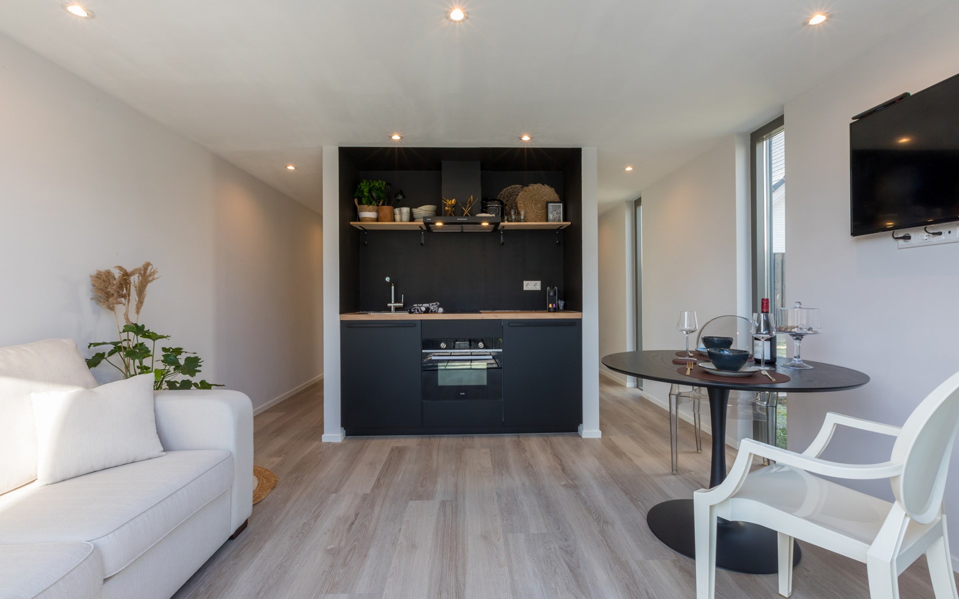 Deze luxe, gelijkvloerse studio is geschikt voor 2 personen en huisdiervrij. De accommodatie beschikt over wifi. De indeling is bijzonder te noemen. Aan de voorzijde van het huisje bevindt zich de woonkamer en de keuken. Middels een lange gang kom je bij de tweepersoons- slaapkamer met kastenwand. In het midden van het huisje ligt de badkamer. De keuken beschikt over een combi-magnetron, een toaster, een koelkast met vriesvakje, een Nespresso en een waterkoker. De vakantiewoning heeft een parkeerplaats beschikbaar op eigen terrein.