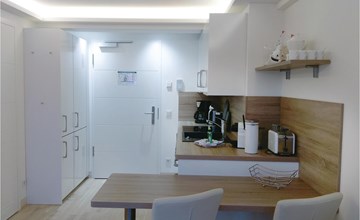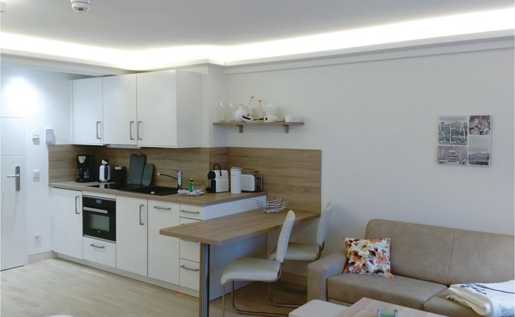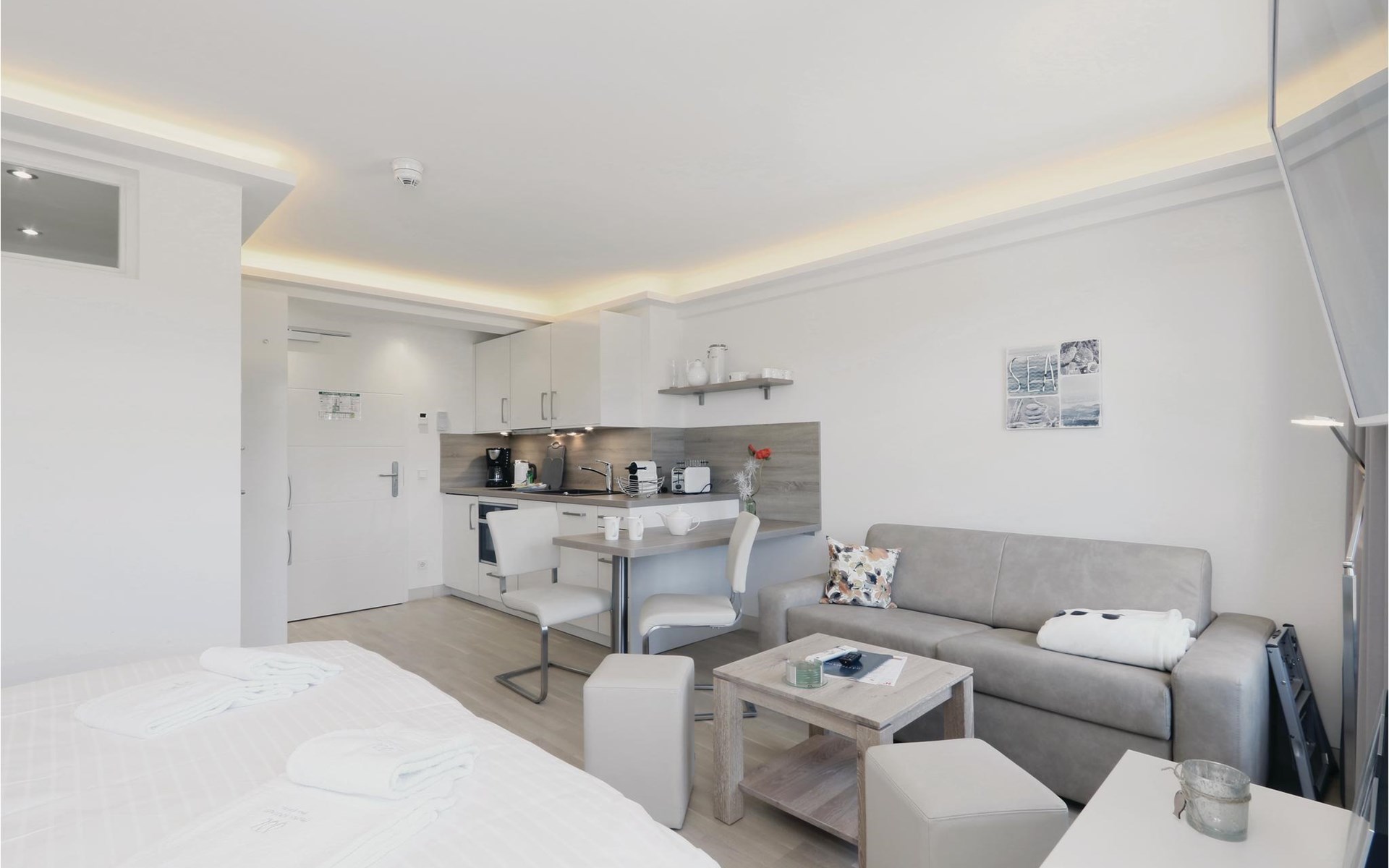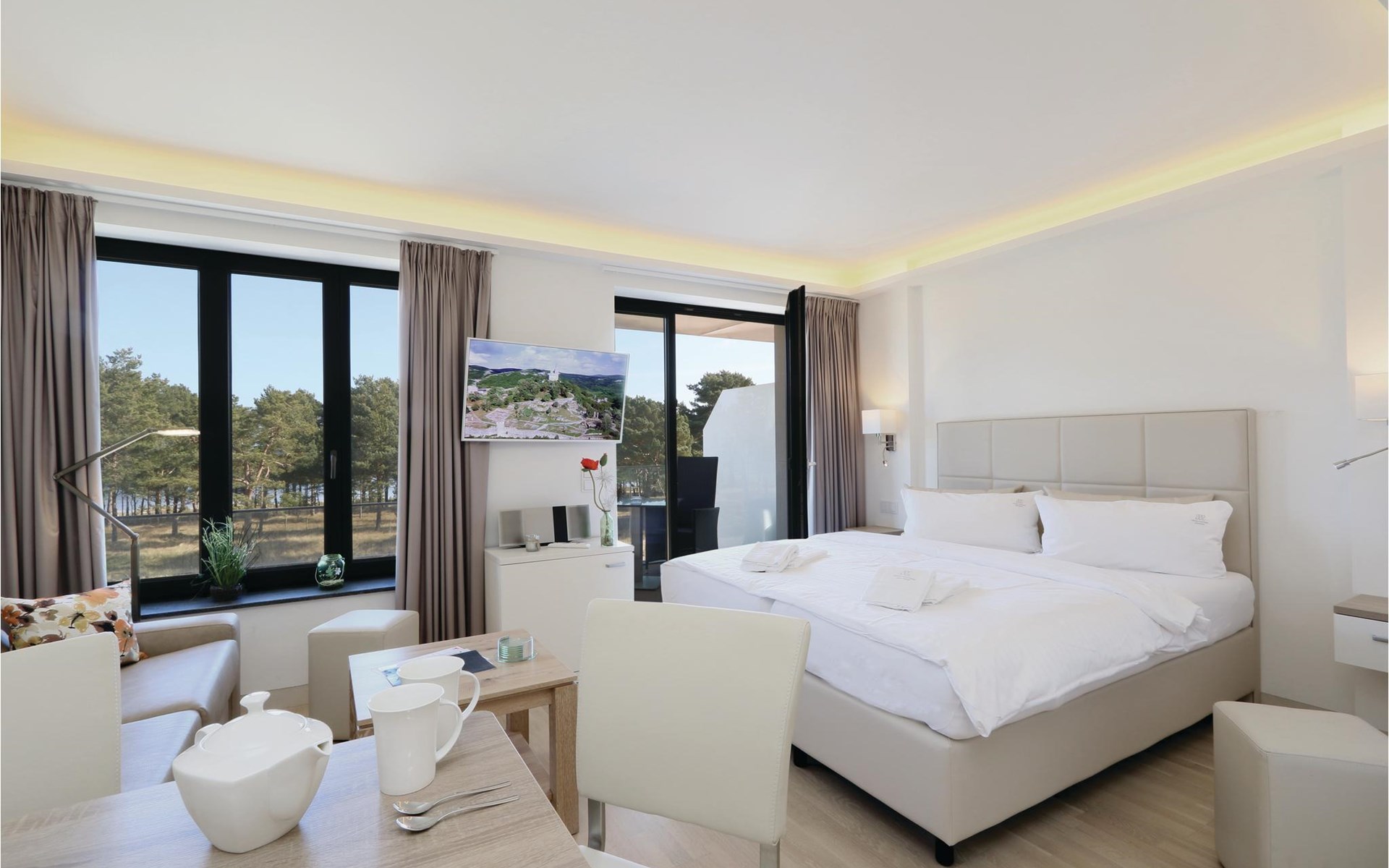De kleine studio's met groot effect zijn perfect voor een vakantie met z'n tweeën. Vanaf de 3e verdieping heb je een prachtig uitzicht op de tuin, het dennenbos en de glinsterende golven van de Oostzee. Op 28 m² kun je de perfecte vakantie aan de Oostzee doorbrengen in dit elegante en moderne appartement. Een kleine kitchenette is beschikbaar als je geen gebruik wilt maken van een van de restaurants en cafés in het vakantiecomplex, maar je eigen diner of ontbijt wilt bereiden en misschien wilt genieten op het prachtige kleine balkon dat bij het appartement hoort. Grote panoramische ramen brengen veel licht in de lichte studio en het hoogwaardige boxspringbed staat garant voor een goede nachtrust. De hoogwaardige bank kan in een paar eenvoudige stappen worden omgebouwd tot een bijzonder comfortabele extra slaapmogelijkheid (slaapoppervlak: 1,40 x 2,00 m).