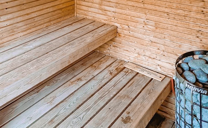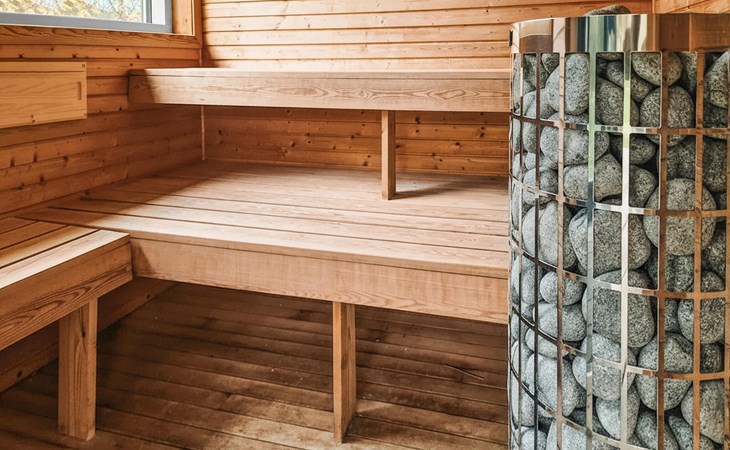 Op het terras heb je toegang tot je eigen kleine wellnessruimte in het aangrenzende bijgebouw met een moderne sauna en overdekte buitenwhirlpool/Fins houten bad (beschikbaar in de zomermaanden). Hier kun je in het warme water zitten en luisteren naar de geluiden van de natuur, of de zon nu schijnt of de regen zachtjes op het dak valt.