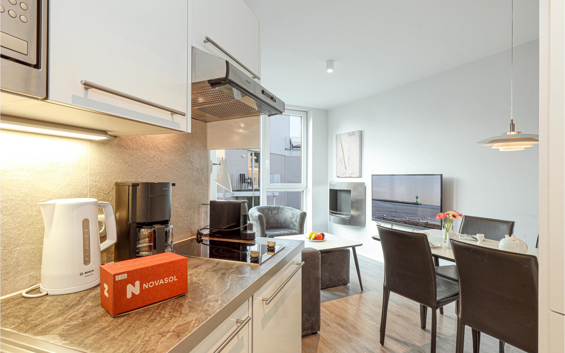Het woongedeelte heeft een glazen erker, waardoor de vakantiewoning bijzonder licht is. De kitchenette, slaapbank en bio-ethanol open haard bevinden zich ook hier. Hierdoor baadt je vakantiewoning in een aangenaam licht. Vanuit de aparte slaapkamer kom je op het balkon. Hier kun je samen ontbijten of gewoon genieten van de frisse Oostzeelucht.