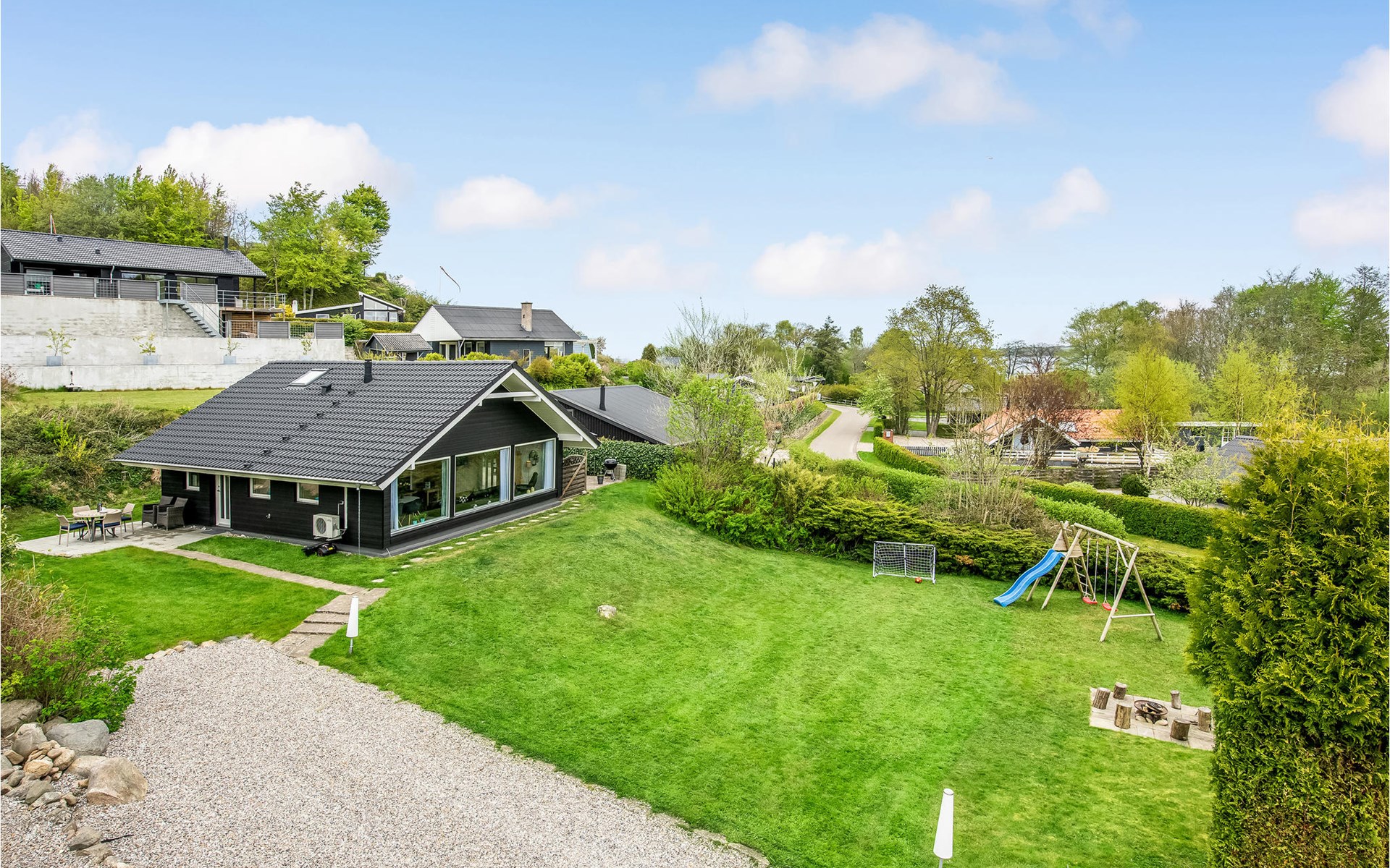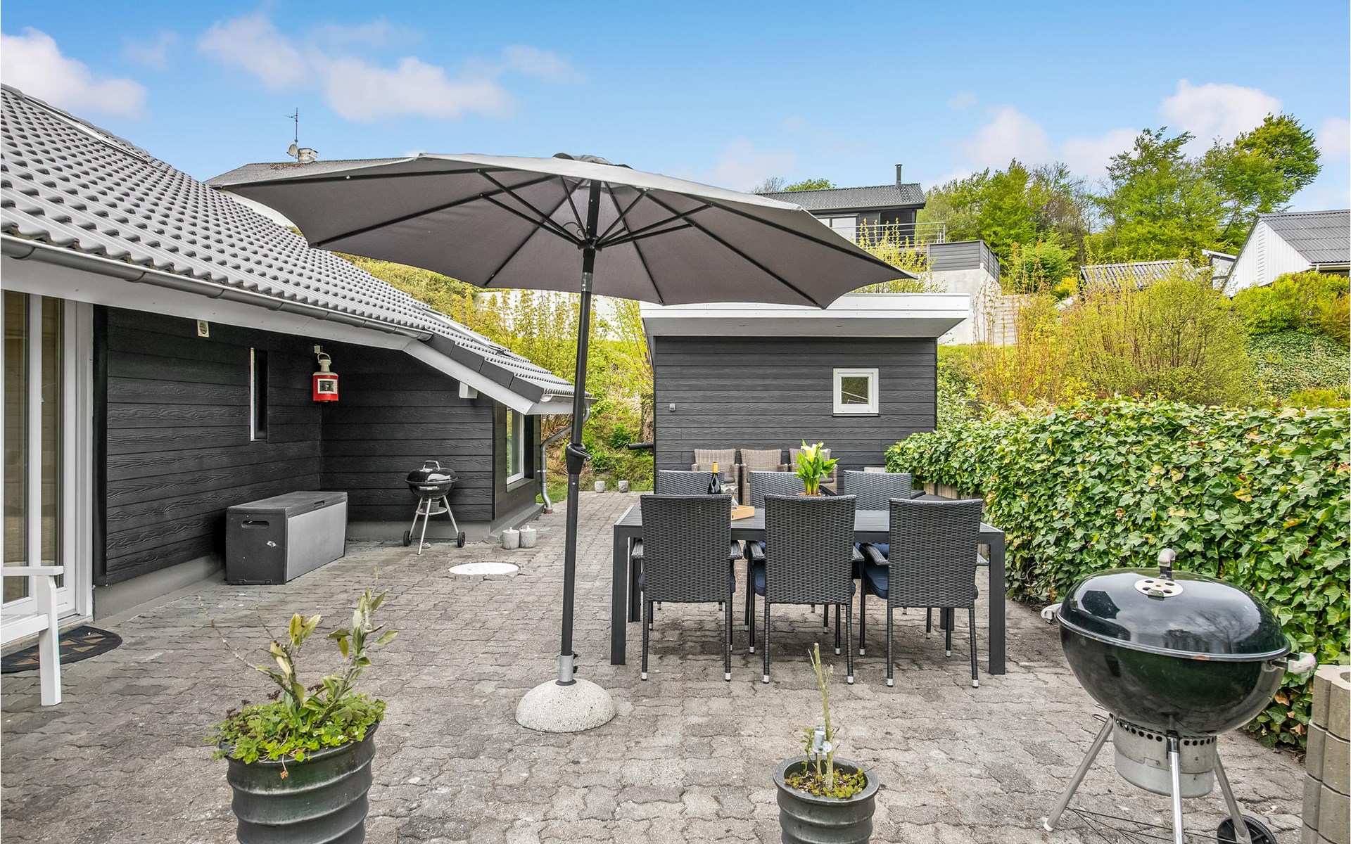De jongste gezinsleden zullen dol zijn op de tuin, waar veel ruimte is om te spelen. Hier staat ook een speeltoren met schommels en glijbanen, waar de kinderen vele uren kunnen doorbrengen. Buiten vindt u ook een heerlijk terras met tuinmeubelen, parasol en barbecue. De tuin heeft ook een open haard waar u zich bij het vuur kunt opwarmen en stokbrood kunt bakken. Hier vindt u alles wat u nodig heeft om de familie bij elkaar te brengen voor een gezellige barbecue op warme zomeravonden.