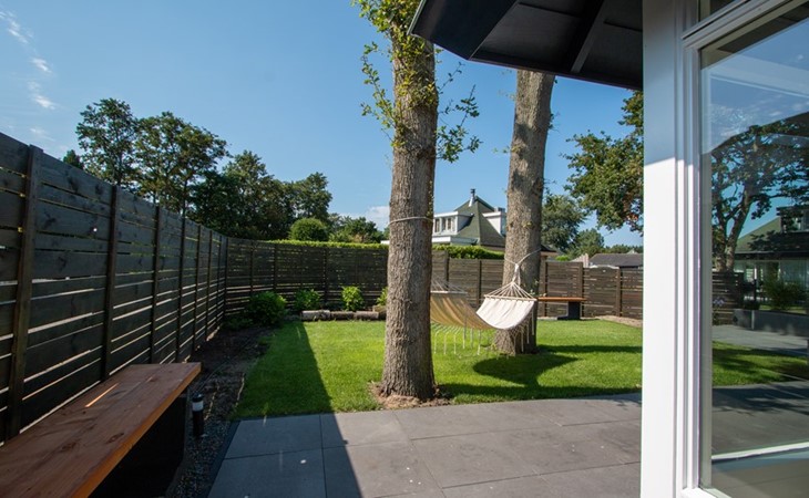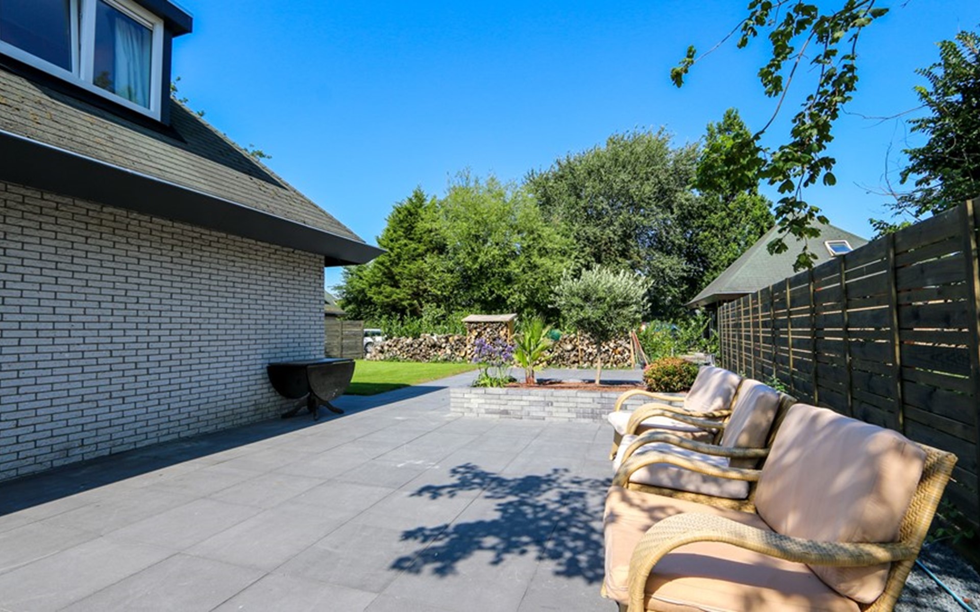 De tuin is geheel rondom de woning aangelegd zodat er bij mooi weer de hele dag zon is. Aan de voorzijde is een grasveldje waar de kinderen en de hond heerlijk kunnen spelen. Ook is er de mogelijkheid om te relaxen op een van de twee terrassen.