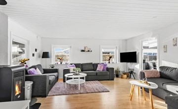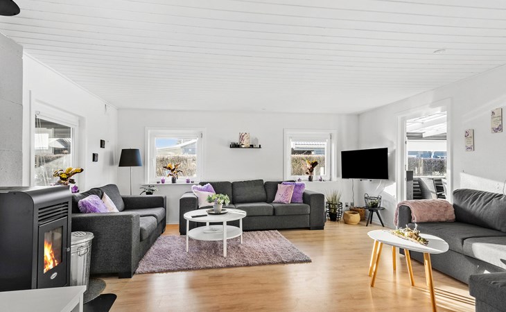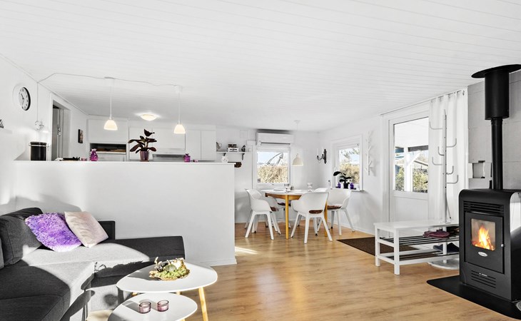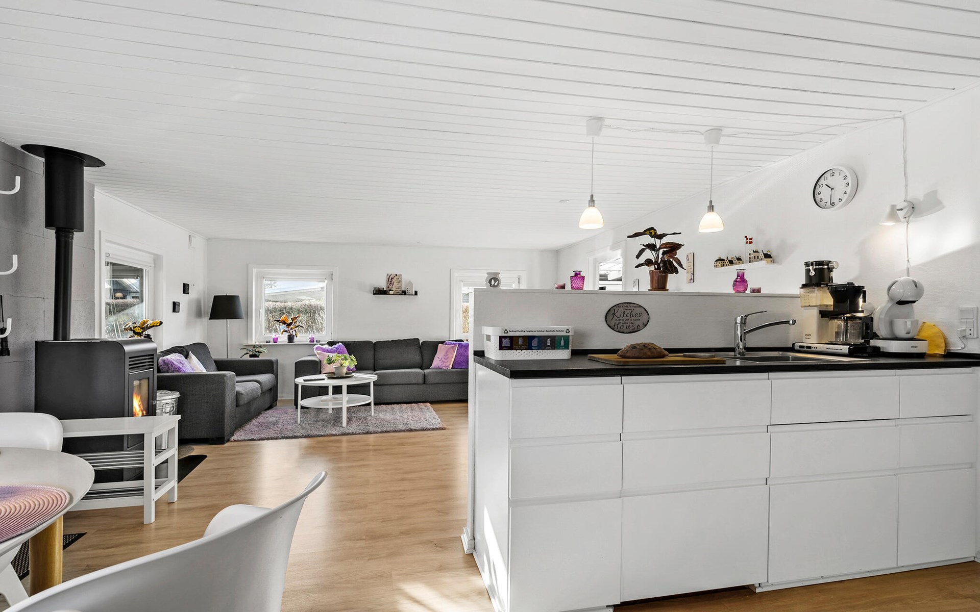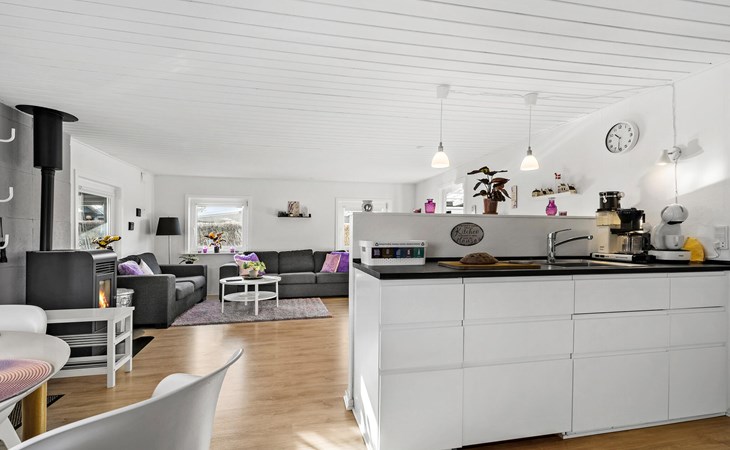 De grote en licht ingerichte woonkamer met open keuken maakt een mooie, moderne indruk. Maak het uzelf gemakkelijk in de gestoffeerde meubels, bereid uw lekkernijen in de keuken en geniet samen van het diner aan de eettafel.