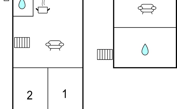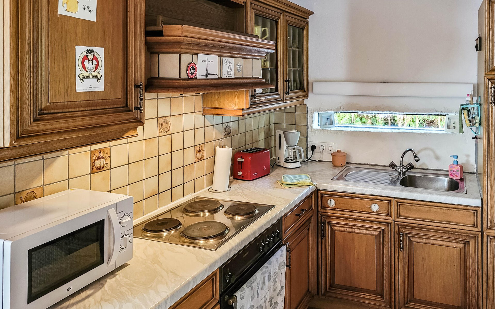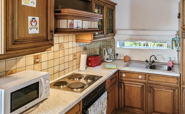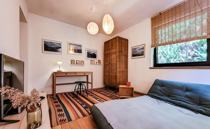 De woon/eetkamer en het terras zijn verhoogd zodat je een prachtig uitzicht hebt over de tuin. De vloer is betegeld en voorzien van een groot tapijt, het plafond is van hout. Ruime woon/eetkamer in een romantische, rustieke stijl. Twee slaapkamers, WC en keuken bevinden zich ook op de begane grond. In de kelder is er een badkamer met bad en douche. De buslijn 93 A is bereikbaar in 3 minuten.
